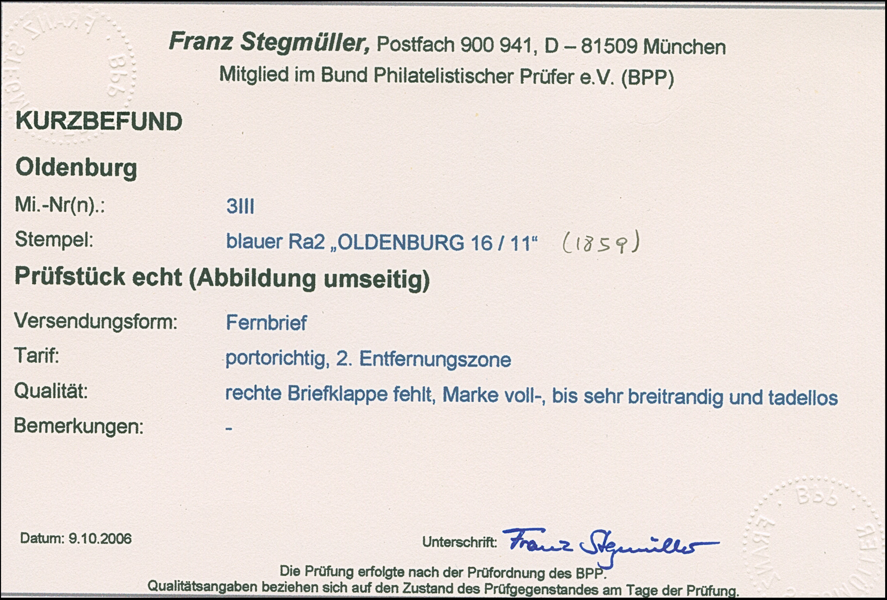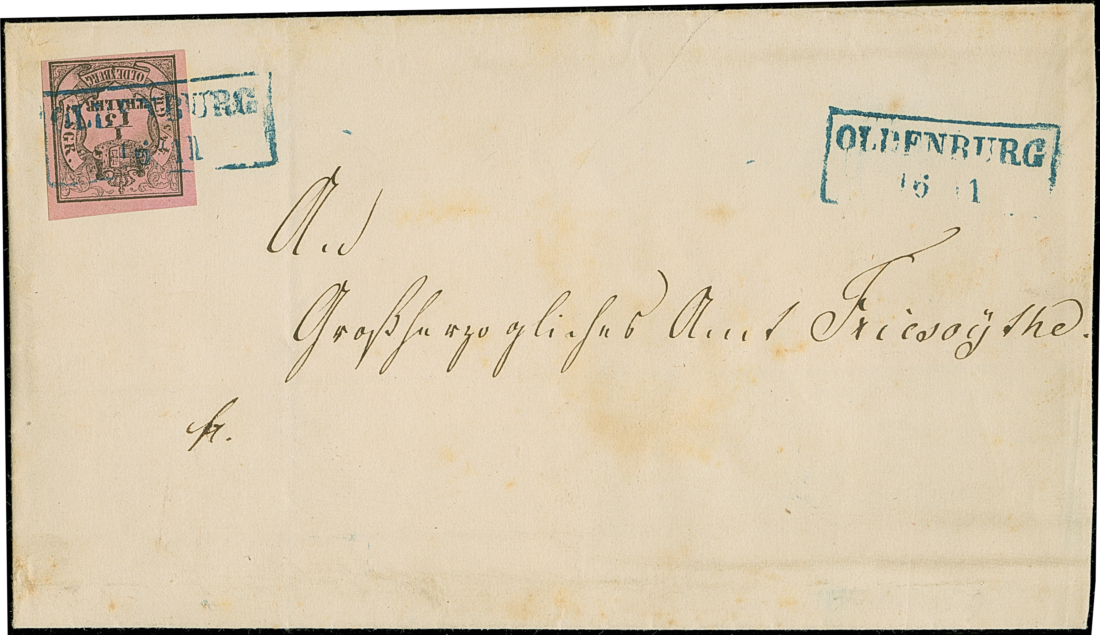 1/15 Th. auf rosa, Type III mit blauem Rahmenstempel “OLDENBURG 16.11” als tarifgerechte Frankatur auf Faltbriefhülle der 2. Entfernungsstufe nach Friesoythe. Die Briefhülle mit fehlender Briefklappe rechts, die farbfrische Marke ist voll- bis breitrandig und in einwandfreier Erhaltung, Kurbefund Stegmüller BPP (2006)