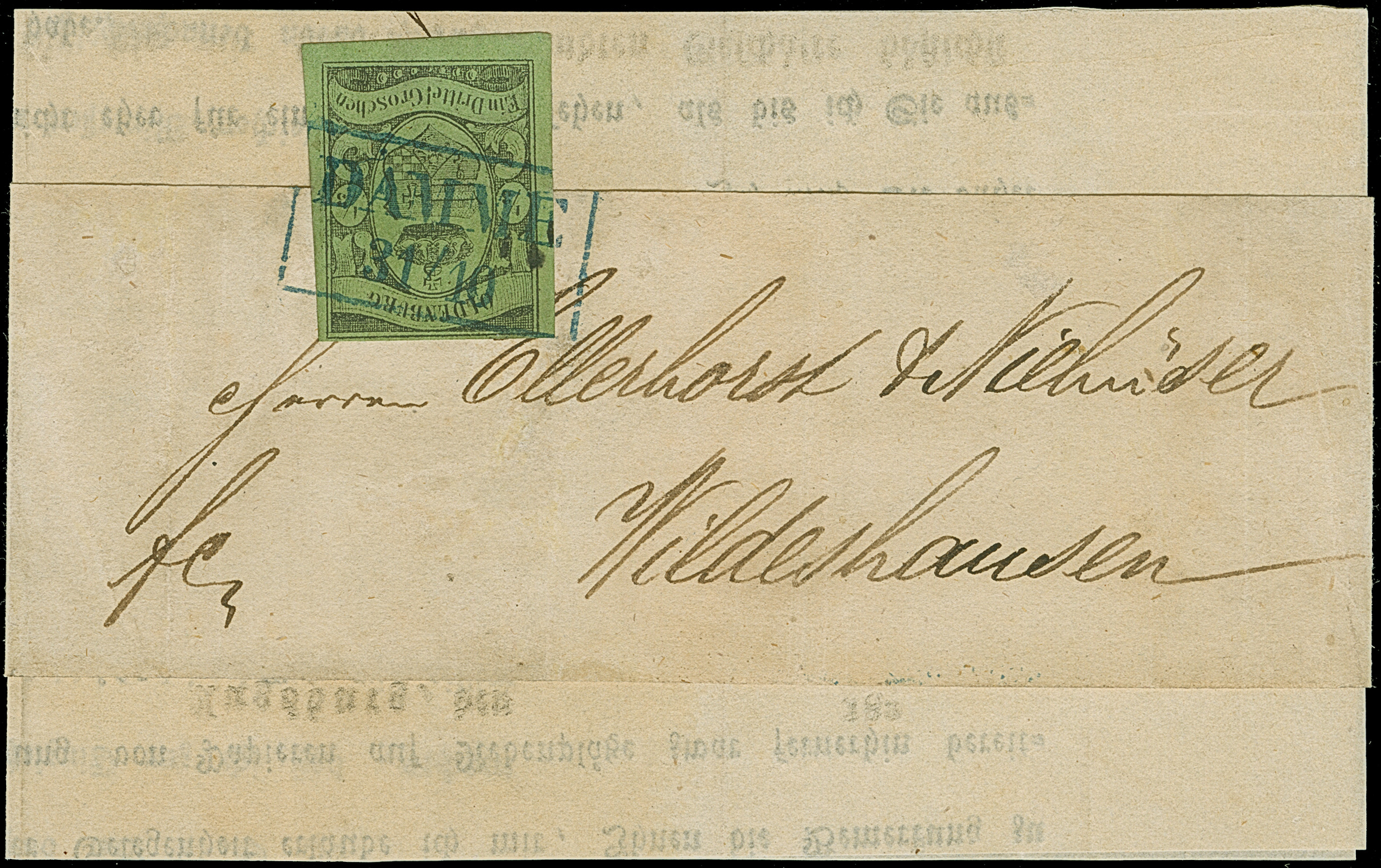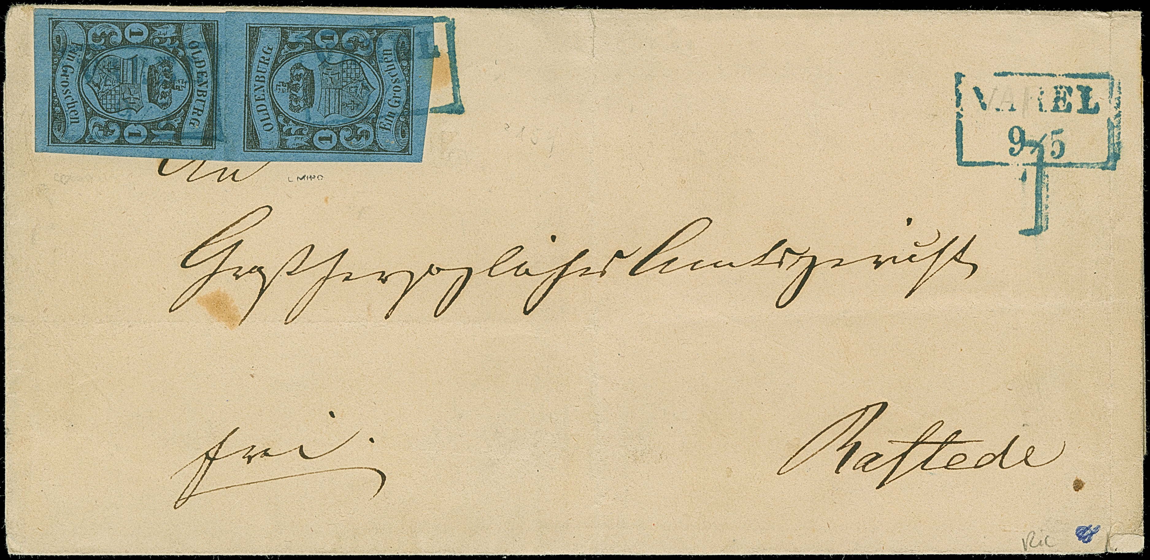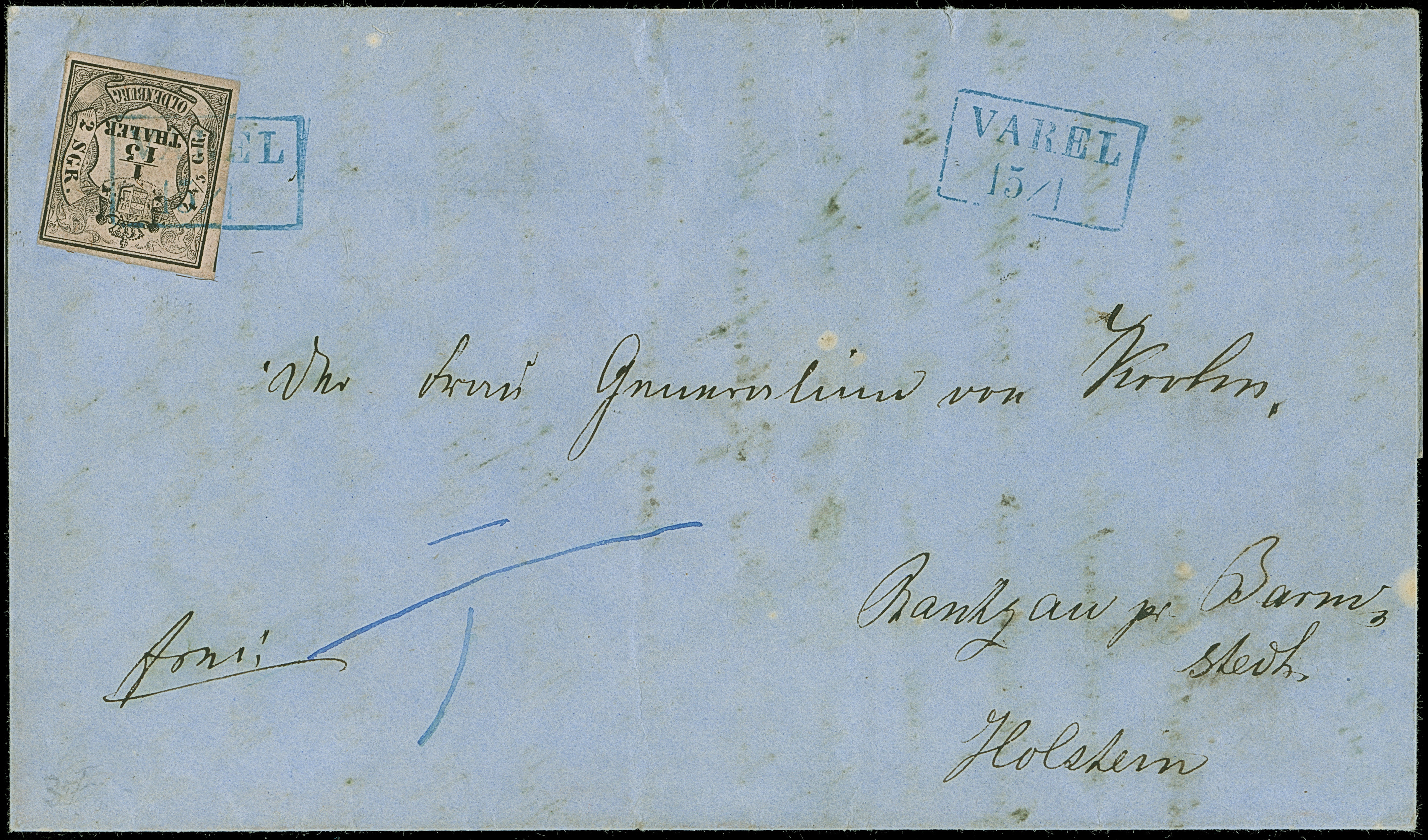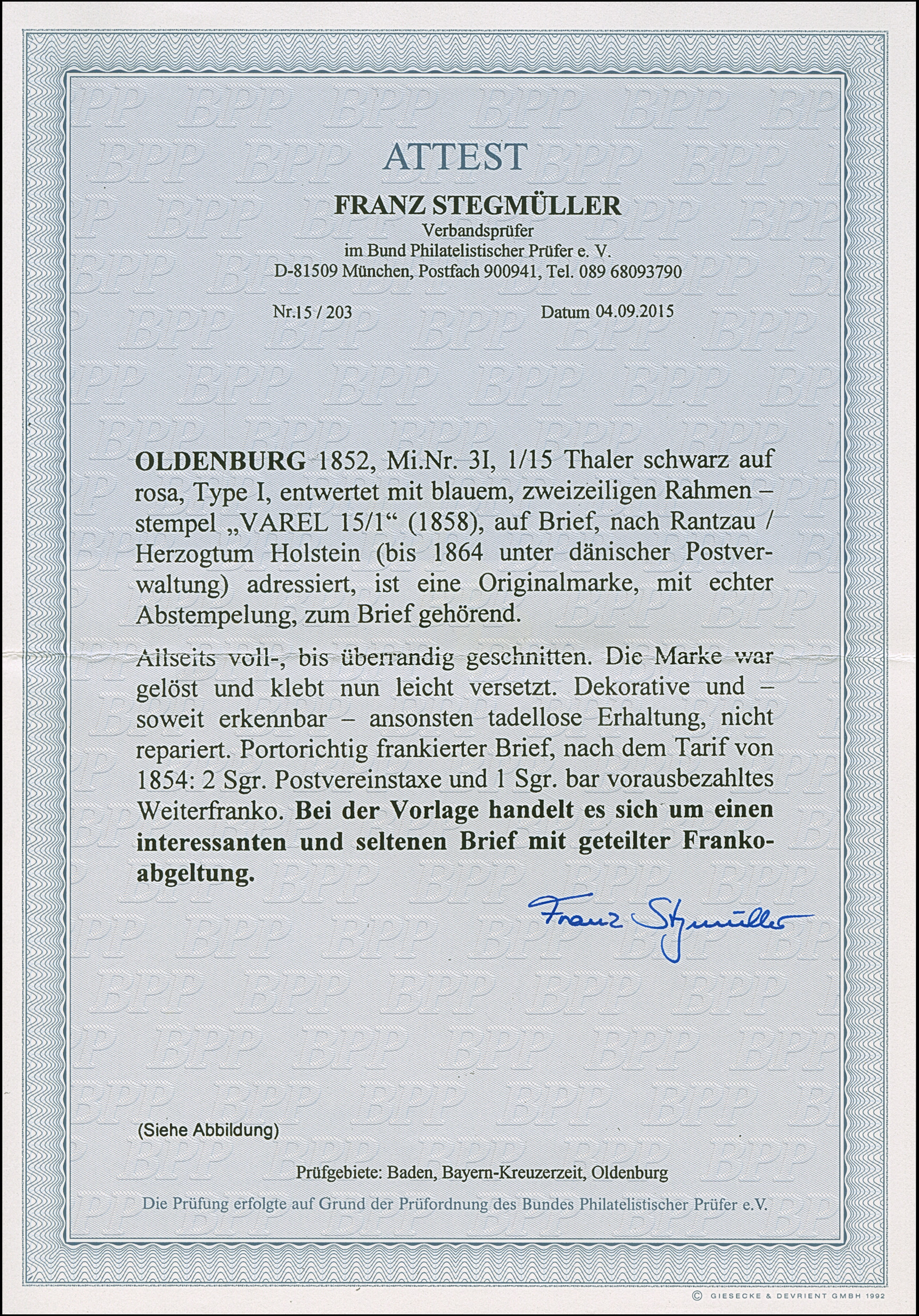 1/15 Th. auf rosa, Type I mit blauem Rahmenstempel “VAREL 15.1.(58)” auf komplettem Faltbrief via Hamburg nach Rantzsau (Herzogthum Holstein), Dänemark. Der Brief ist bis Hamburg mit 2 Sgr. im Postverein frankiert und das Weiterfranco mit blauem Tax-Vermerk “-/1” (Sgr.) vermerkt und ist vom Absender in bar bezahlt worden. Die farbfrische Marke ist allseits voll- bis überrandig sie war gelöst und wurde minimal versetzt wieder aufgeklebt. Sie ist, soweit erkennbar, wie der Faltbrief in einwandfreier Erhaltung. Ein interessanter und seltener Brief mit geteilter Franko-Abgeltung mit Destination Holstein (Dänemark), Fotoattest Stegmüller BPP (2015)
