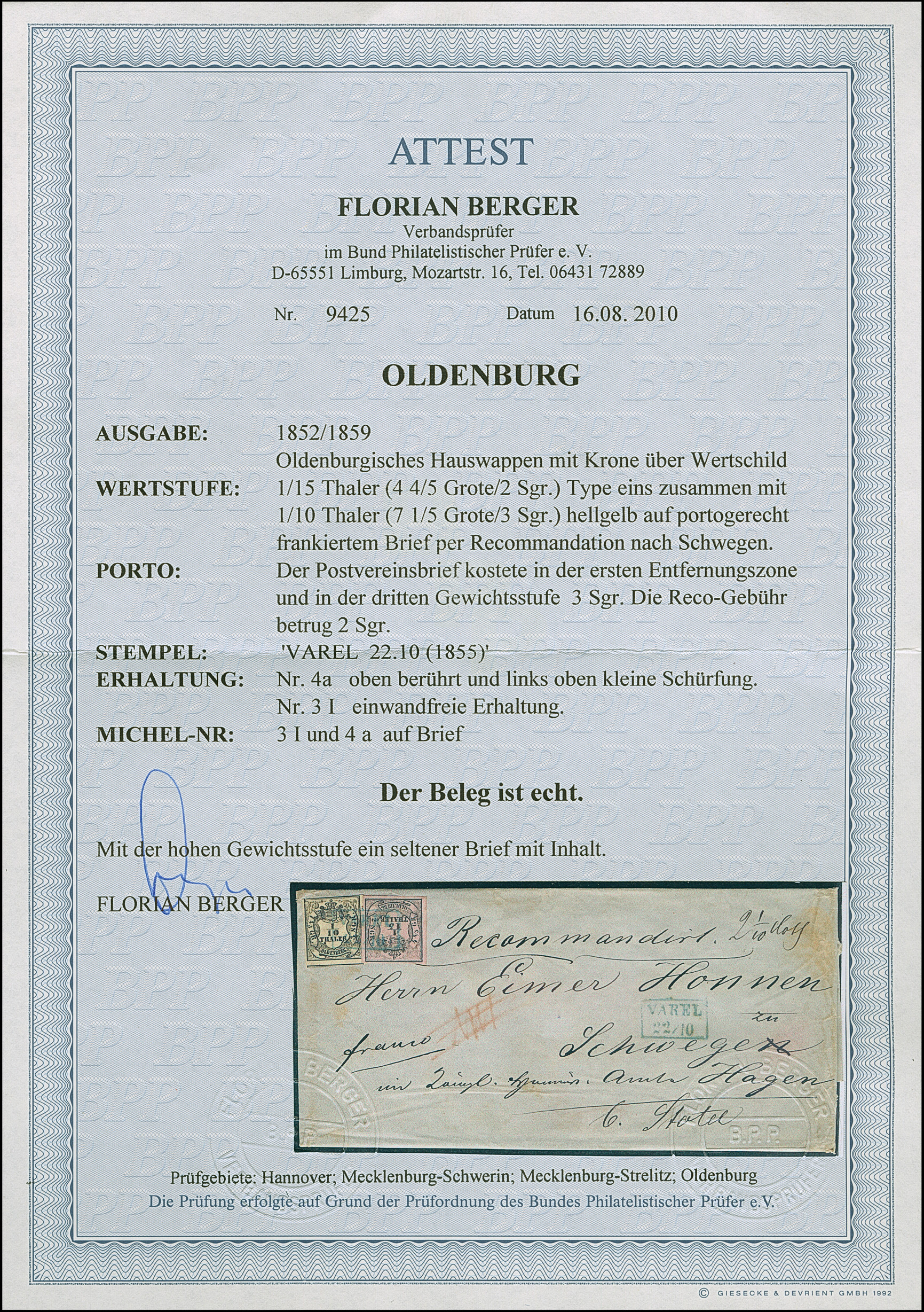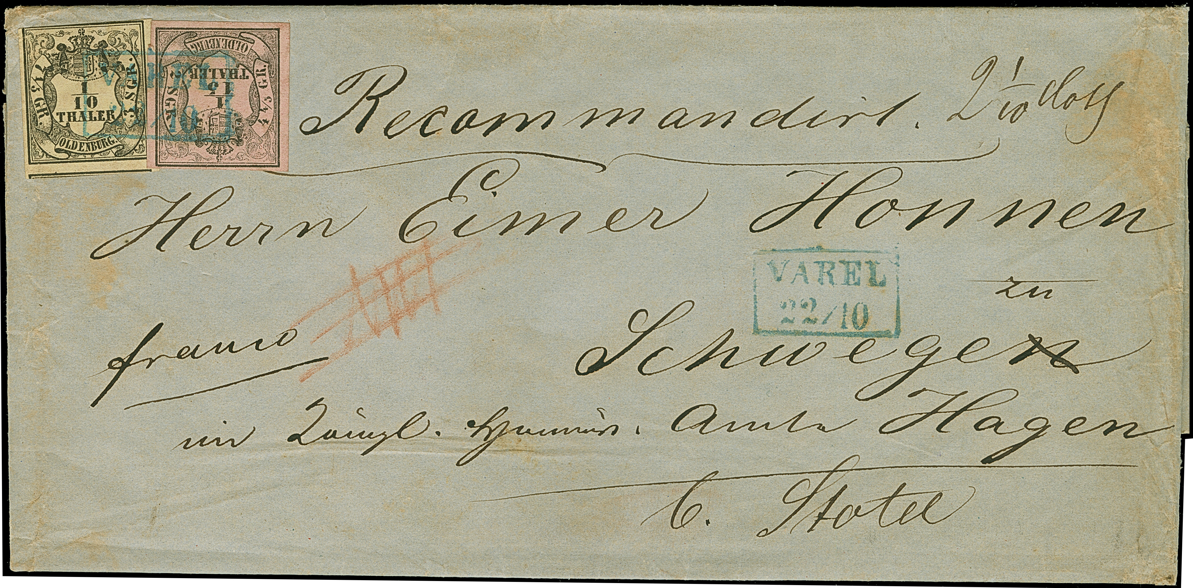 1/15 Th. auf rosa, Type I und 1/10 Th. hellgelb mit blauem Rahmenstempel “VAREL 22.10.(55)” auf komplettem R-Faltbrief der 3. Gewichtsstufe (2 1/10 Loth) in der 1. Entfernungsstufe via Dorfhagen nach Schwege bei Stotel mit Ankunftsstempel. Die farbfrischen Marken sind bis auf eine kleine Berührung bei der linken Marke allseits voll- bis breitrandig, die linke Marke mit kleiner Schürfung. Der Faltbrief mit stärkeren Randspuren und leichten Altersspuren. Ansonsten eine interessante Buntfrankatur mit seltener Verwendung in guter Gesamterhaltung, Fotoattest Berger BPP (2010)