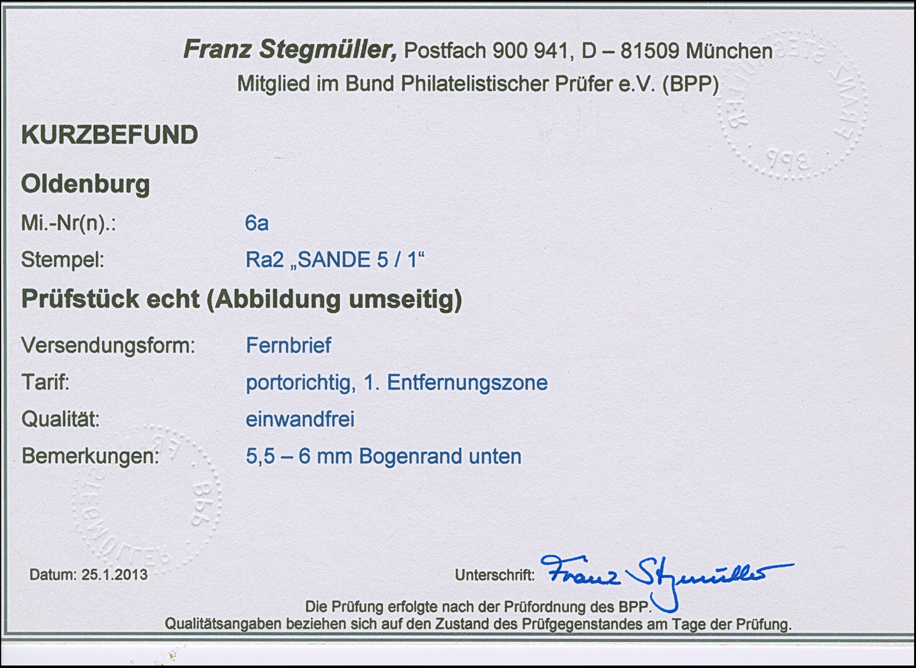 1 Gr. lebhaftgraublau, allseits breitrandig mit 5,5-6 mm Bogenrand unten, sauber mit blauem Ra1 “SANDE 5.1” auf Faltbriefhülle nach Jever mit Ankunftsstempel. Die Briefhülle mit Patina, die Marke ist in einwandfreier Erhaltung, Kurbefund Stegmüller BPP (2013)