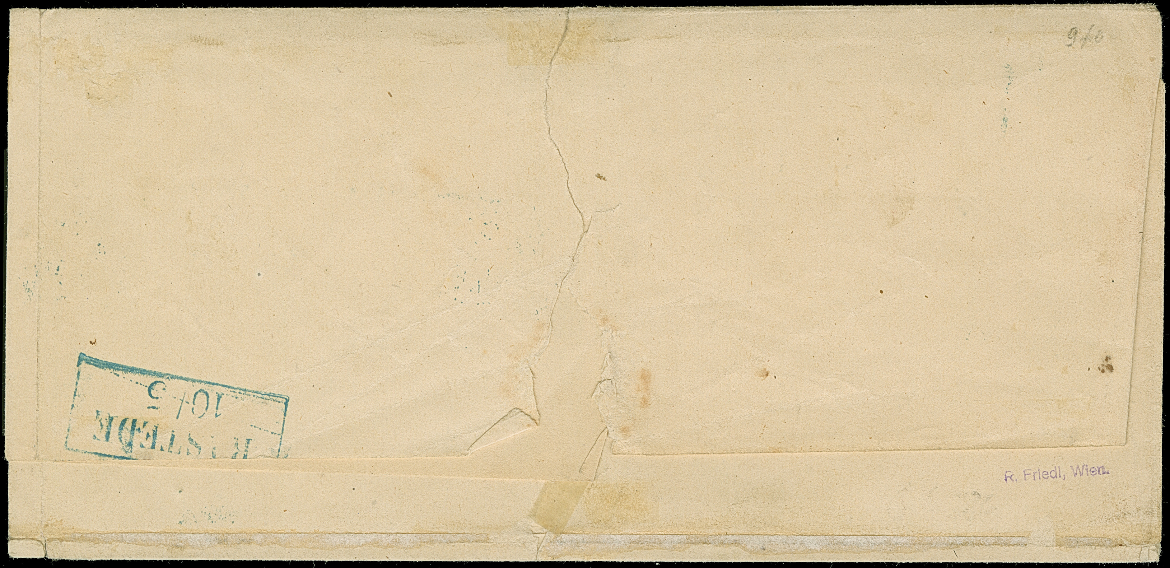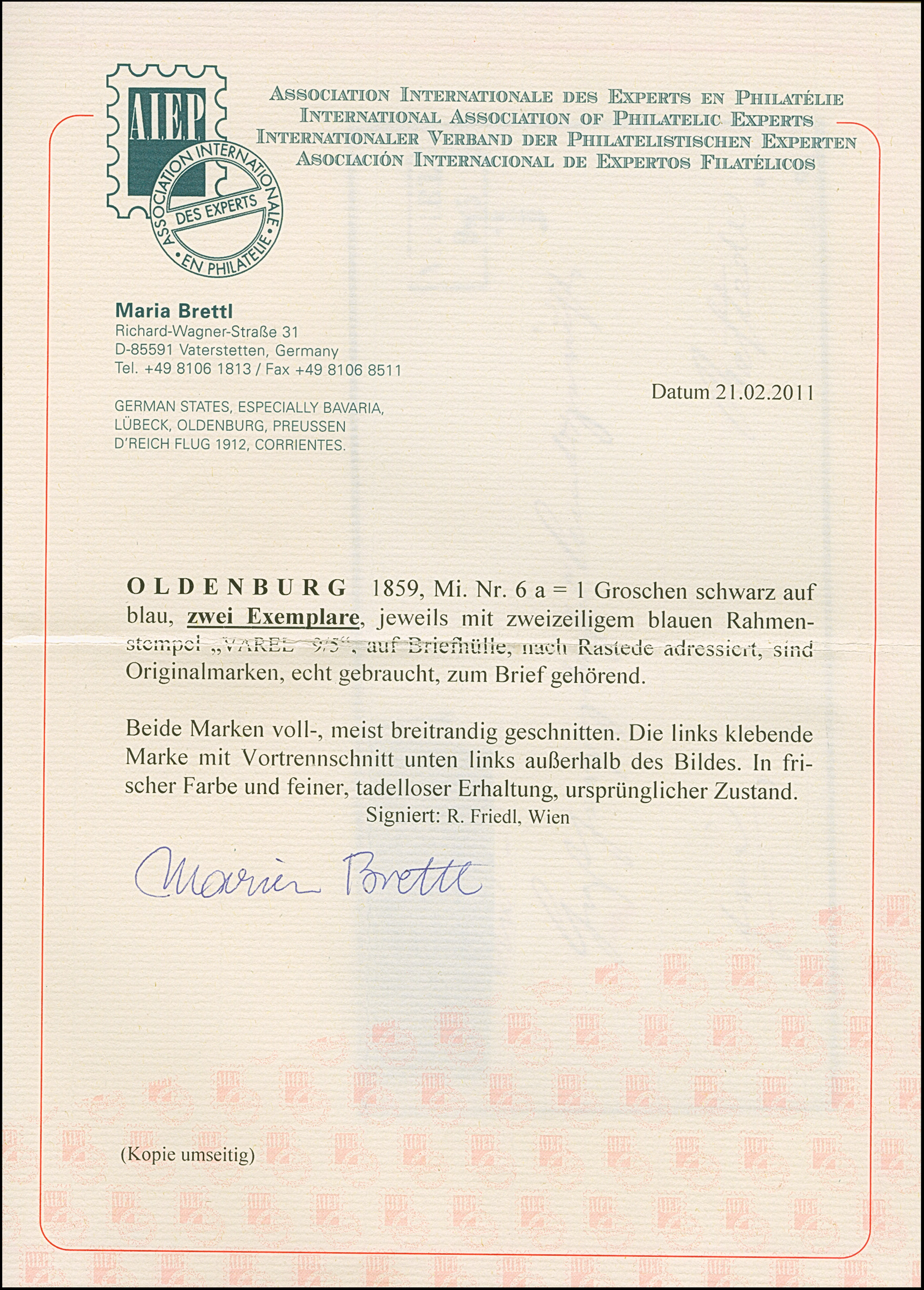 1 Gr. auf lebhaftgraublau, zwei Einzelmarken als Paar geklebt mit blauem Rahmenstempel “VAREL 9.5.” als tarifgerechte Mehrfachfrankatur auf Faltbriefhülle der 2. Gewichtsstufe nach Rastede mit Ankunftsstempel. Die farbfrischen Marken sind allseits voll- bis breitrandig, die linke Marke mit kleinem Vortrennschnitt außerhalb des Markenbildes und die Briefhülle mit Faltspuren. Ansonsten ist die Marke und die Briefhülle in einwandfreier Erhaltung. Eine ganz ungewöhnliche Mehrfachfrankatur mit zwei Einzelmarken, signiert R. Friedl Wien und Fotoattest Brettl A.I.E.P. (2011)
