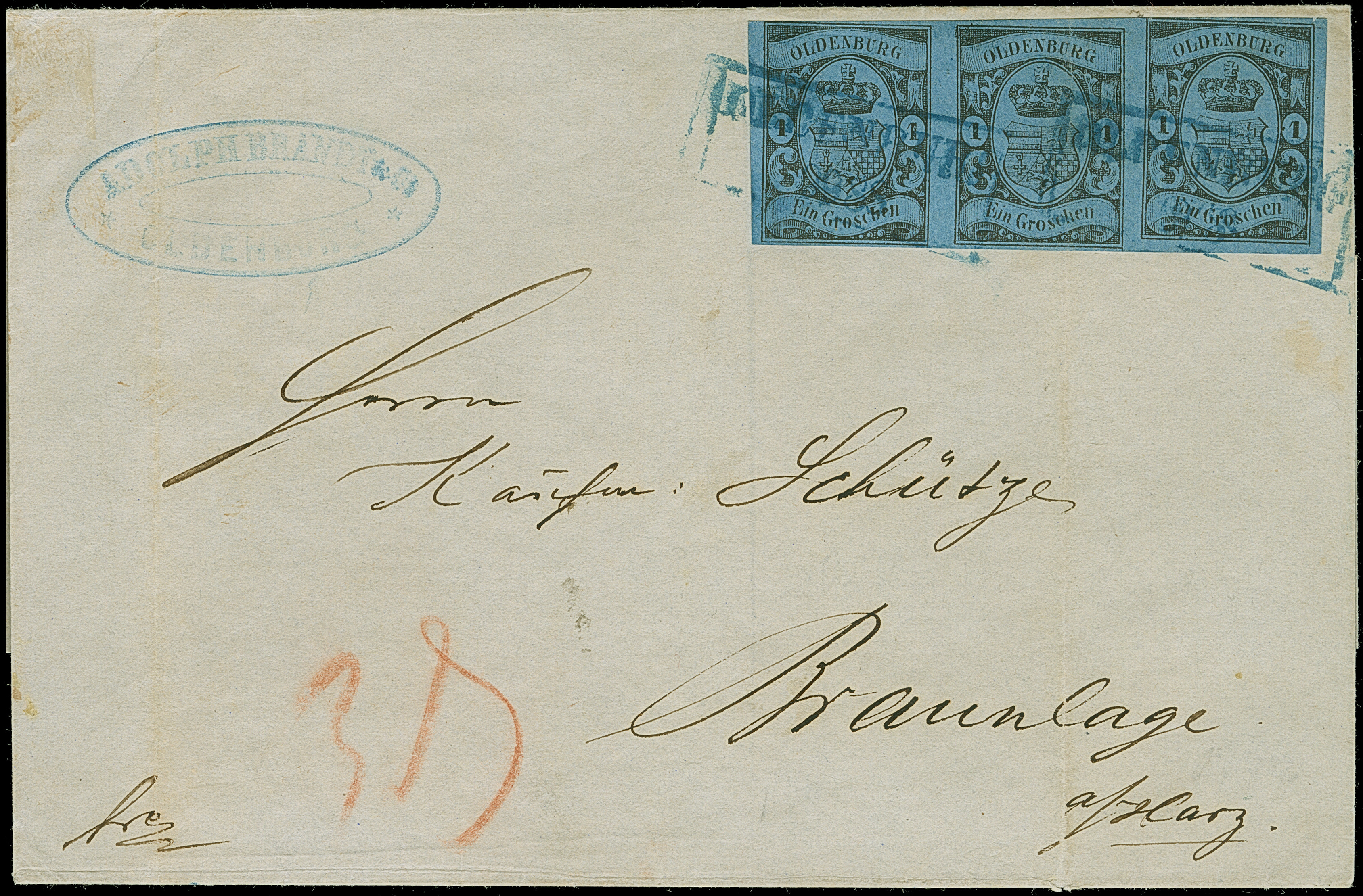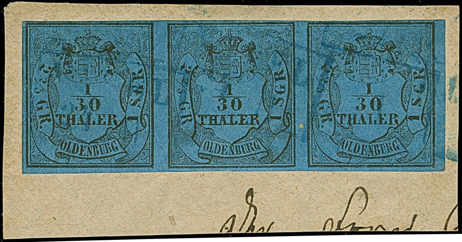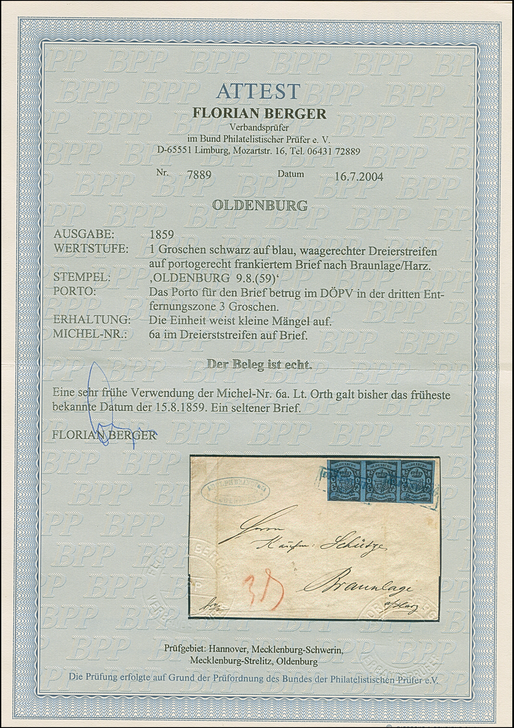 1 Gr. auf lebhaftgraublau im waagerechten Dreierstreifen mit blauem Rahmenstempel “OLDENBURG 9.8.(59)” als tarifgerechte Mehrfachfrankatur auf Faltbriefhülle in der 3. Entfernungszone nach Braunlage mit Ankunftsstempel. Die farbfrische Einheit ist allseits voll- bis breitrandig mit oben zwei kleinen, kurz angeschnittenen Randlinien und die mittlere Marke hat einen senkrechten Bug. Ansonsten ist die Einheit wie die Briefhülle in optisch ansprechender Gesamterhaltung. Bisher sind keine größeren Einheiten dieser Marke auf Brief bekannt, ProFi hat nur drei weitere Briefe registriert, hier mit neuem Frühdatum vom 9.8.1859 (laut Orth ist der 15.8.59 als Frühdatum registriert), Fotoattest Berger BPP (2004)