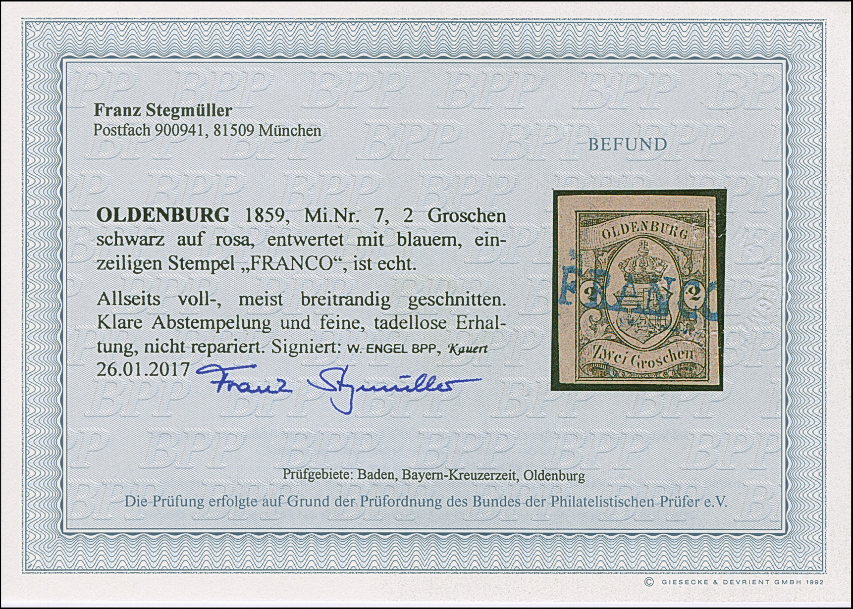 2 Gr. auf rosa, farbfrisch und allseits voll-, meist breitrandig, im Schnitt mit blauem L1 “FRANCO”, in tadelloser Erhaltung, signiert Kauert und W. Engel BPP sowie Fotobefund Stegmüller BPP (2017)