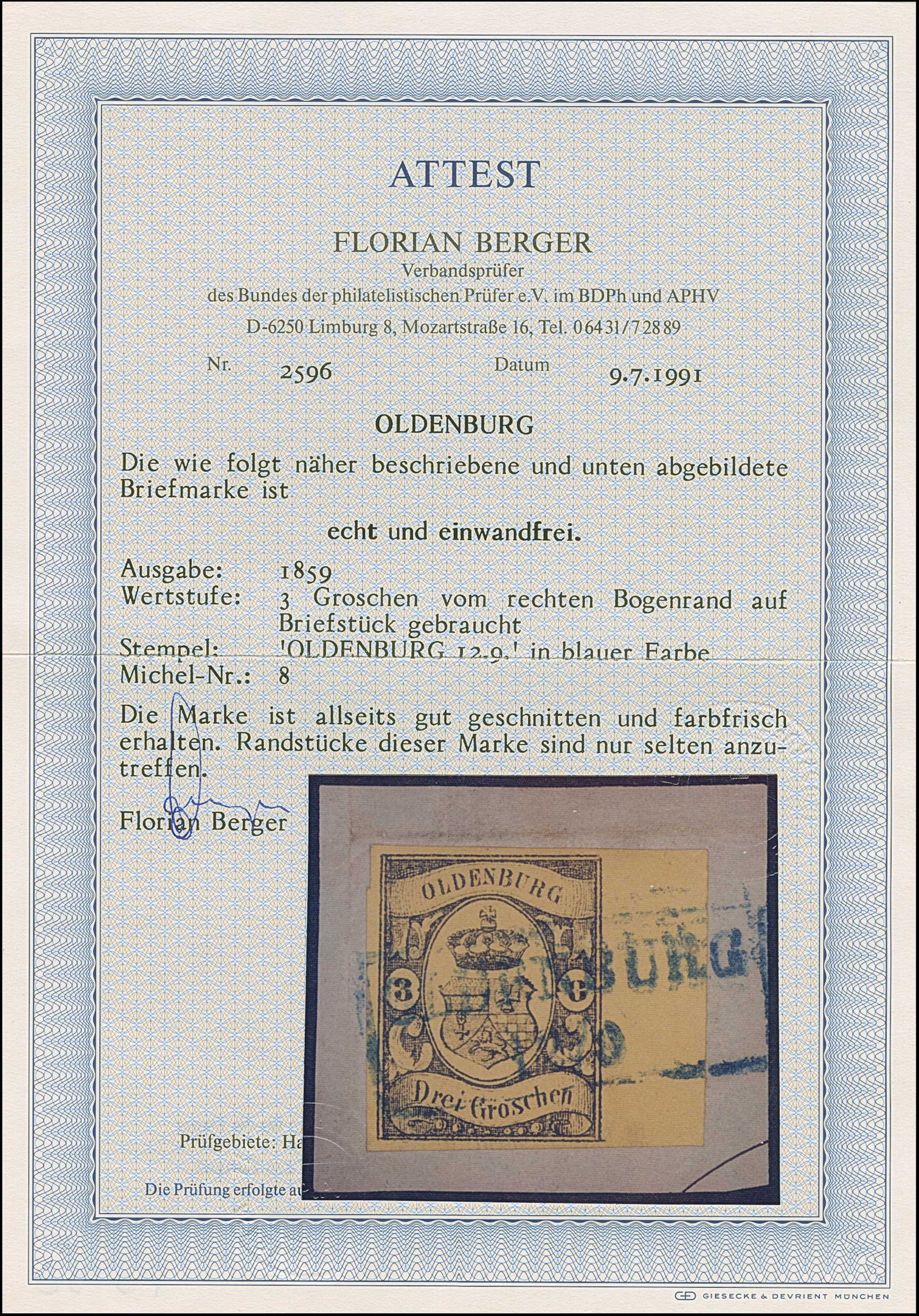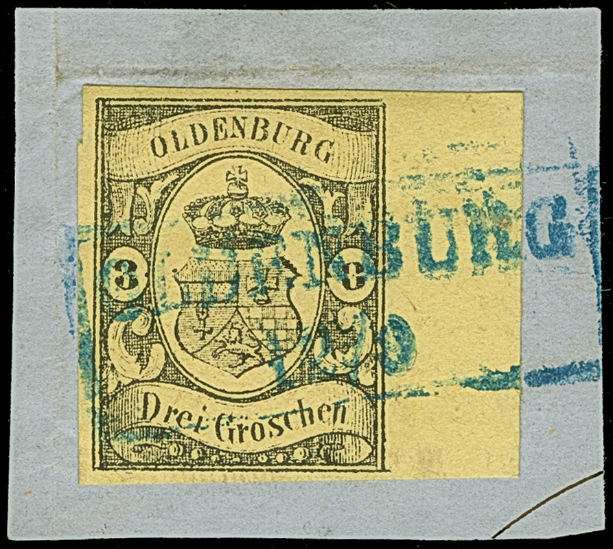 3 Gr. auf gelb, farbfrisch und allseits voll- bis breitrandig mit rechts 8 mm Bogenrand, mit blauem Rahmenstempel “OLDENBURG 12.9.” auf Briefstück, in einwandfreier Erhaltung. Marken dieser Wertstufe mit so breiten Bogenrändern sind sehr selten, signiert Drahn und Fotoattest Berger BPP (1991)
