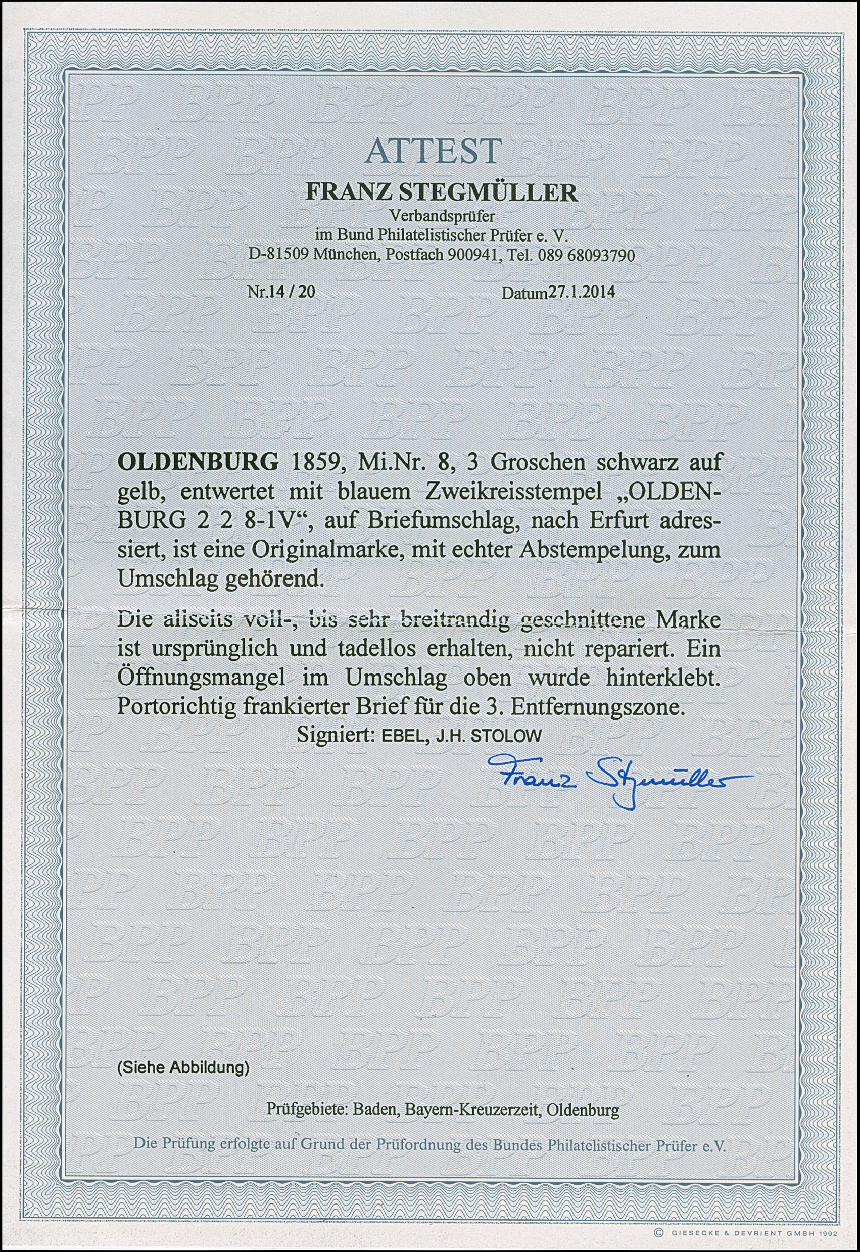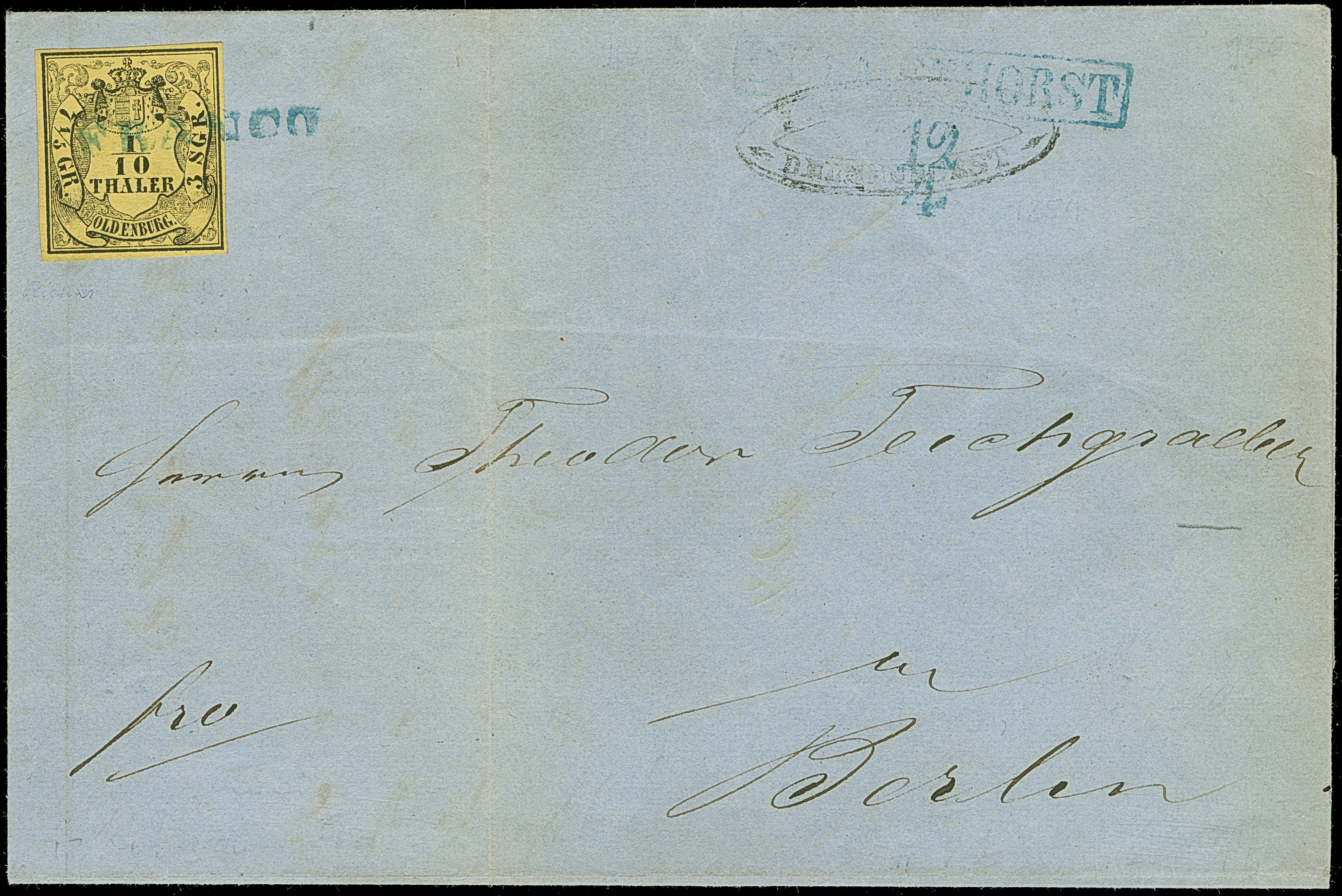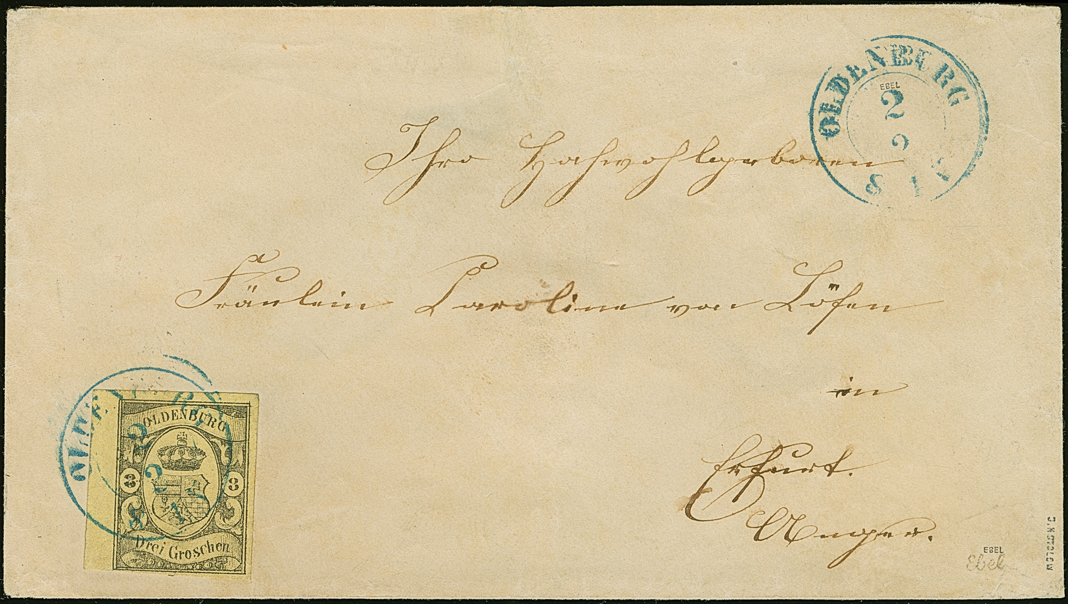 3 Sgr. auf gelb mit blauem DKr. “OLDENBURG 2.2." auf Briefkuvert der 3. Entfernungszone nach Erfurt mit Ausgabestempel. Der Umschlag oben mit verklebtem Einriss, die farbfrische Marke ist allseits voll- bis sehr breitrandig und in tadelloser Erhaltung. Ein Brief mit schöner Einzelfrankatur im DÖPV, signiert J.H. STOLOW und Ebel sowie mit Fotoattest Stegmüller BPP (2014)