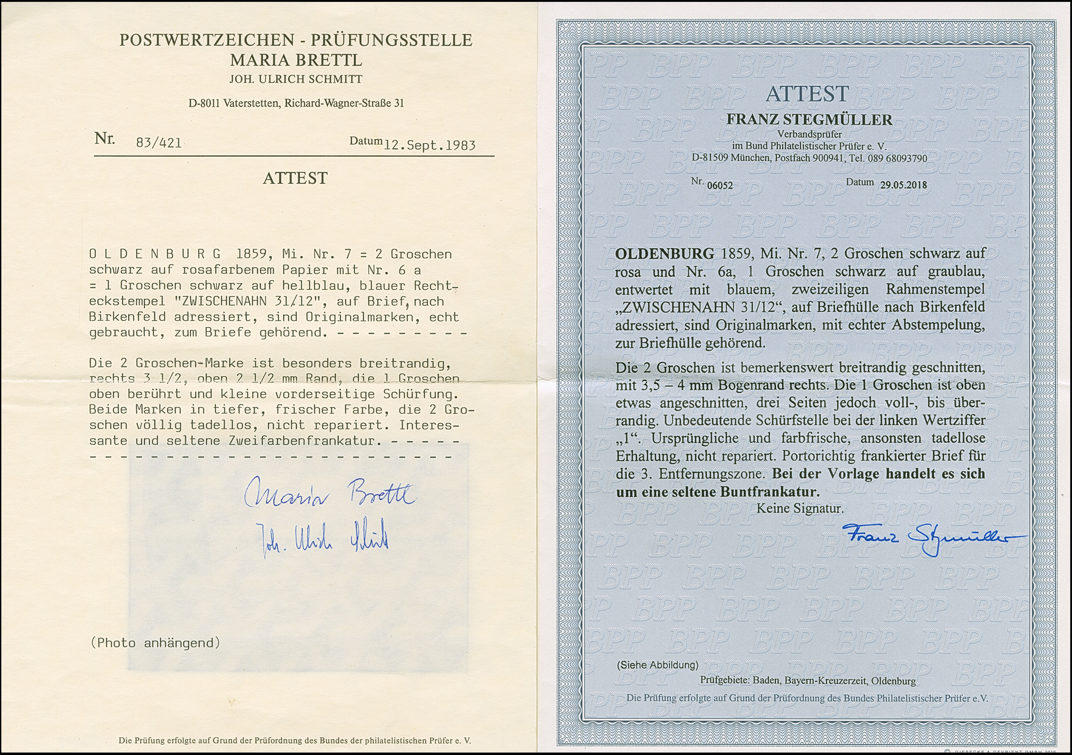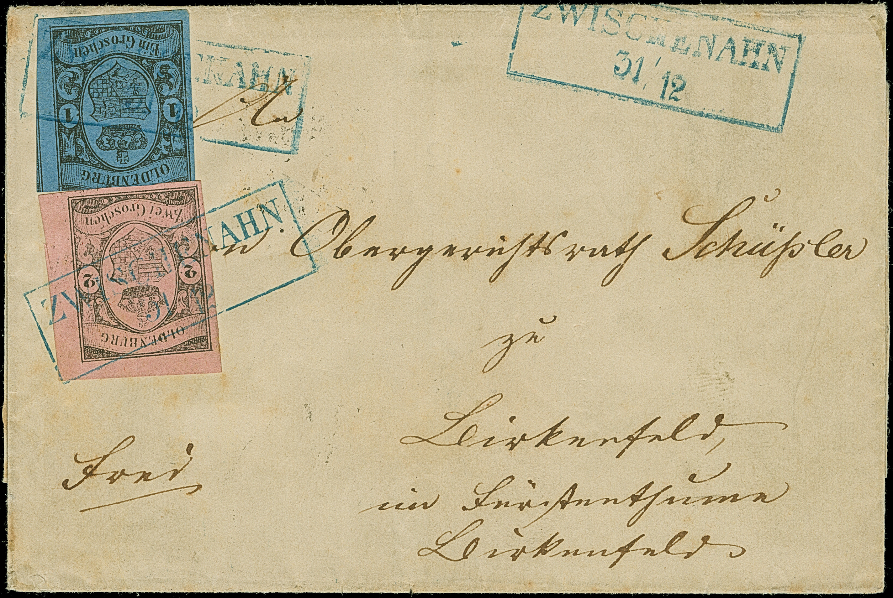 1 Gr. auf graublau, oben etwas angeschnitten, sonst voll- bis überrandig und 2 Gr. auf rosa, allseits breitrandig mit 3,5-4 mm Bogenrand rechts, jeweils mit blauem Rahmenstempel “ZWISCHENAHN 31.12.” als tarifgerechte Frankatur auf Faltbriefhülle via Oldenburg in der 3. Entfernungszone nach Birkenfeld mit Ausgabestempel. Die 1 Gr.-Marke mit unbedeutender, winziger Schürfung, ansonsten sind die farbfrischen Marken in einwandfreier Erhaltung. Eine attraktive und sehr seltene Buntfrankatur, Fotoattest Brettl BPP (1983) und Stegmüller BPP (2018)