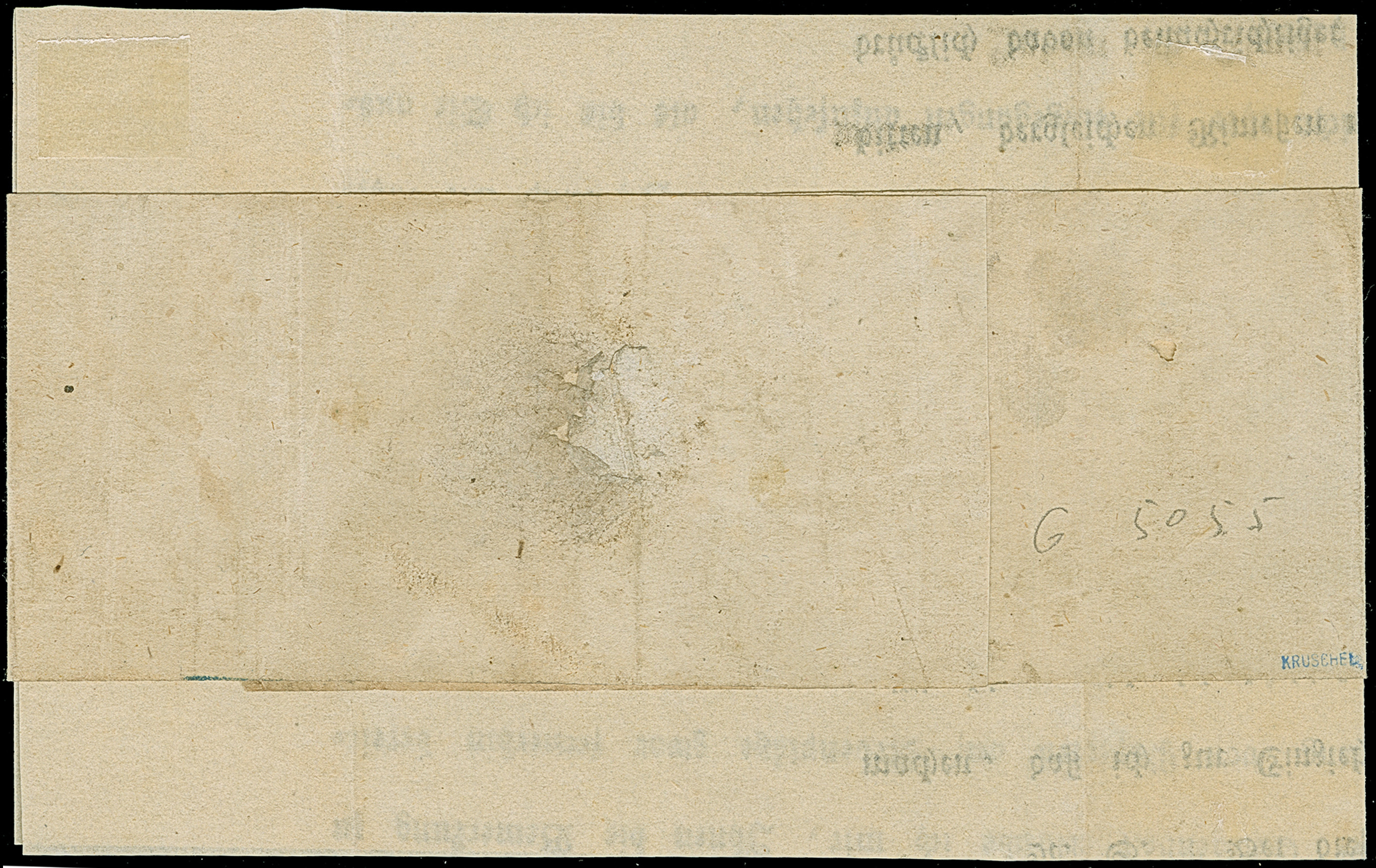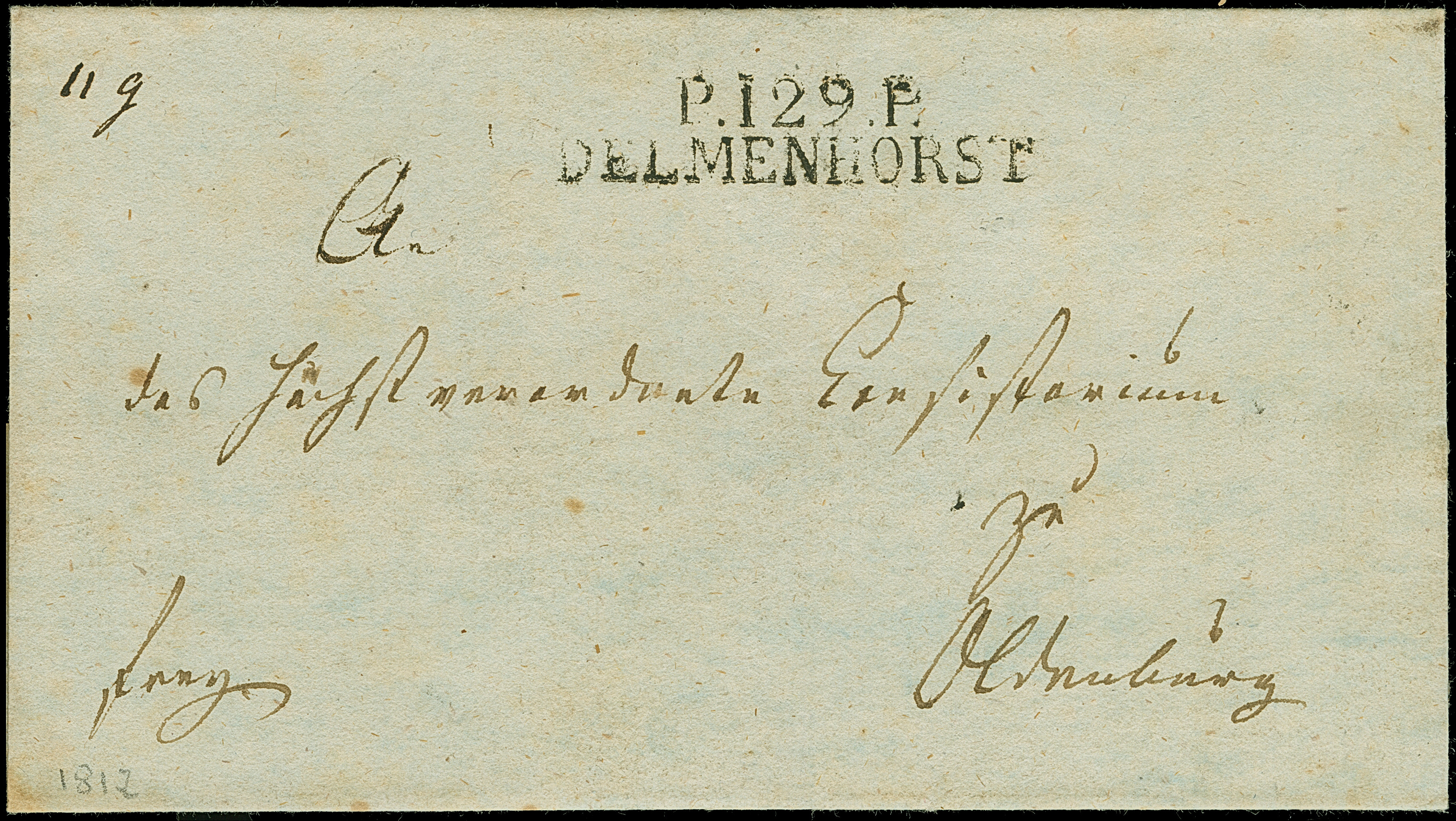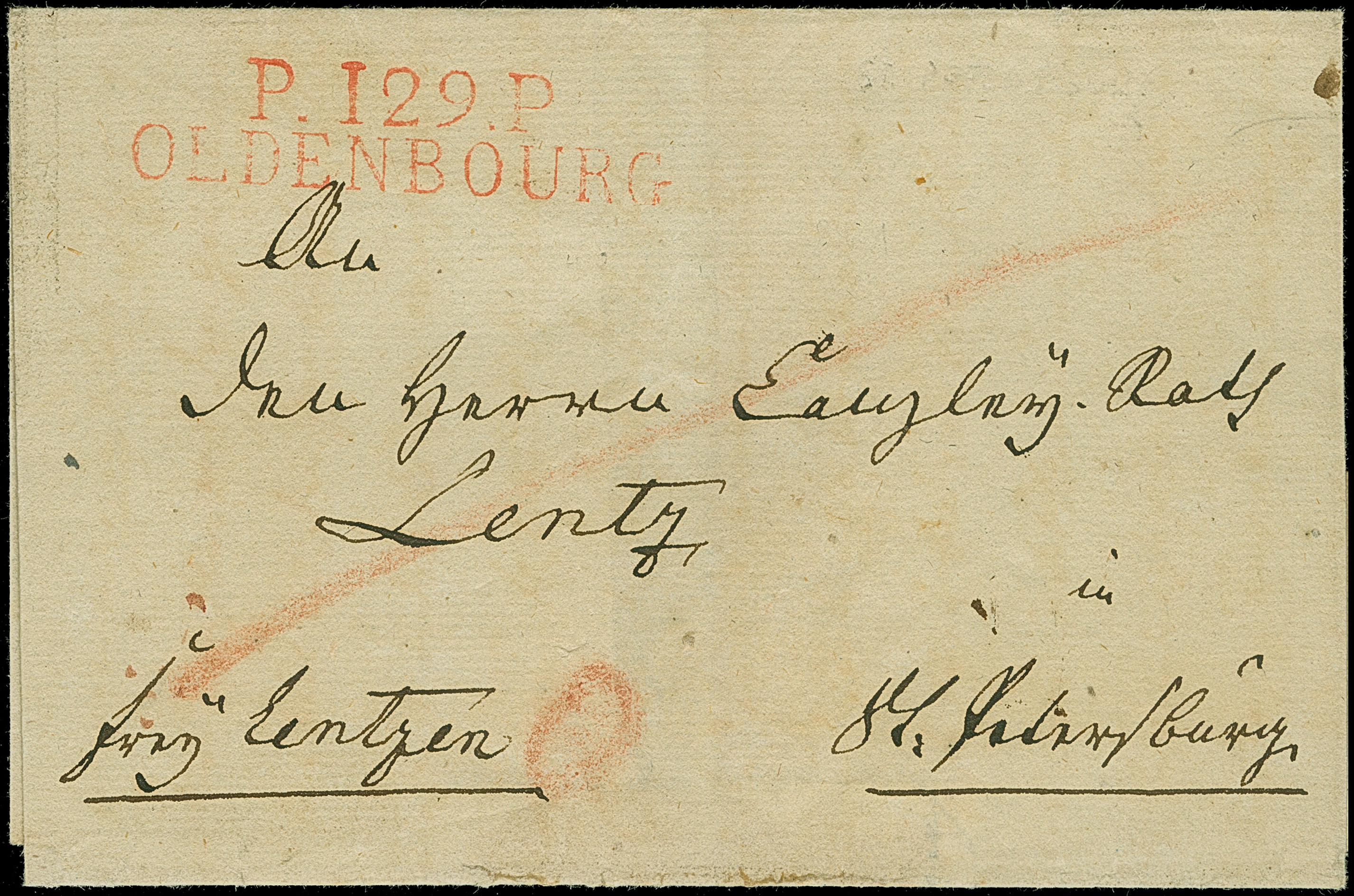 "P.129.P" OLDENBOURG" roter L2 klar auf Faltbriefhülle mit Leitvermerk “frco Lentzen” nach St. Petersburg, rückseitig mit Kartierungs- und Tax-Vermerken. Eine kleine Fehlstelle wurde rückseitig hinterlegt, ansonsten in guter Erhaltung
