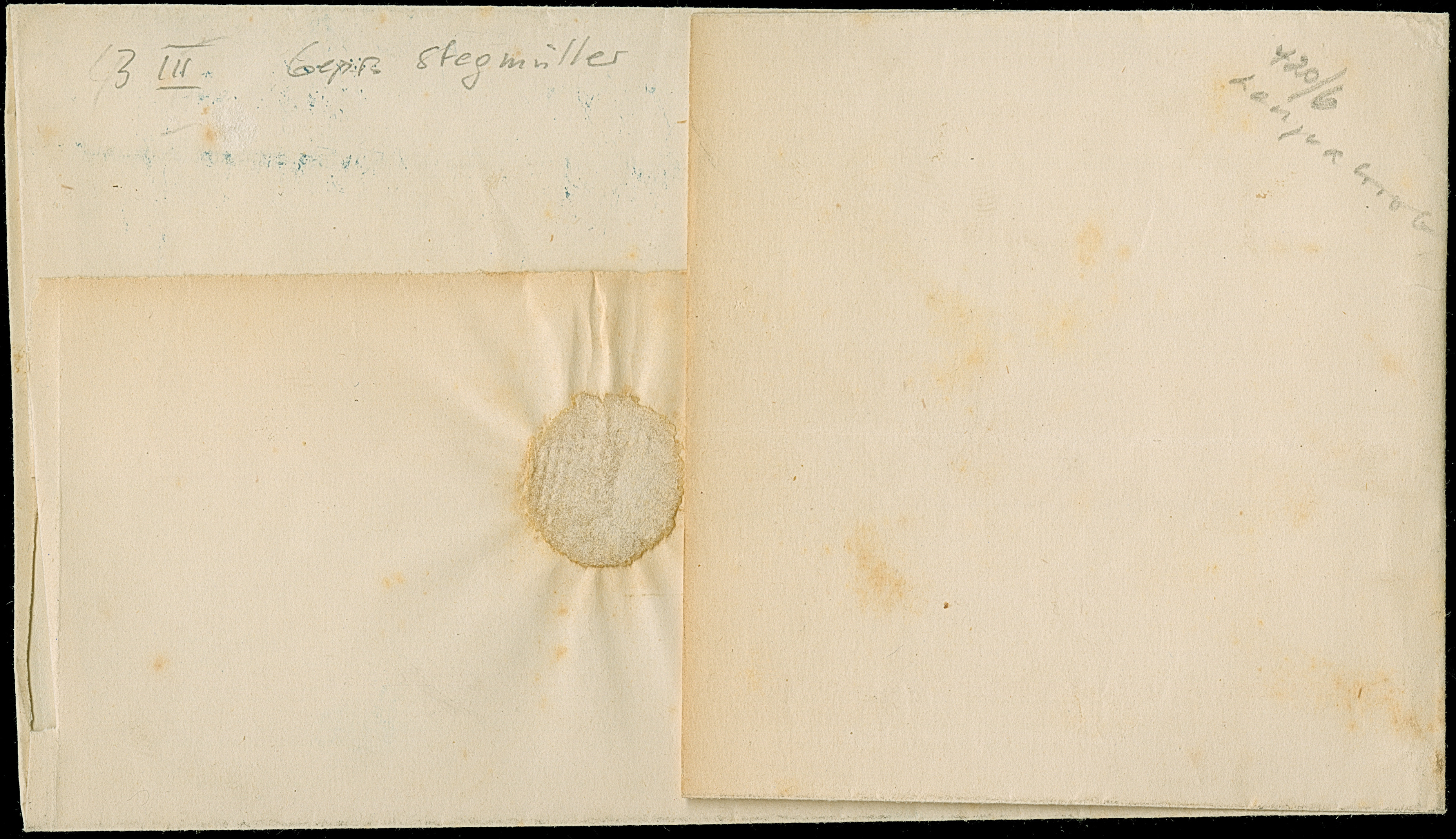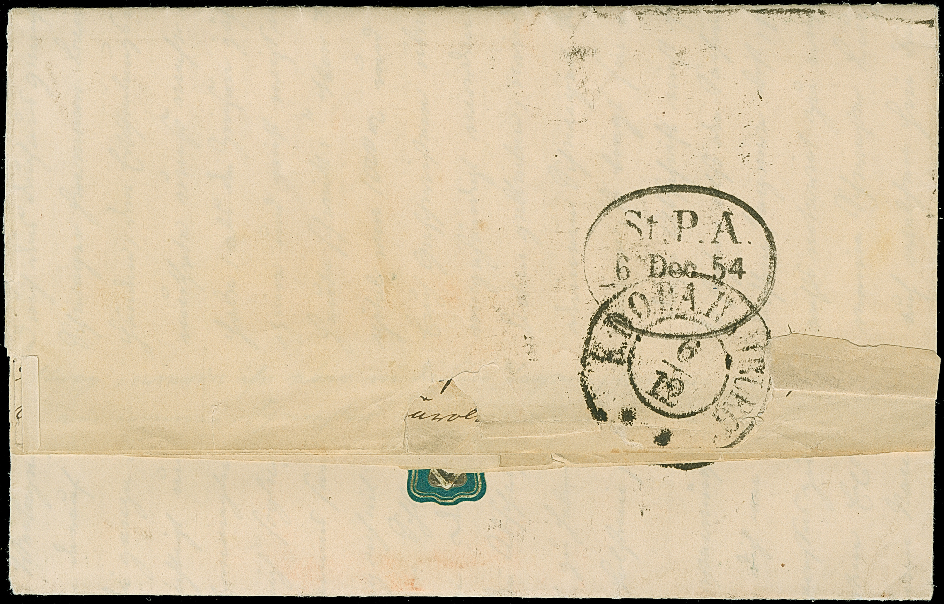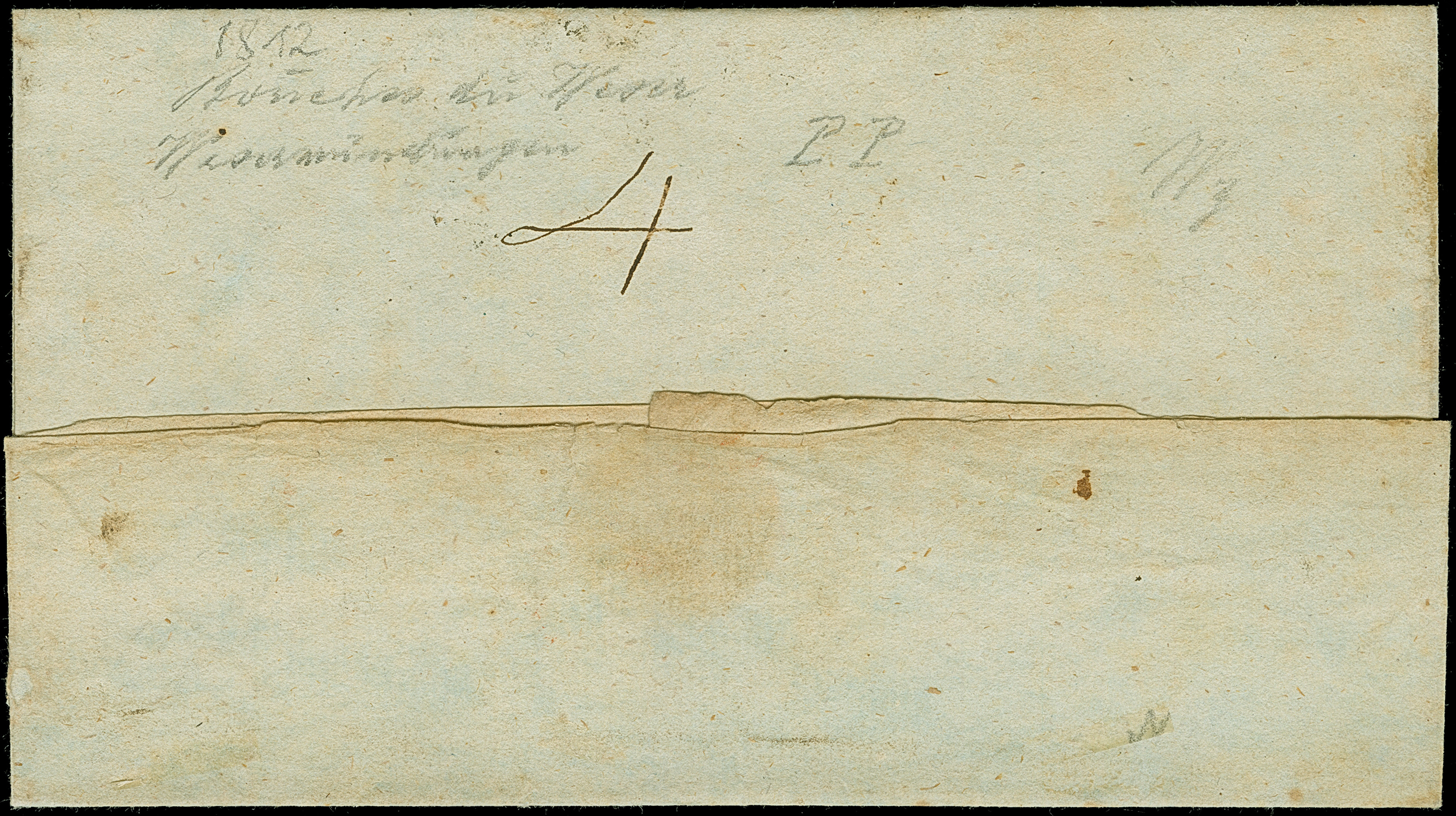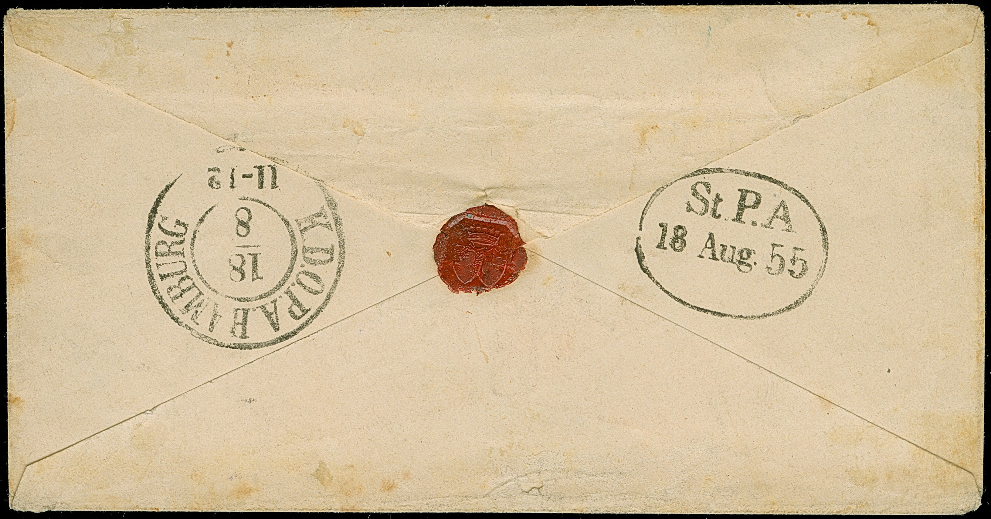 "P.129.P" OLDENBOURG" roter L2 klar auf Faltbriefhülle mit Leitvermerk “frco Lentzen” nach St. Petersburg, rückseitig mit Kartierungs- und Tax-Vermerken. Eine kleine Fehlstelle wurde rückseitig hinterlegt, ansonsten in guter Erhaltung