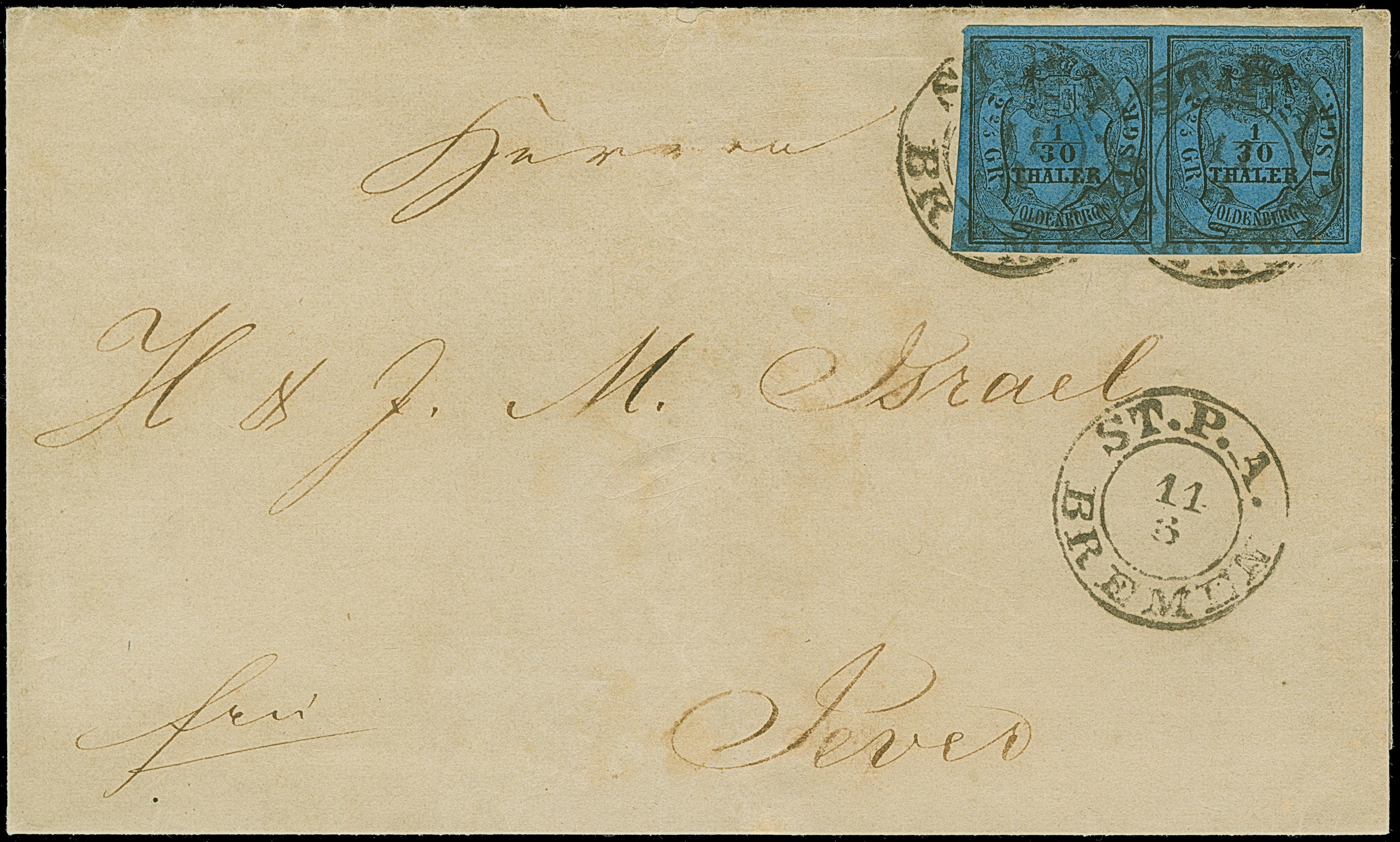 1/30 Th. auf blau, Type II, farbfrisches und allseits breitrandiges Paar mit je klarem DKr. “ST.P.A. BREMEN 11.3.” auf Faltbriefhülle der 2. Gewichtsstufe nach Jever. Die Faltbriefhülle wurde etwas behandelt und neu gefaltet, das Markenpaar ist in einwandfreier Erhaltung, ein dekorativer Brief