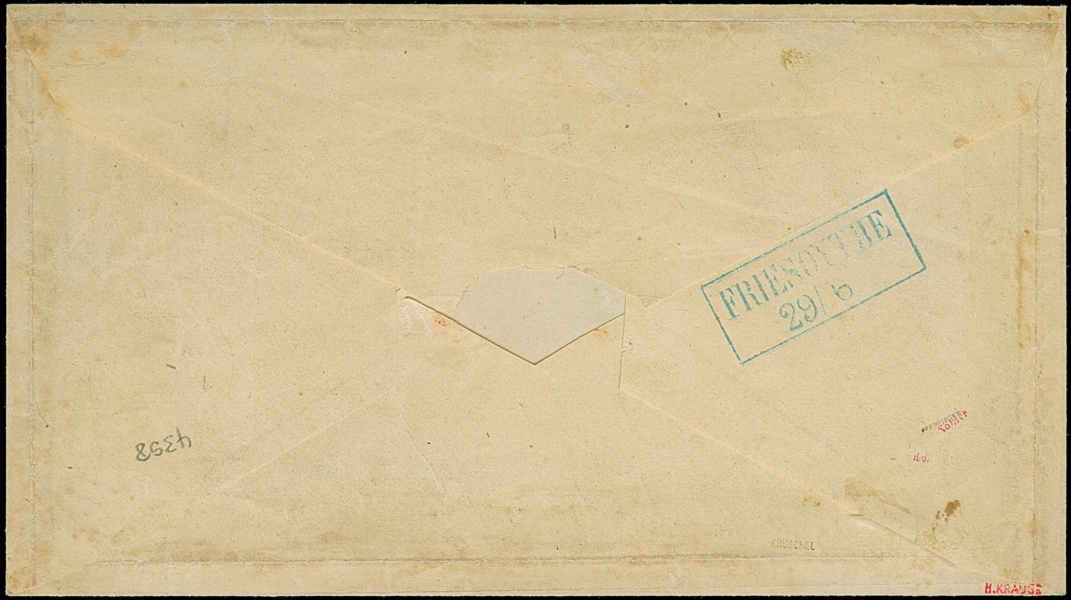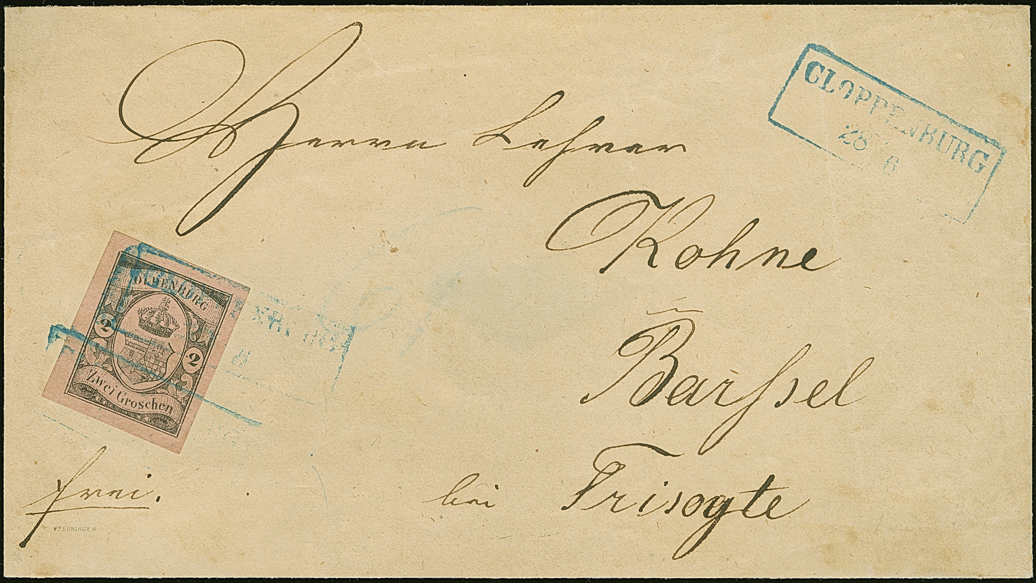 2 Gr. auf mattrötlichkarmin, farbfrisch und allseits besonders breitrandig mit blauem Rahmenstempel “CLOPPENBURG 28.6.” auf Briefkuvert der 2. Gewichtsstufe nach Barßel bei Friesoythe mit Ankunftsstempel. Der Umschlag ist im Rand neu umgefaltet und hat Faltspuren, die Marke ist in tadelloser Erhaltung, signiert H. Krause, Köhler und Pfenninger mit Attest (1958) sowie Fotoattest Brettl BPP (2000)