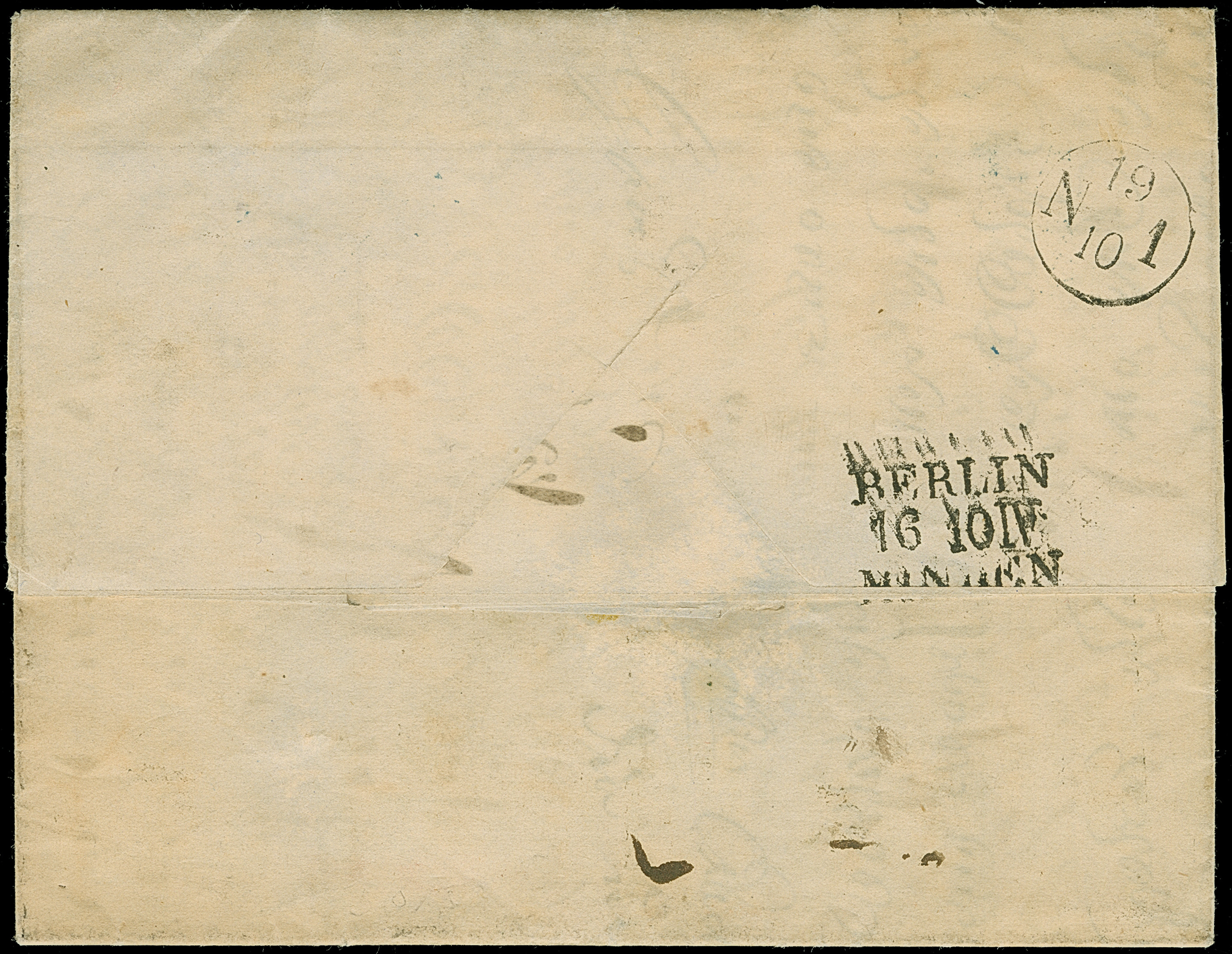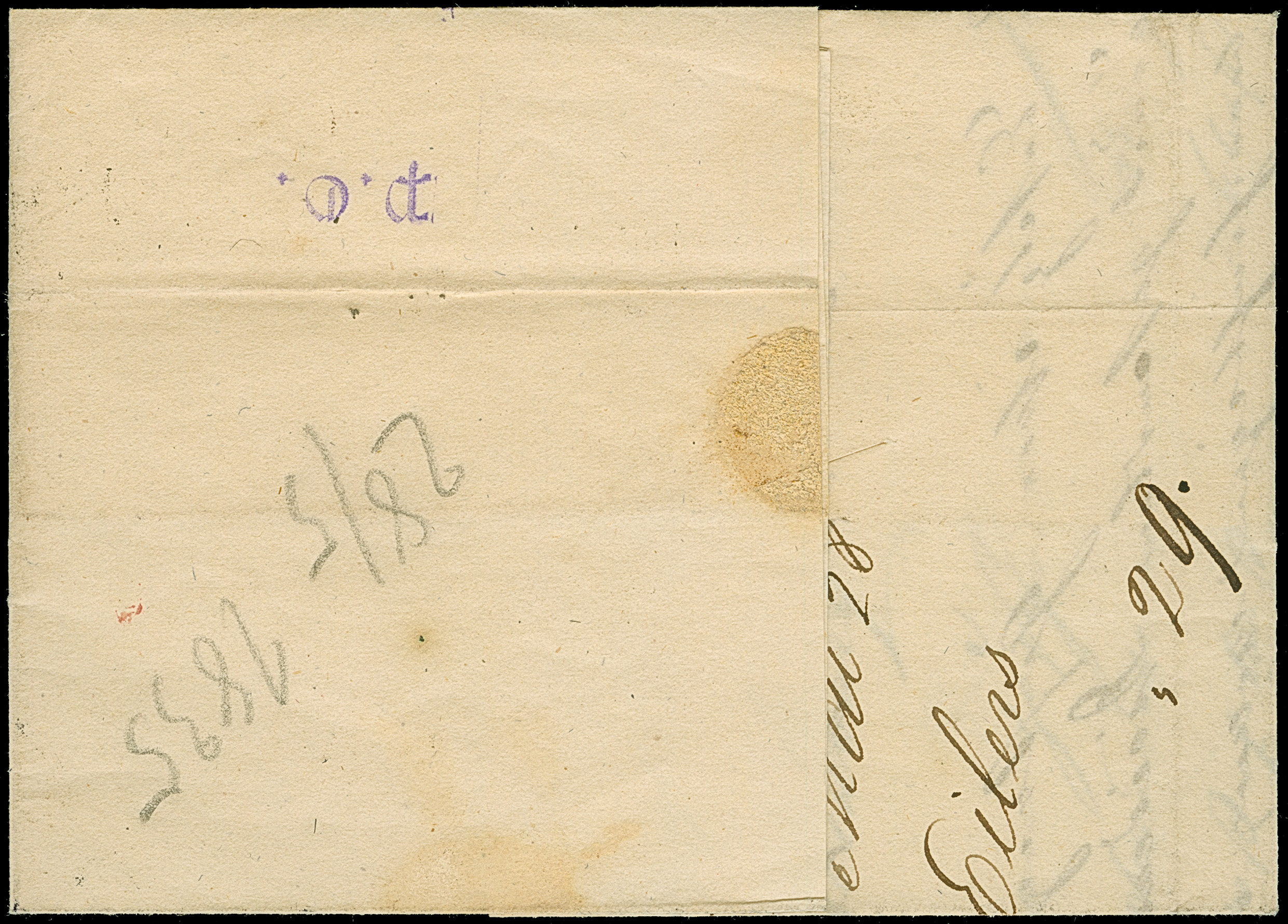 “ZETEL” handschriftlicher Aufgabevermerk auf komplettem Faltbrief (datiert Zetel 28.5.1835) mit schwarzem L2 “NEUENBURG MAY 28.1835” nach Oldenburg, in einwandfreier Erhaltung