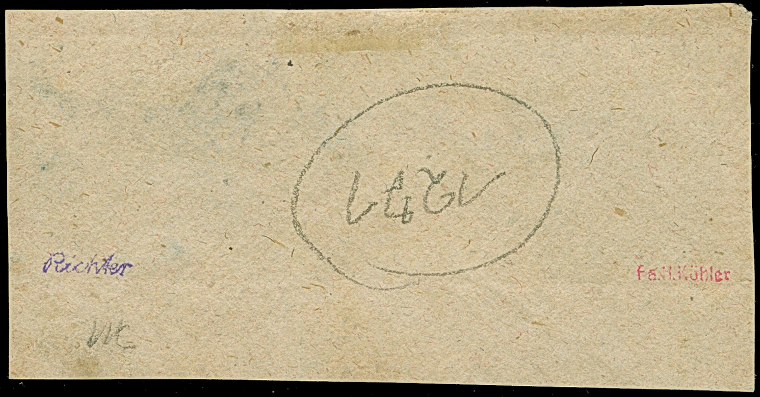 ⅓ Gr. auf grünoliv, farbfrisch, oben vollrandig, sonst dreiseitig sehr breitrandig im Schnitt mit klarem, blauen Rahmenstempel “DAMME 31.10.” auf Drucksachen-Streifband (gedruckter Inhalt nicht original dazugehörig) nach Wildeshausen. Das Streifband wurde gereinigt und ein kleines Loch rechts unterhalb der Marke geschlossen, die Marke ist in einwandfreier Erhaltung. Eine dekorative und seltene Einzelfrankatur, Fotoattest Brettl BPP (1993)