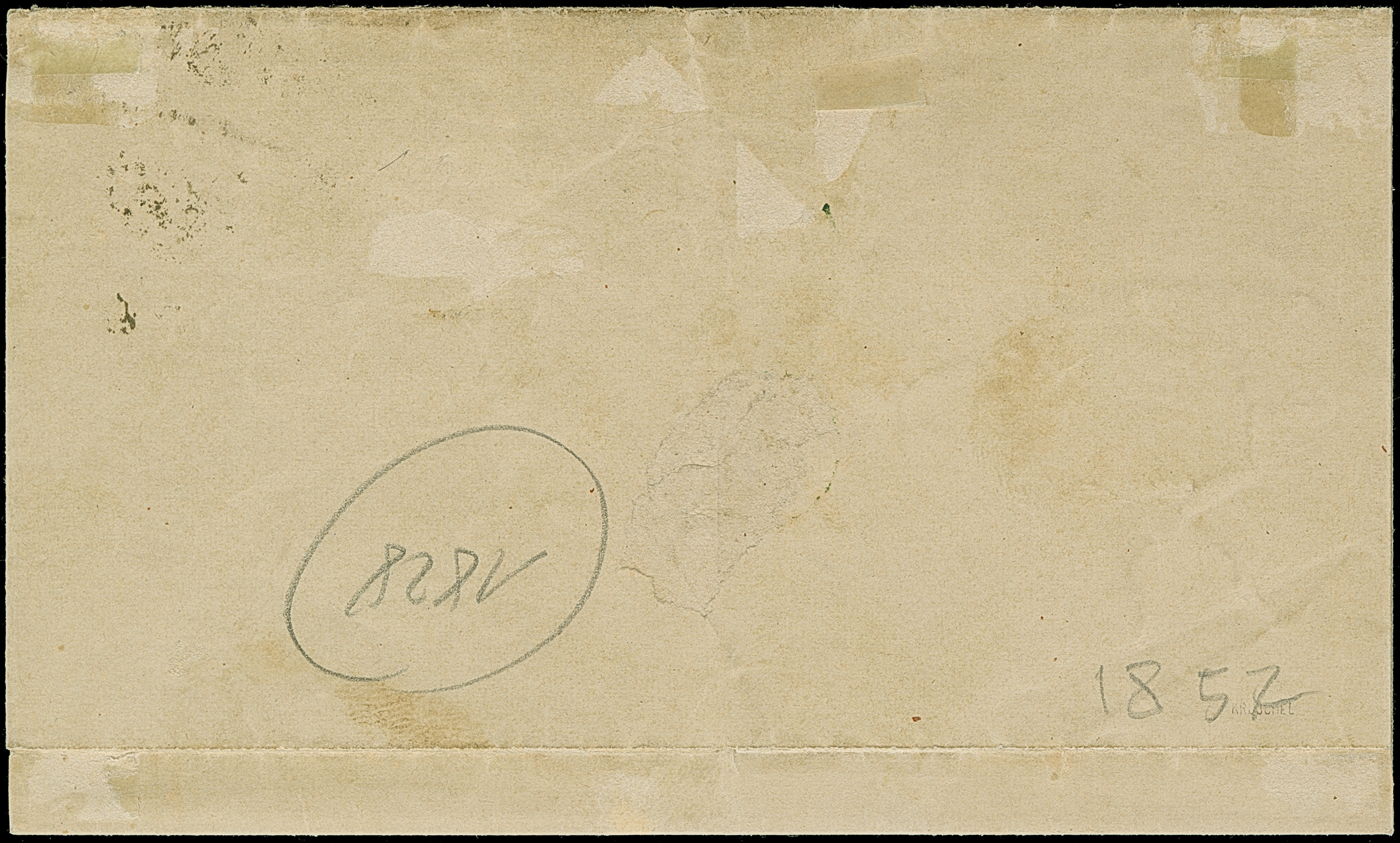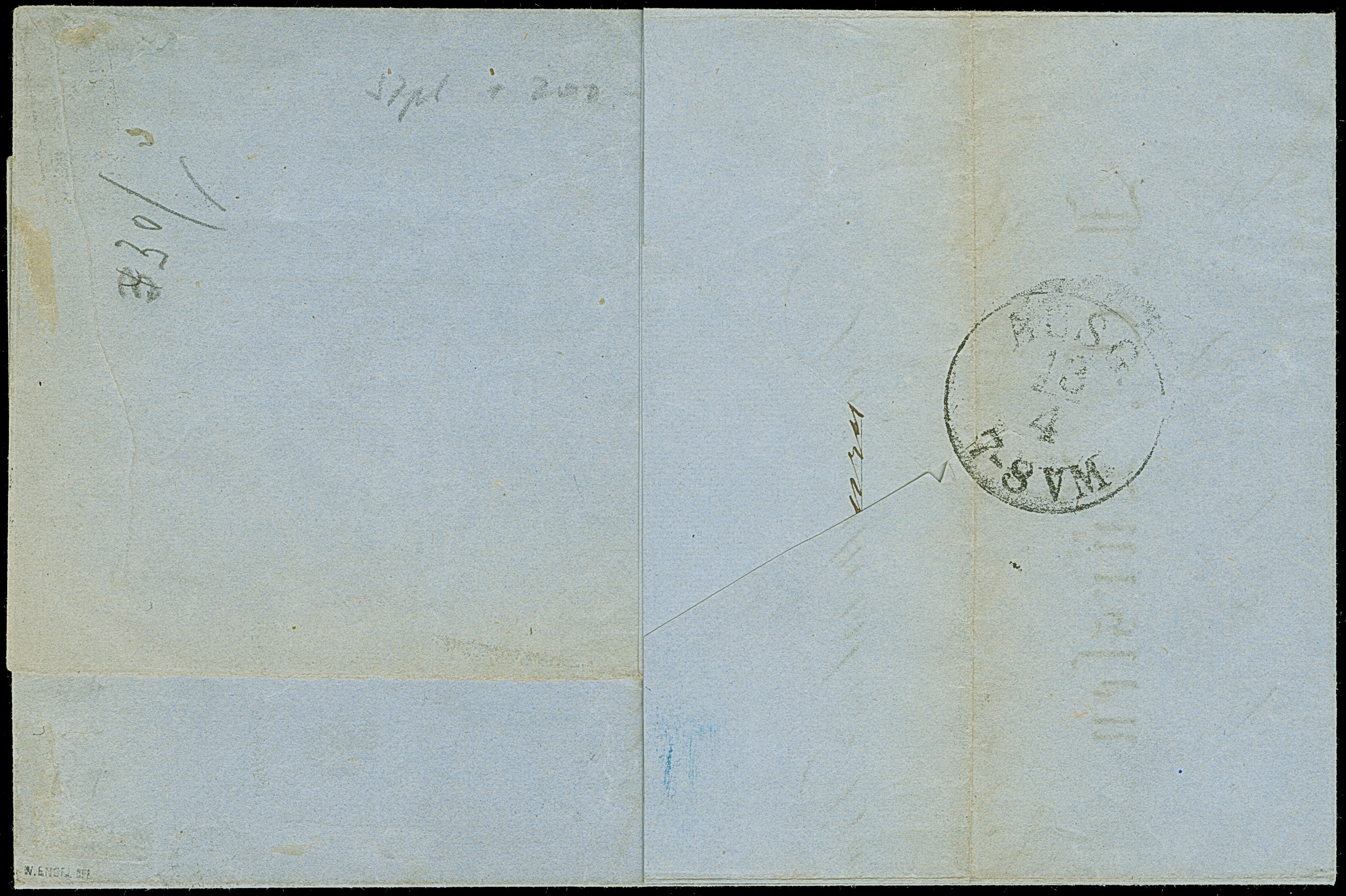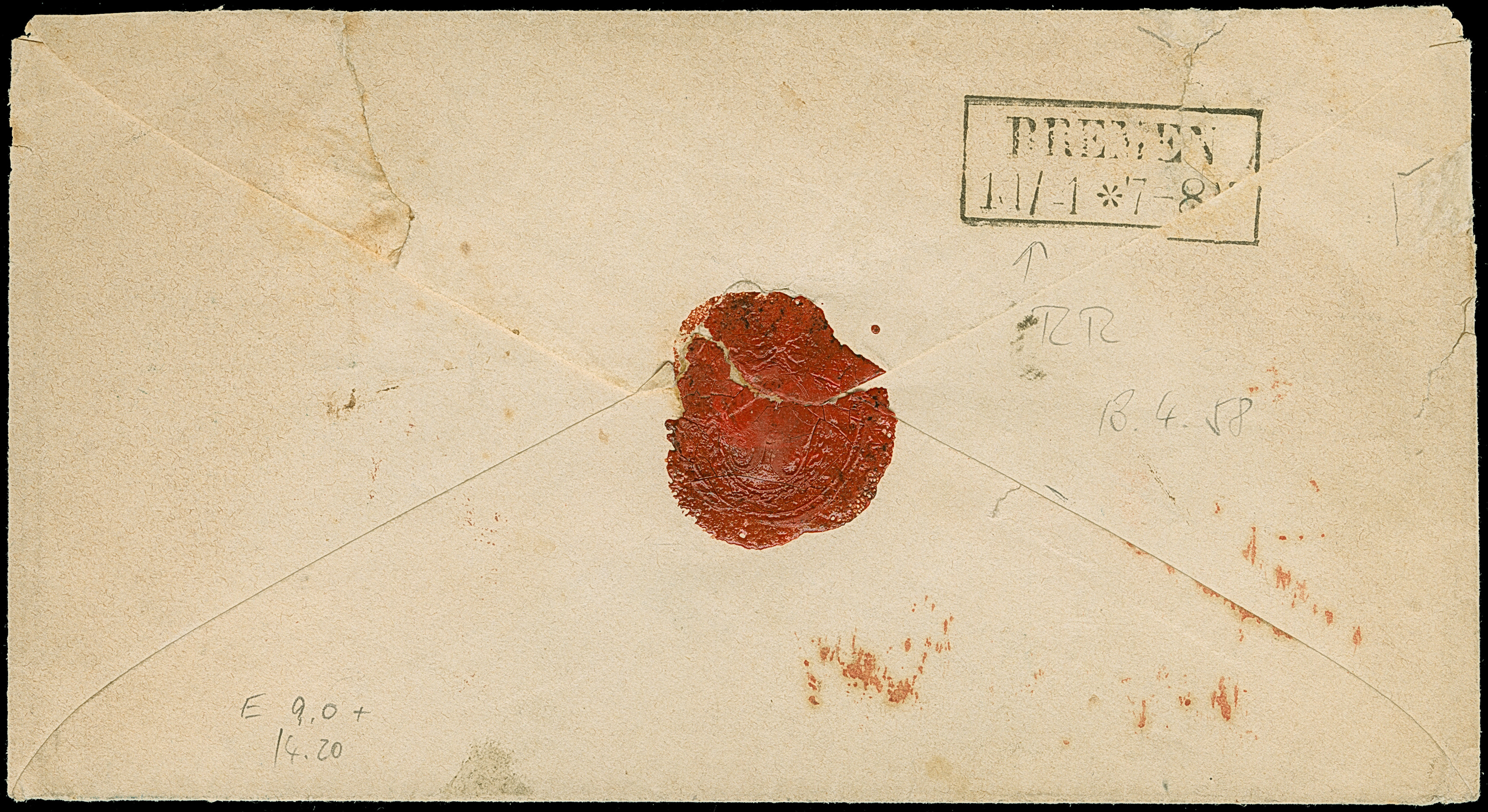 1/30 Th. auf blau, Type III, allseits voll- bis breitrandig geschnitten mit blauem Rahmenstempel “ATENS 13.4.” auf Briefkuvert mit blauem Tax-Vermerk “4½” (Sgr.), rotem Ra1 “PAID.” und Tax-Stempel “10” (Cents) via Bremen und New York nach Washington. Die Freimarke stellt die Postvereinstaxe bis Bremen dar, das Weiterfranko in Höhe von 4½ Sgr. wurde vom Absender bar bezahlt. Die farbfrische Marke ist in tadelloser Erhaltung, kleine Öffnungsmängel links oben im Umschlag wurden verklebt bzw. ergänzt. Ein seltener Überseebrief mit geteilter Francoabgeltung aus bekannter Korrespondenz, Fotoattest Stegmüller BPP (2022)