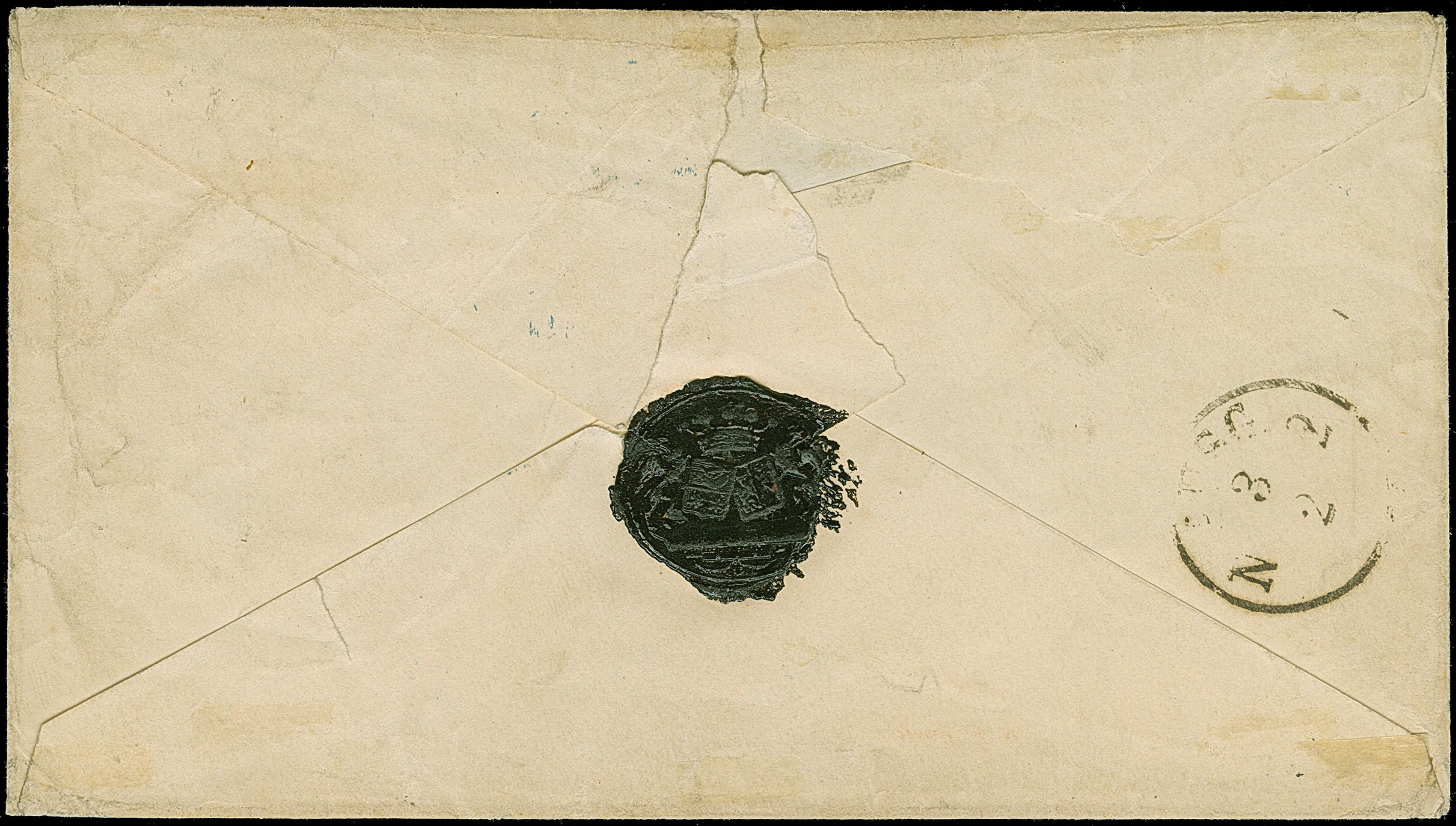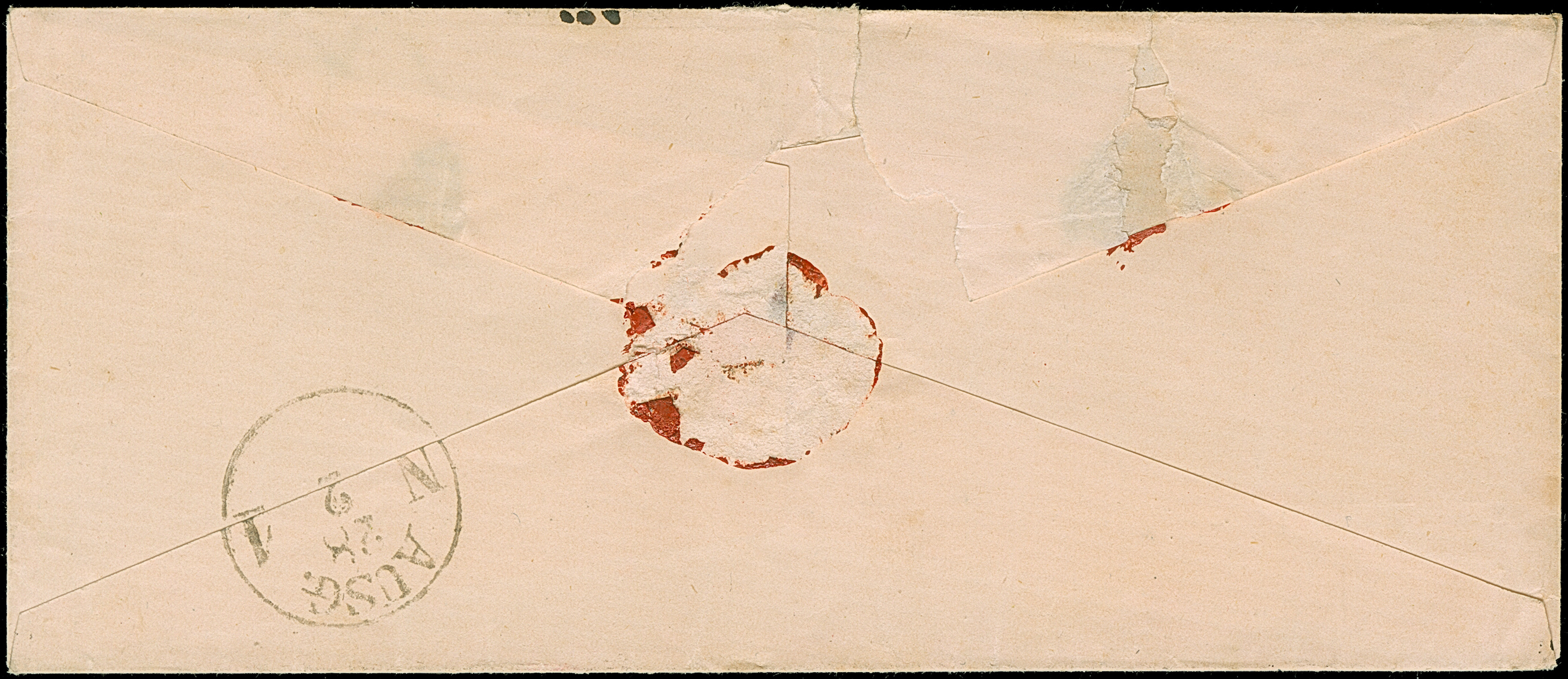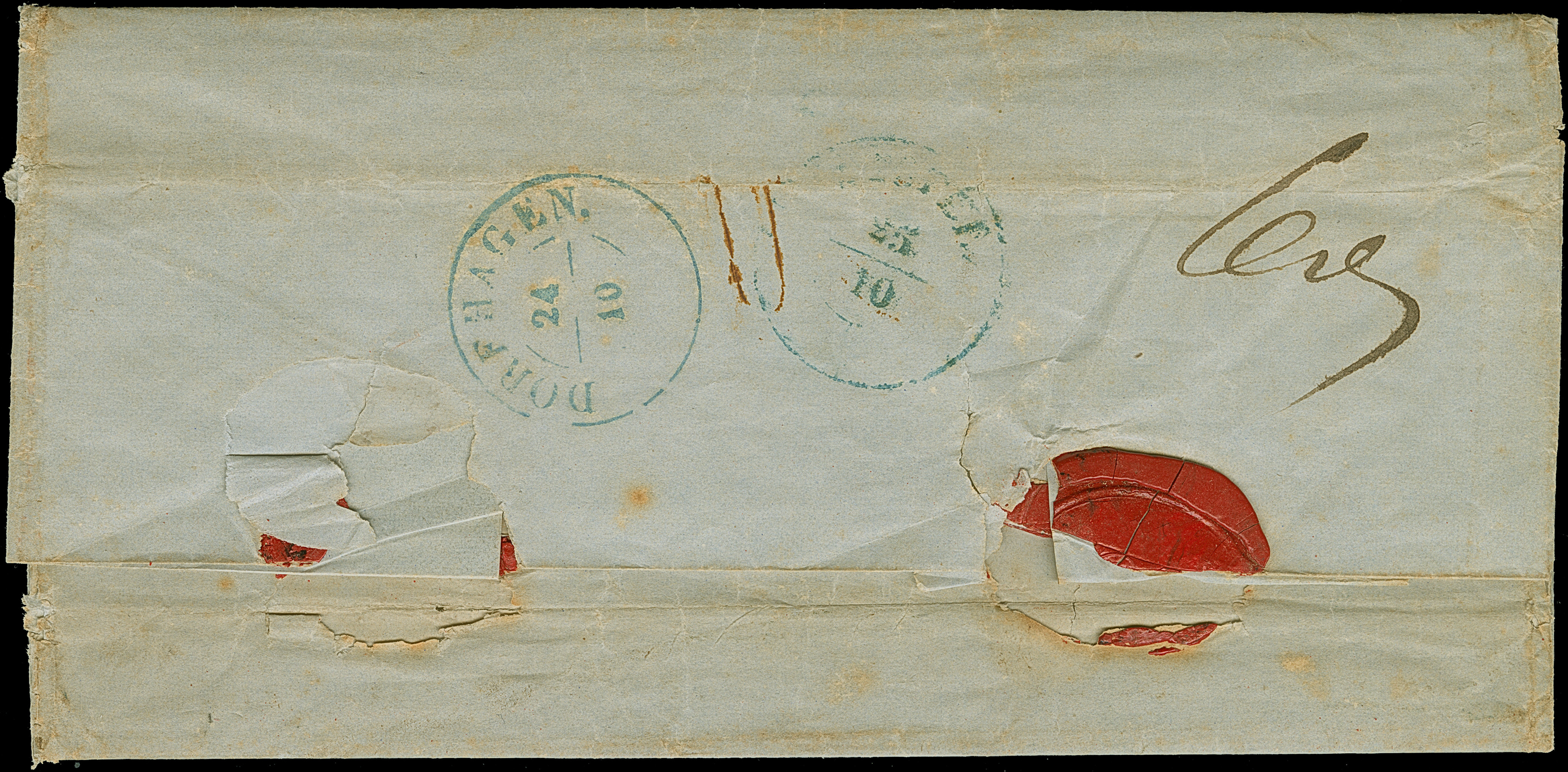 1/30 Th. auf blau, Type III, allseits voll- bis breitrandig geschnitten mit blauem Rahmenstempel “ATENS 13.4.” auf Briefkuvert mit blauem Tax-Vermerk “4½” (Sgr.), rotem Ra1 “PAID.” und Tax-Stempel “10” (Cents) via Bremen und New York nach Washington. Die Freimarke stellt die Postvereinstaxe bis Bremen dar, das Weiterfranko in Höhe von 4½ Sgr. wurde vom Absender bar bezahlt. Die farbfrische Marke ist in tadelloser Erhaltung, kleine Öffnungsmängel links oben im Umschlag wurden verklebt bzw. ergänzt. Ein seltener Überseebrief mit geteilter Francoabgeltung aus bekannter Korrespondenz, Fotoattest Stegmüller BPP (2022)