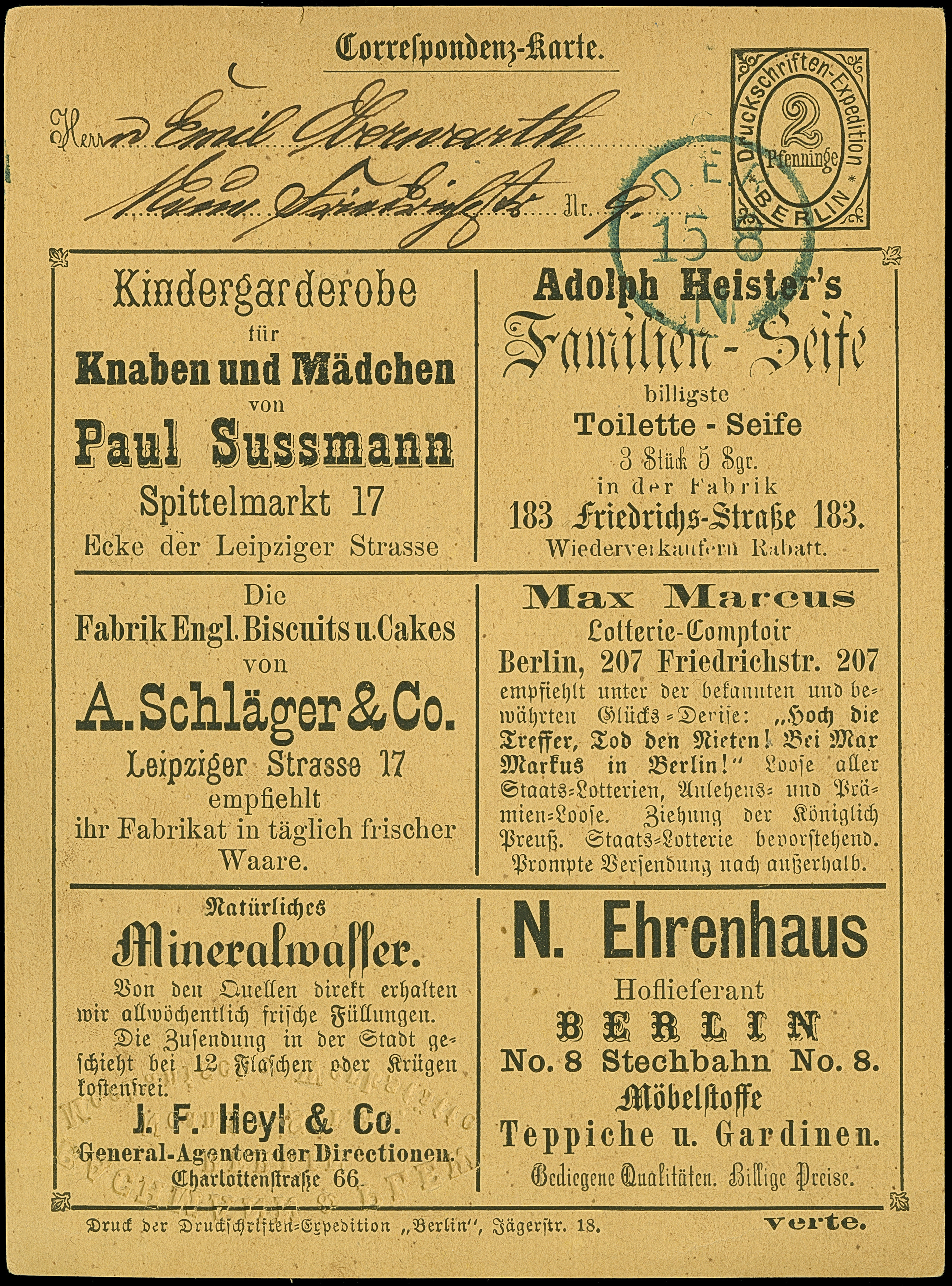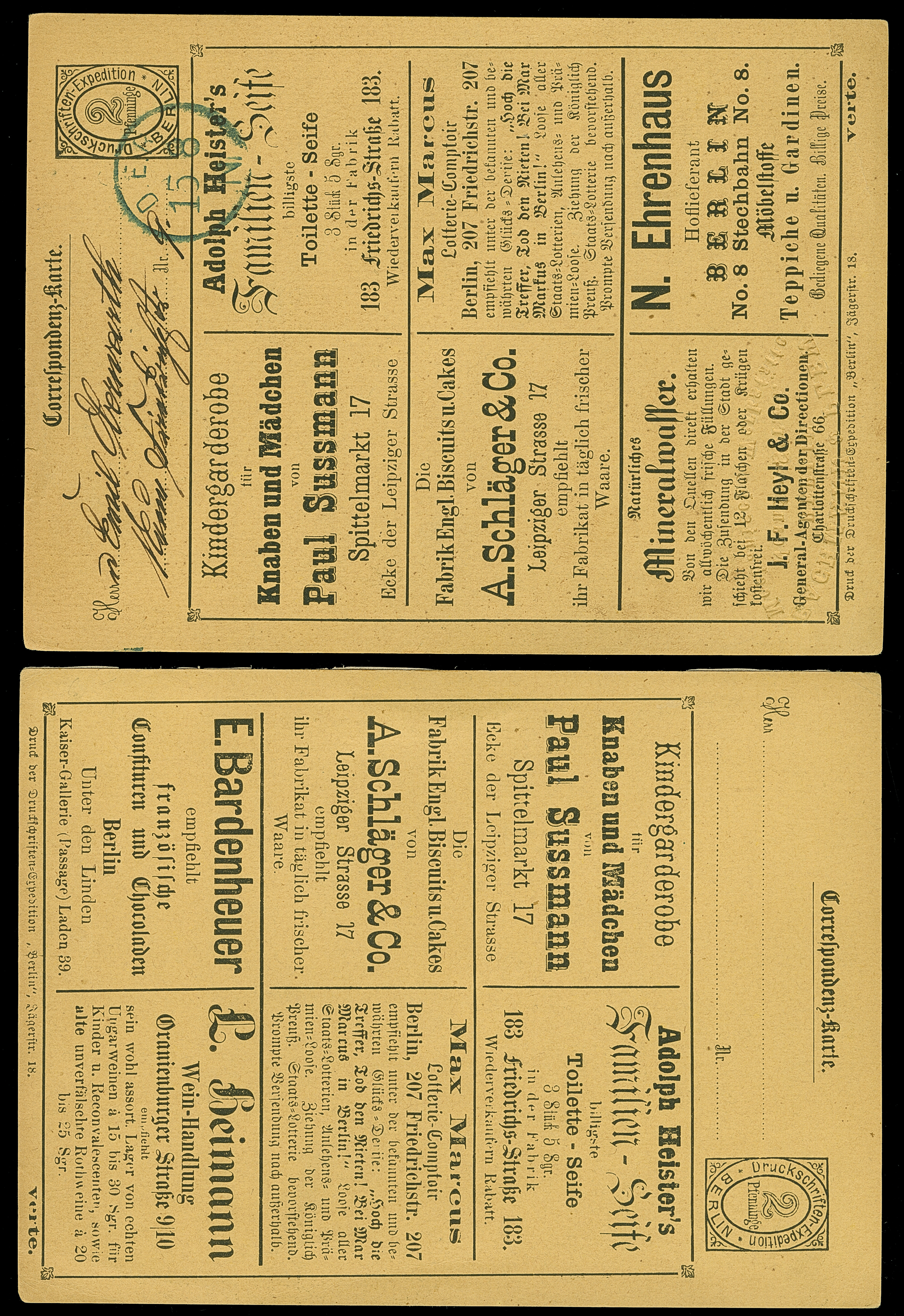 Brief- und Druckschriften-Expedition: 1873, Ganzsachenkarte 2 Pfg. mit Anzeigen in der Zusammenstellung II ungebraucht und einmal in der Zusammenstellung III gebraucht mit blauem Stempel “DER 15.8.” mit viel Text und Prägestempel der Firma "Bachmann & Plew, kleine Randspuren