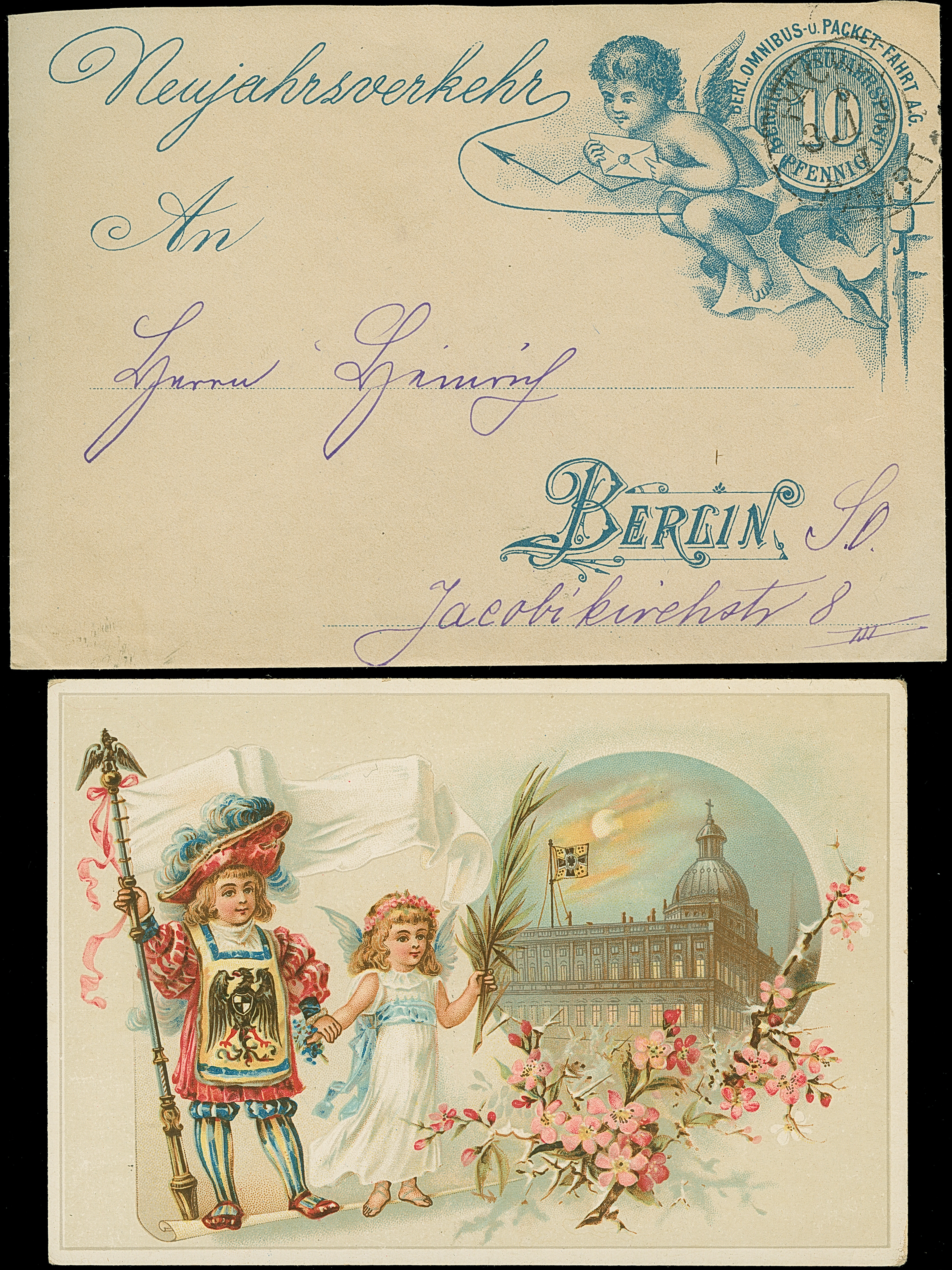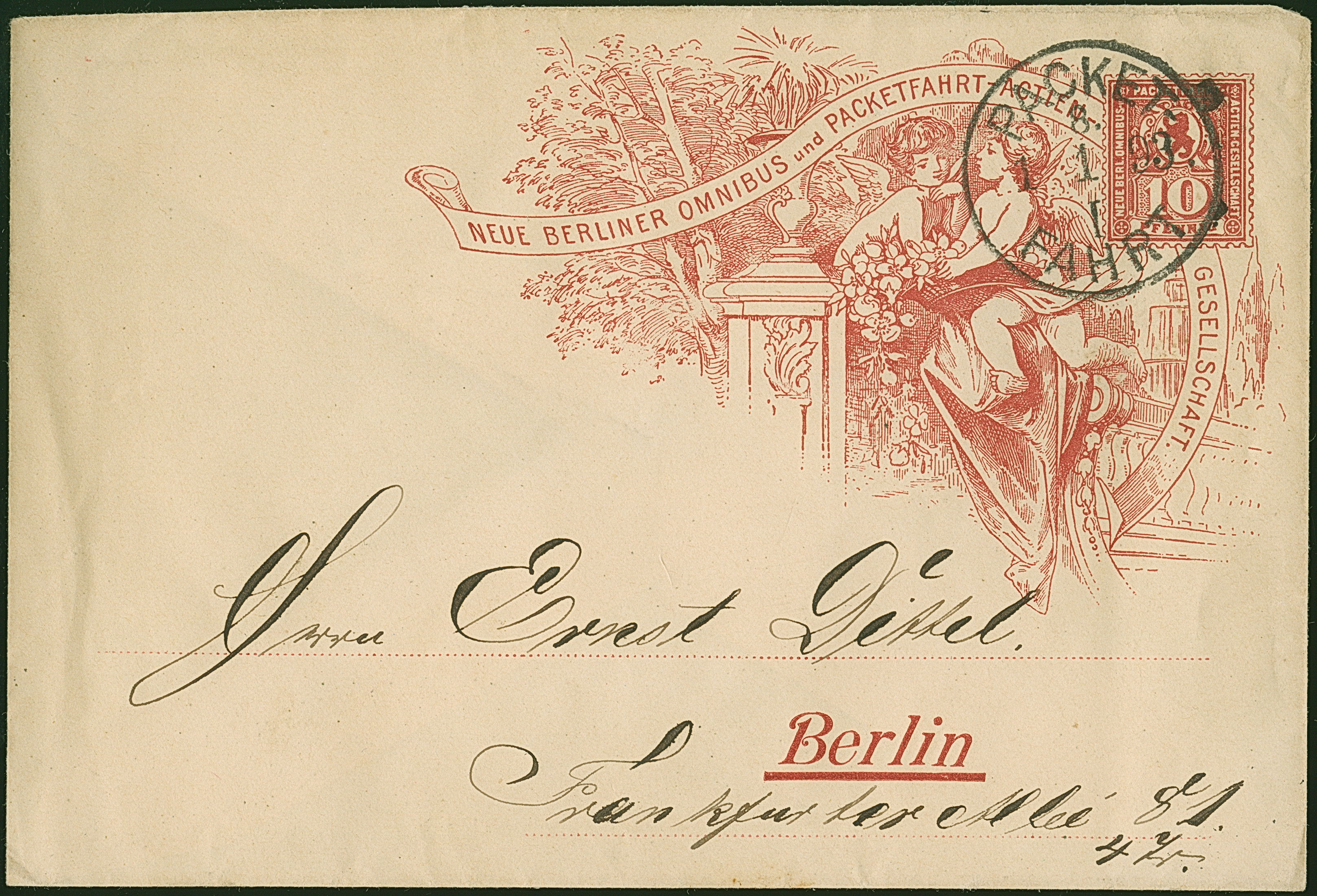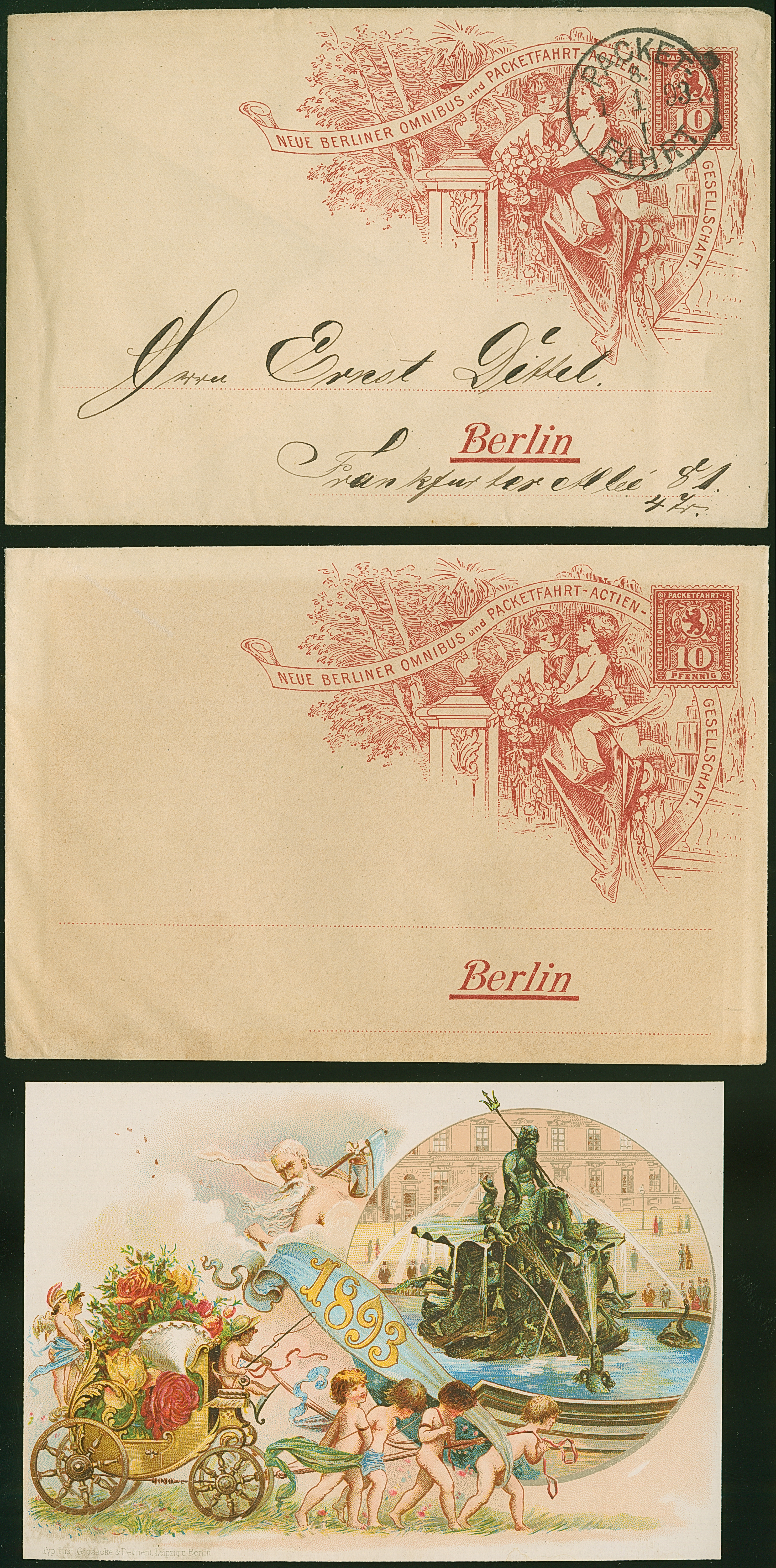 Berliner Packetfahrt-Gesellschaft: 1892, Ganzsachen-Glückwunschumschlag 10 Pfg.rot, einmal ungebraucht und einmal gebraucht mit Stempel “PAKET FAHRT 1.1.93”. Dazu einmal die Einlage “Kinder ziehen Kutsche, Brunnen”, der gebrauchte Umschlag rückseitig mit Öffnungsfehler, ansonsten in guter Erhaltung