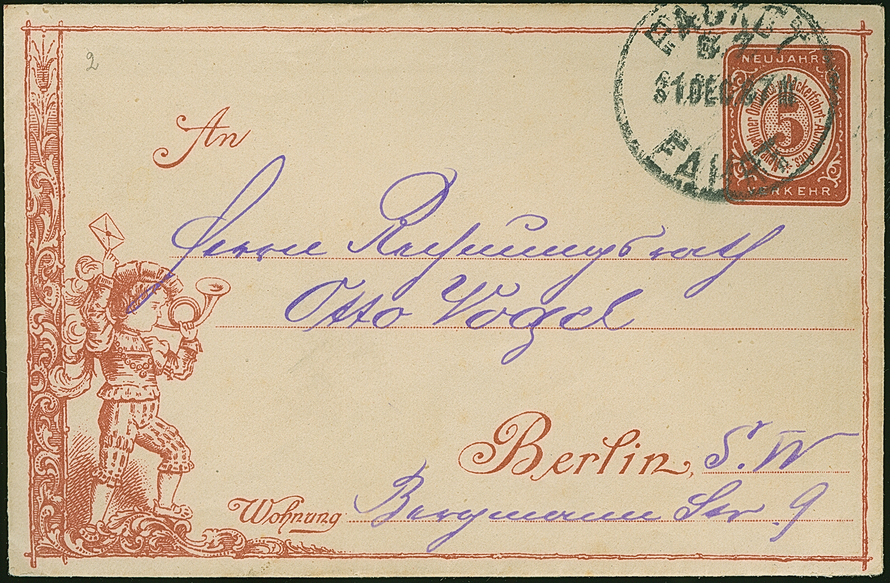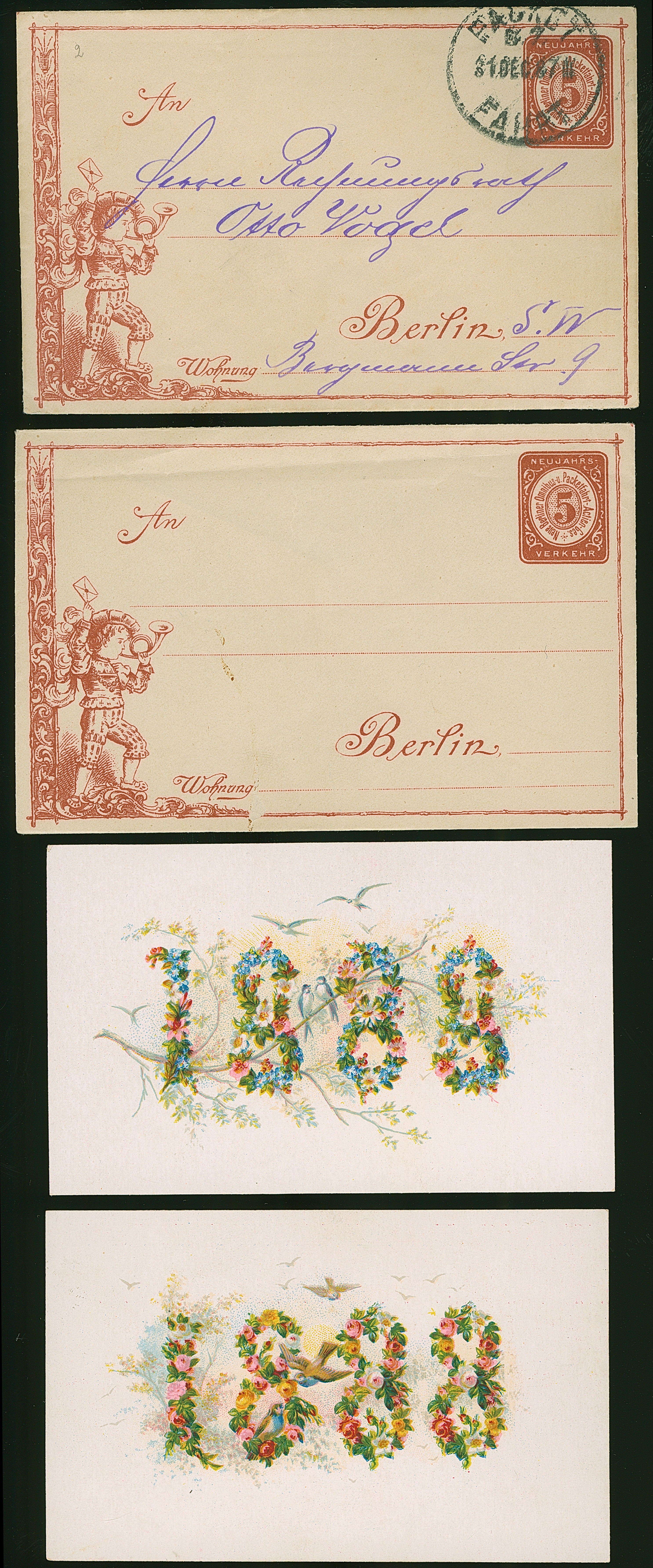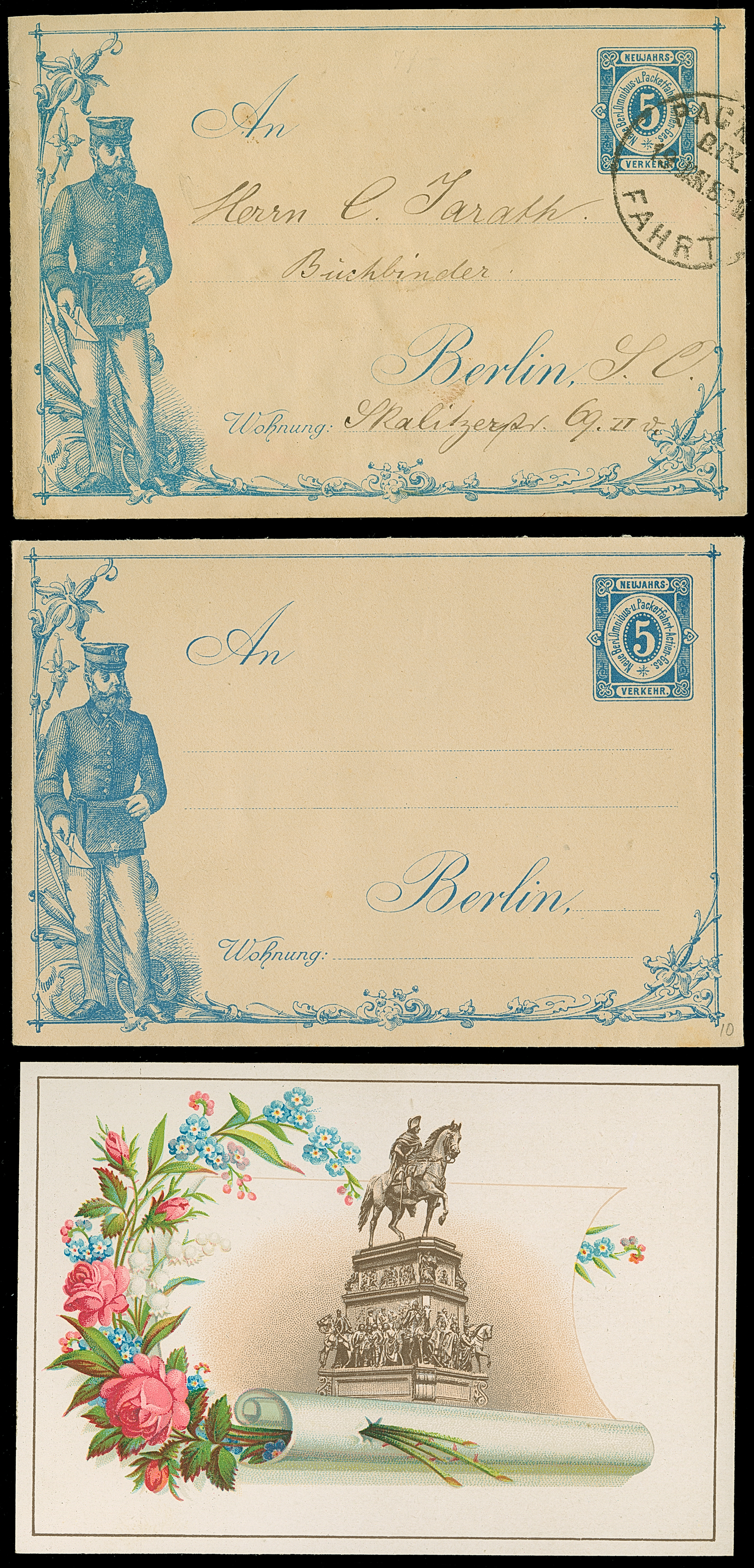 Berliner Packetfahrt-Gesellschaft: 1892, Ganzsachen-Glückwunschumschlag 10 Pfg.rot, einmal ungebraucht und einmal gebraucht mit Stempel “PAKET FAHRT 1.1.93”. Dazu einmal die Einlage “Kinder ziehen Kutsche, Brunnen”, der gebrauchte Umschlag rückseitig mit Öffnungsfehler, ansonsten in guter Erhaltung