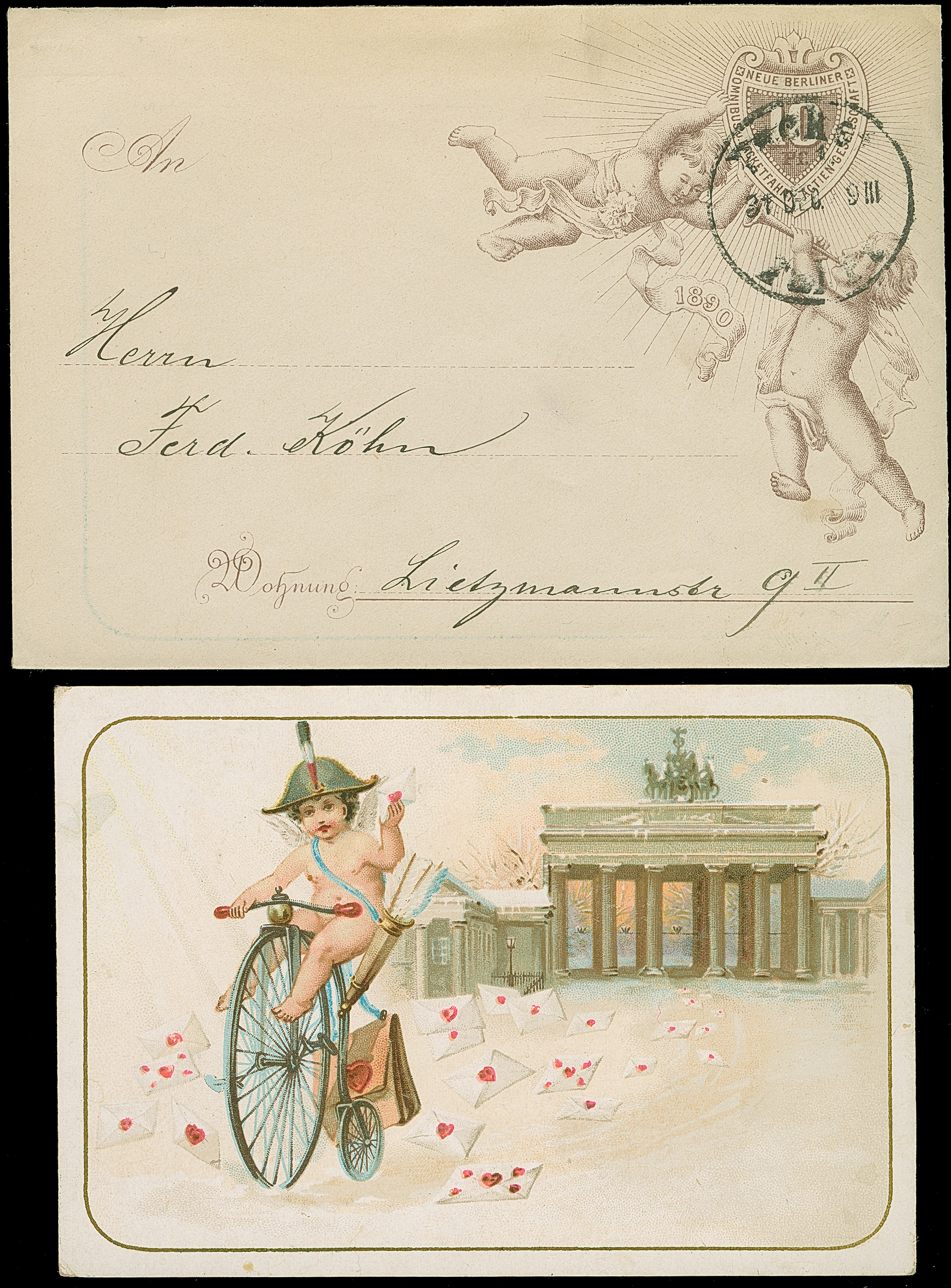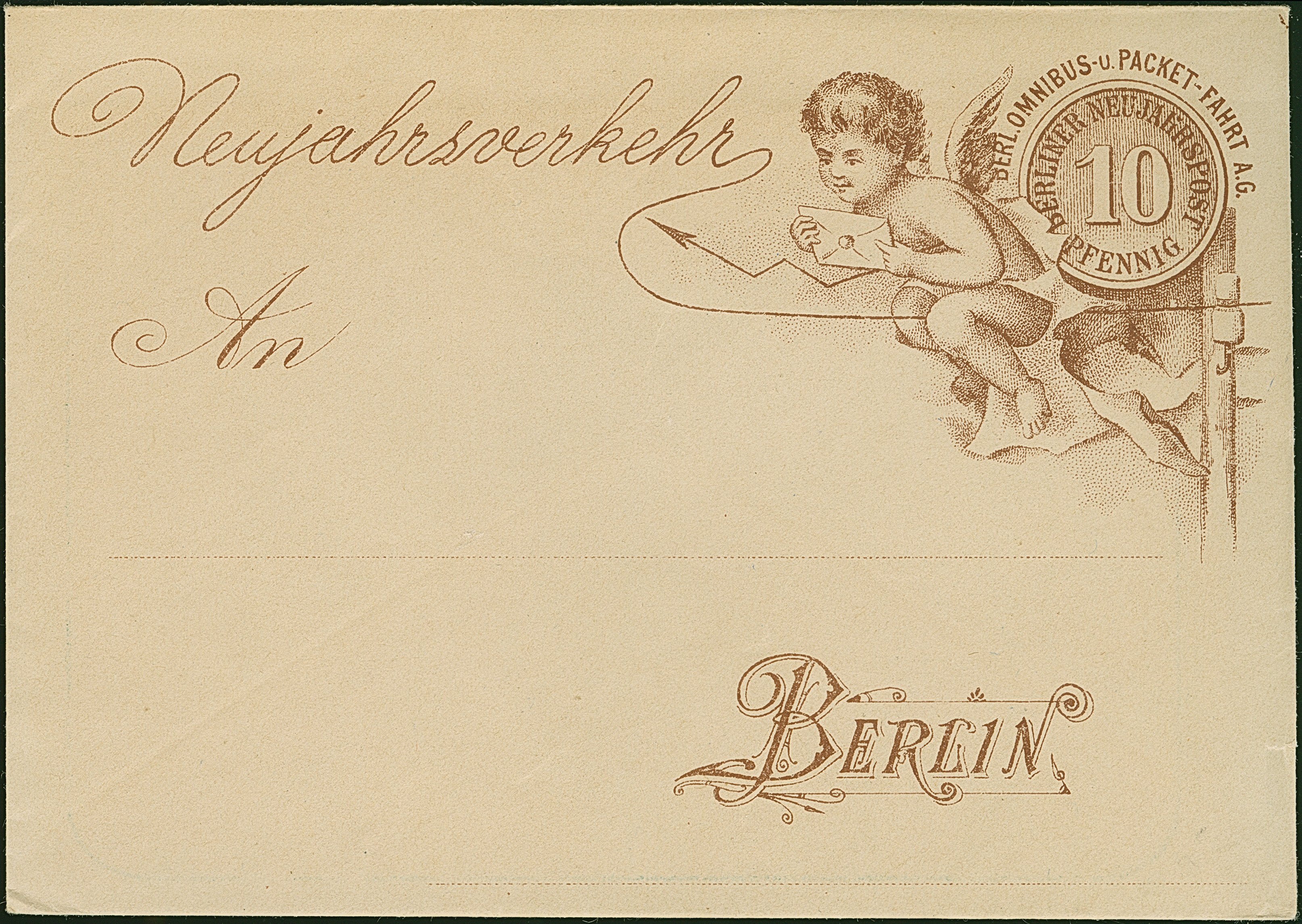 Berliner Packetfahrt-Gesellschaft: 1889, Ganzsachen-Glückwunschumschlag 10 Pfg. braun mit Einlage “Amor auf Hochrad vor dem Brandenburger Tor”, gebraucht mit Stempel “PAKET FAHRT 31.DEC.89”, leichte Spuren, in guter Erhaltung
