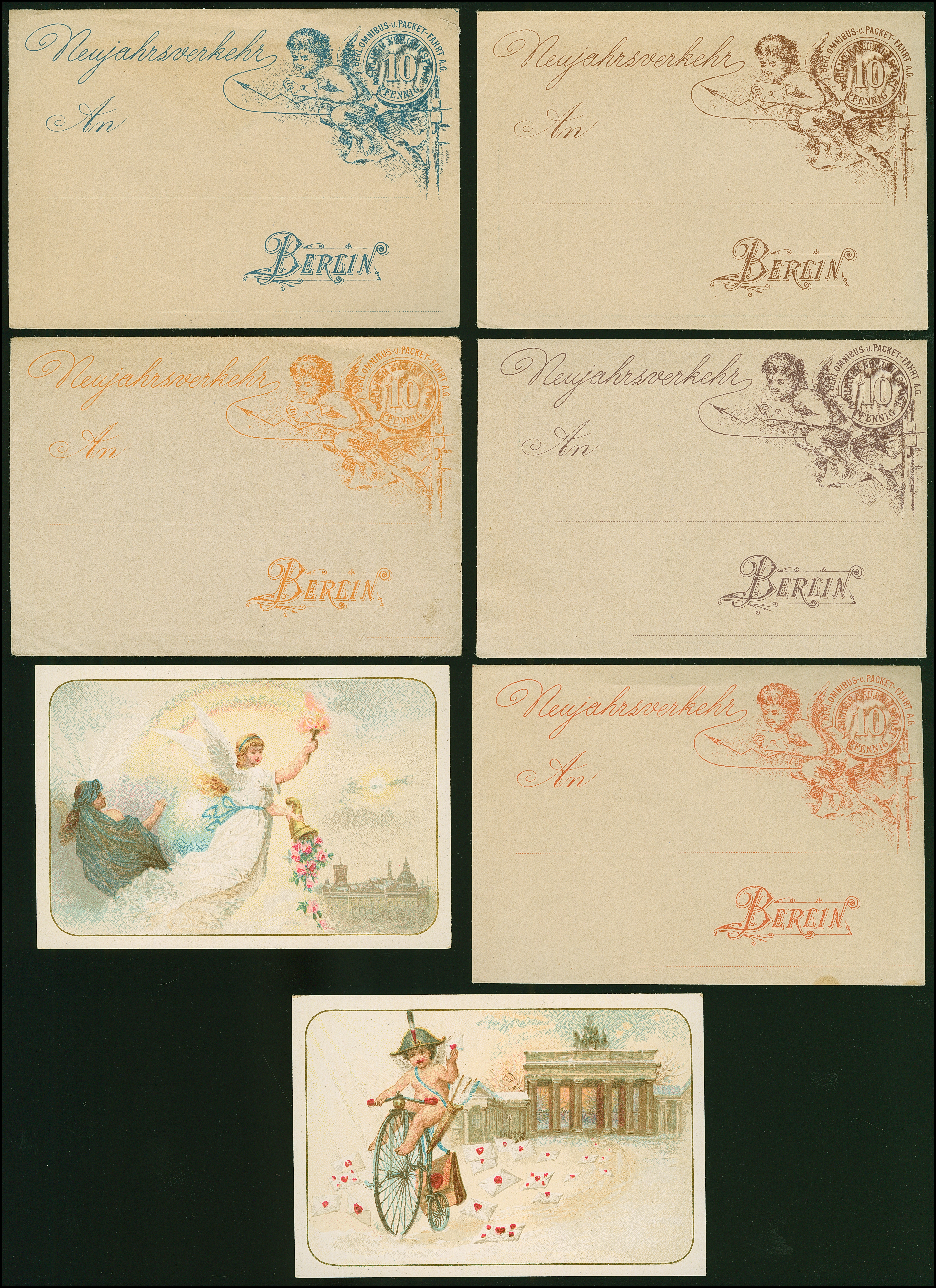Berliner Packetfahrt-Gesellschaft: 1890, Ganzsachen-Glückwunschumschlag 10 Pfg. blau bis braun, alle fünf verschiedenen Umschläge komplett, ungebraucht, zum Teil mit kleinen Randspuren. Dazu die beiden Einlagen der Ausgabe 1899