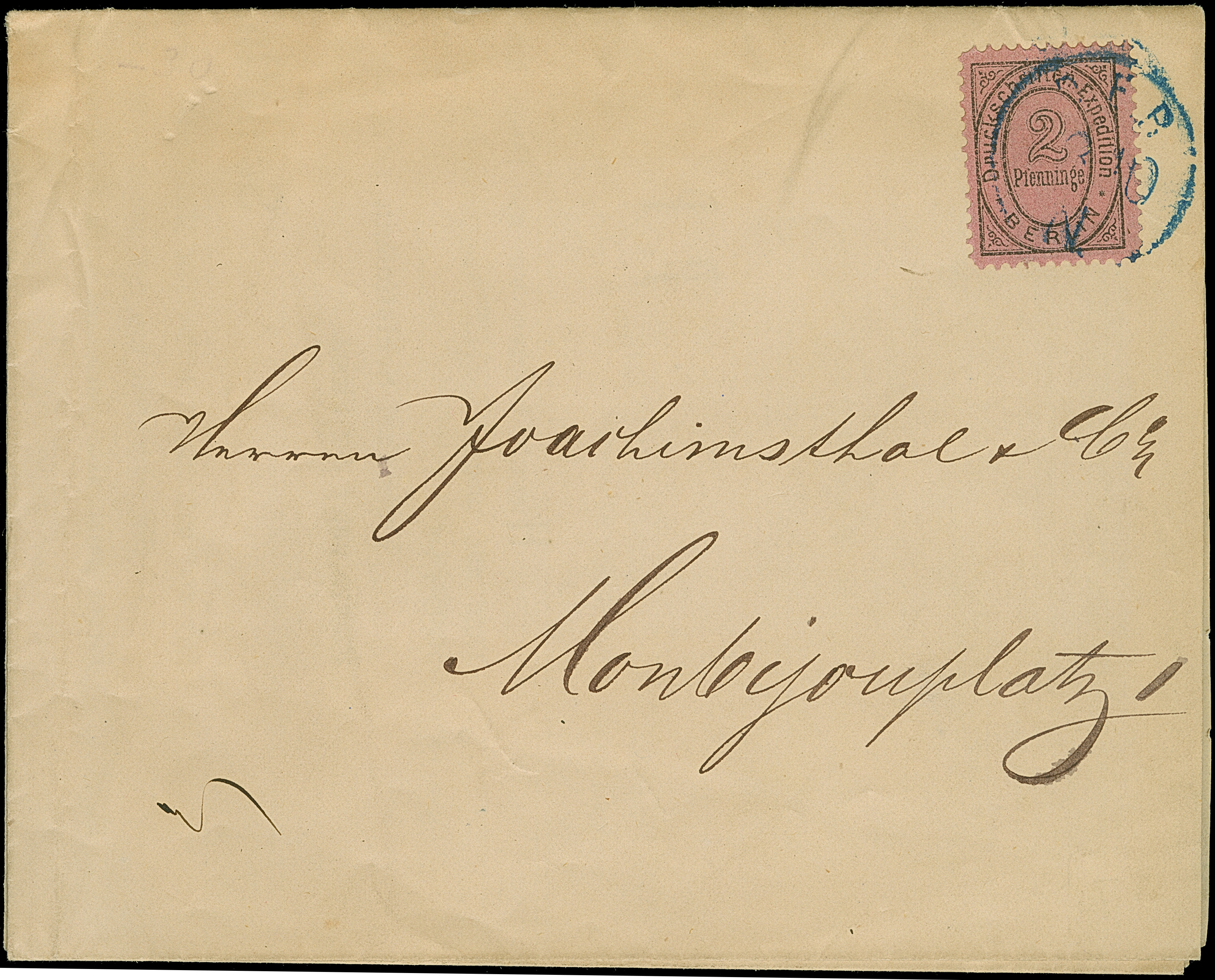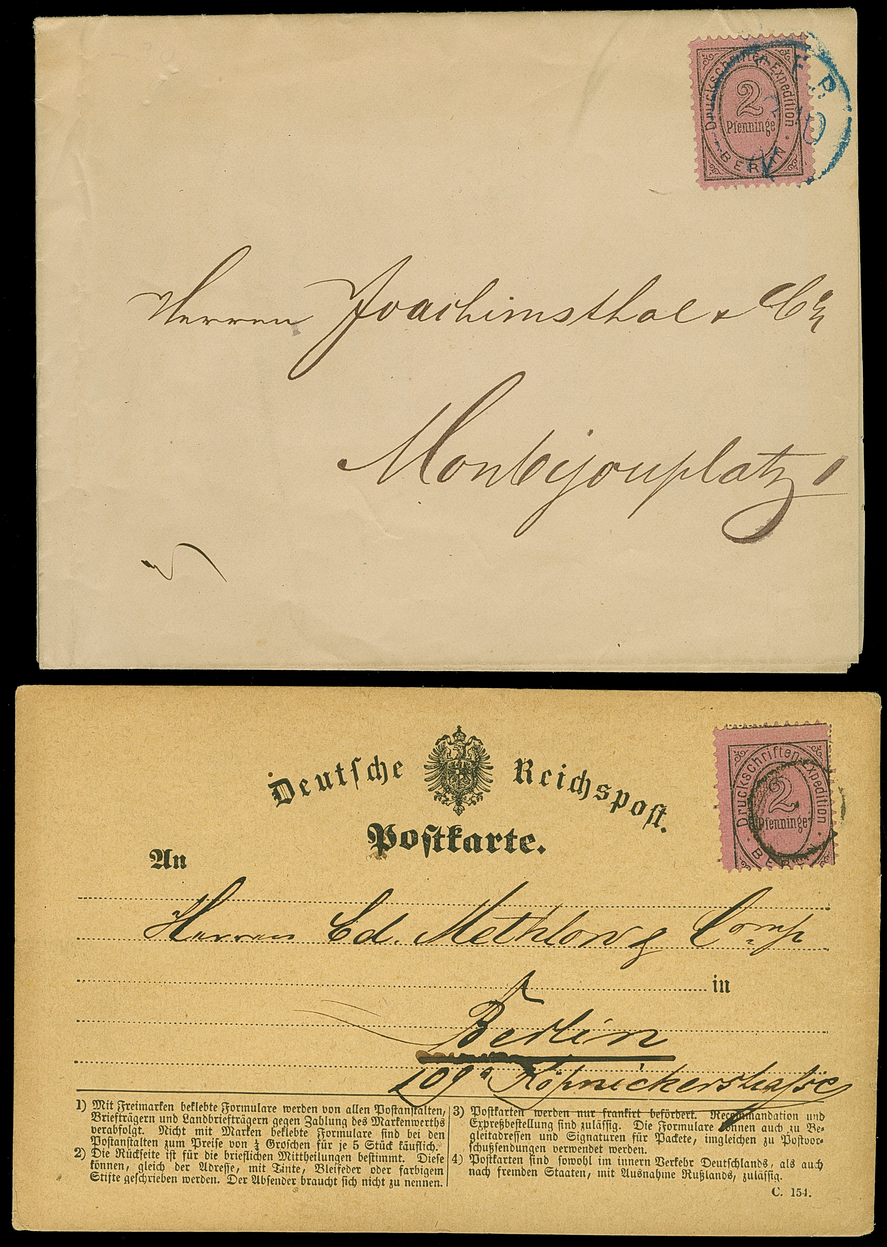 Brief- und Druckschriften-Expedition: 1873, 2 Pfg. schwarz auf trübrosa mit EKr.-Stempel ohne Inschriften auf amtlicher Reichspost-Vordruckkarte mit Text und Datierung vom 25.7.1873, dazu Drucksachen-Faltbrief mit 2 Pfg. und blauem EKr. “D.E.B. 4.10.(73)”, leichte Randspuren, ansonsten in guter Erhaltung