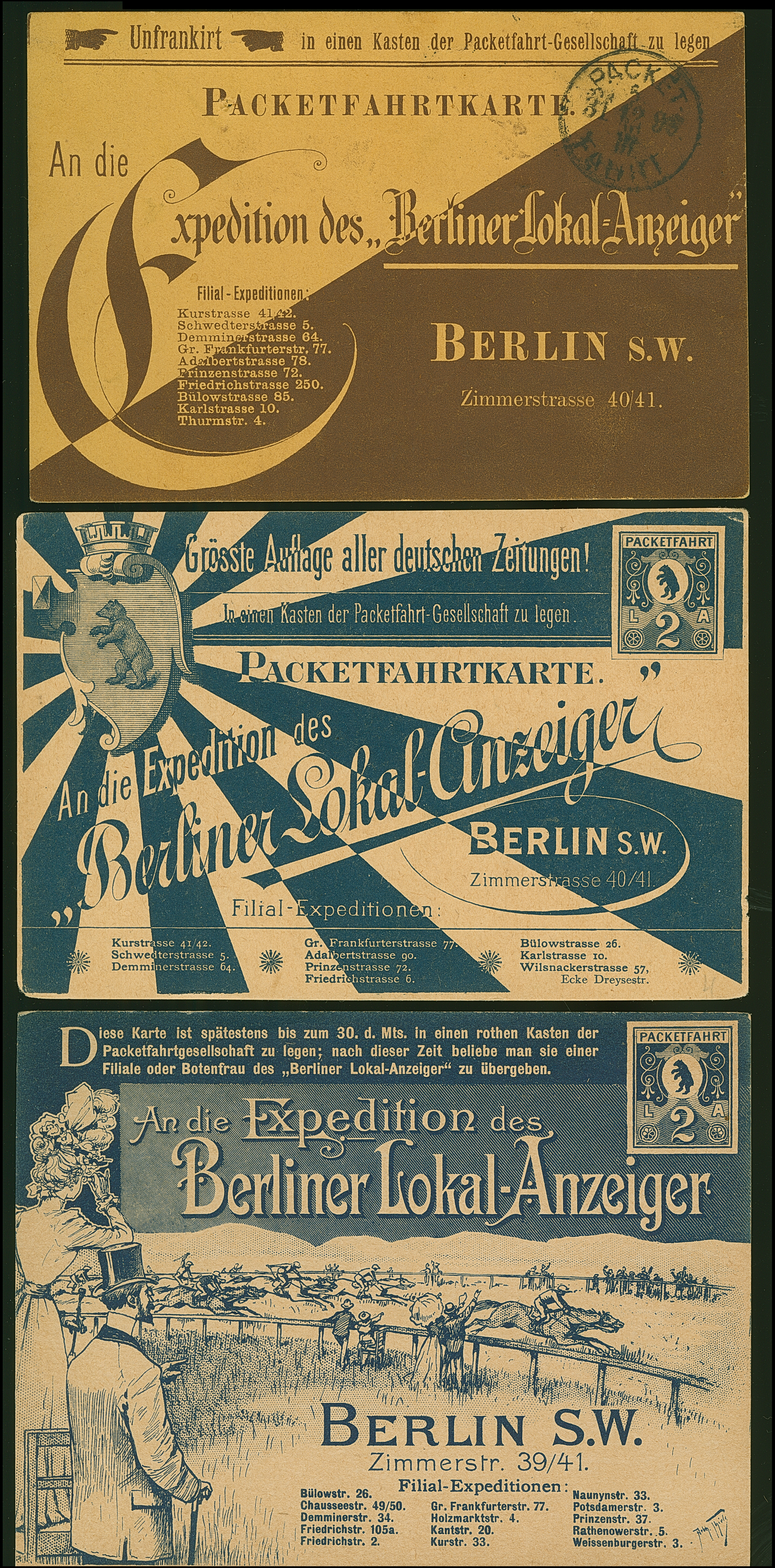 Berliner Paketfahrt-Gesellschaft: 1891/99, Ganzsachenkarte auf Privat-Bestellung 2 Pfg. blauschwarz “Berliner Lokal-Anzeiger” mit Abbildung “Berliner Wappen” und 2 Pfg. dunkelblau mit Abbildung “Pferderennen mit Zuschauern”, jeweils ungebraucht. Dazu Formular auf Privatbestellung ohne Wertstempel in Braun und Gelb (ähnlich PPF124) gebraucht mit Stempel “PACKET FAHRT 31.12.99”, in guter Erhaltung, selten