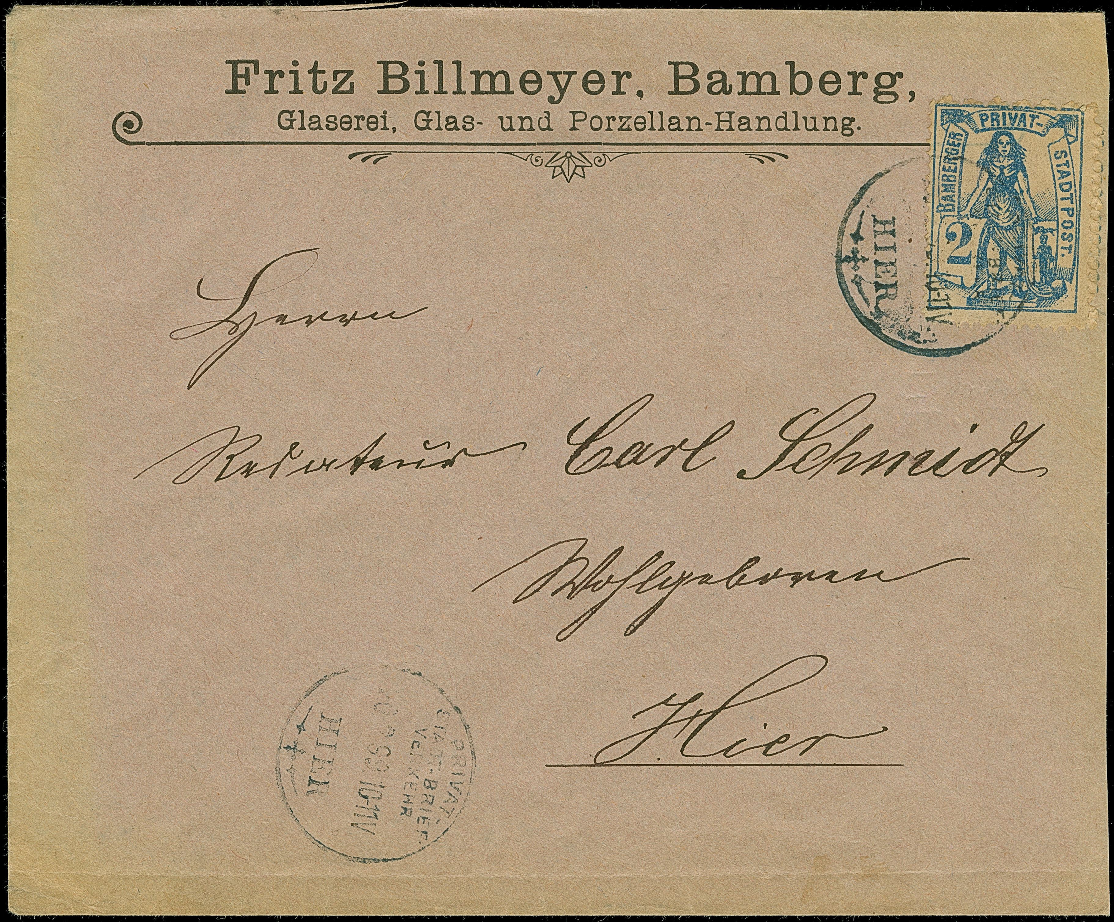 Bamberg-Privat-StadtBrief-Verkehr: 1897, 2 Pfg. blau auf rauem Papier mit Stempel “PRIVAT-STADT-BRIEF-VERKEHR 20.2.99 HIER” auf Firmenvordruckbrief “Fritz Billmeyer, Bamberg” im Ortsverkehr, in guter Erhaltung