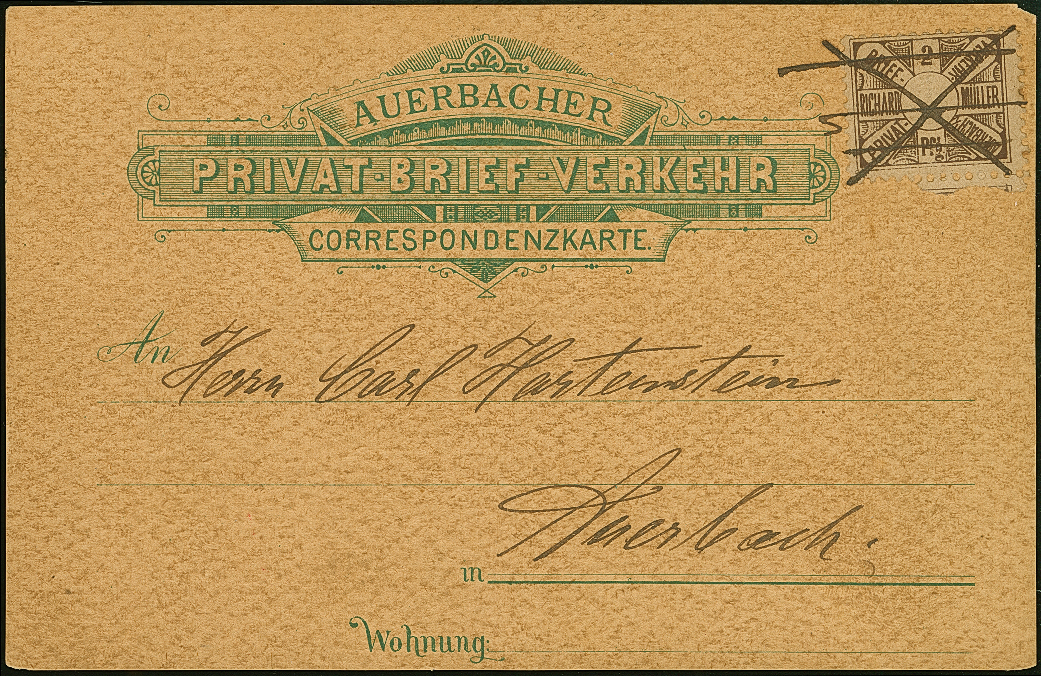 Auerbach-Express-Paketverkehr und Privat-Verkehr: 1887, 2 Pfg. graulila mit Federstrich-Entwertung auf Postkarten-Vordruckkarte in Grün und viel Text mit e. Unterschrift des Besitzers des Express-Paketverkehr und Privat-Verkehr-Dienst Richard Müller und selbst befördert an den Adressaten, in guter Erhaltung. Eine der ganz seltenen Verwendungen auf Postkarten