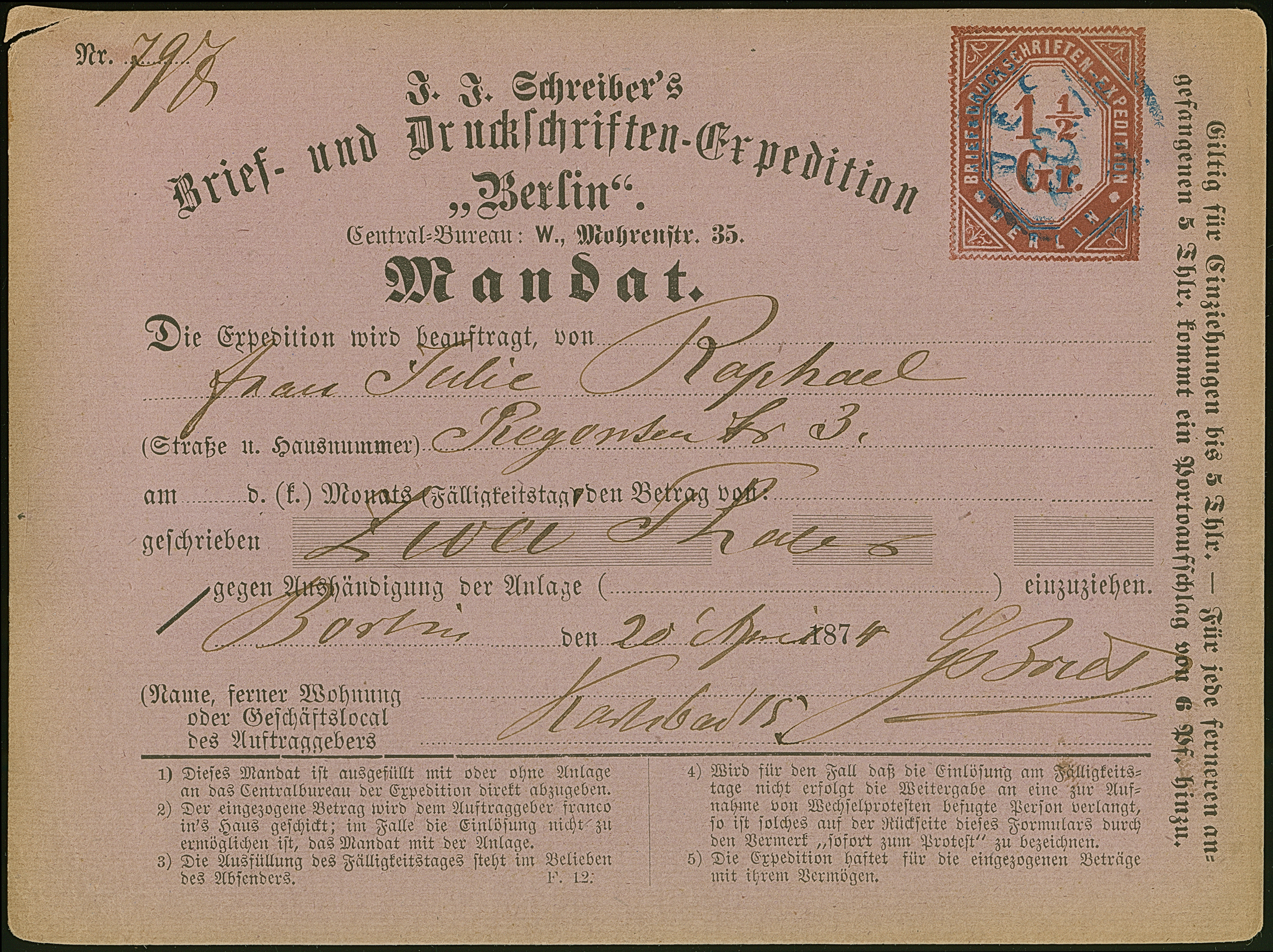 Brief- und Druckschriften-Expedition: 1873, Ganzsachen-Auftragskarte “Mandat” 1½ Gr. in Type II über zwei Thaler mit blauem Stempel “DER 20.4.(84)”. Rückseitig kleine Papierreste, in guter Erhaltung