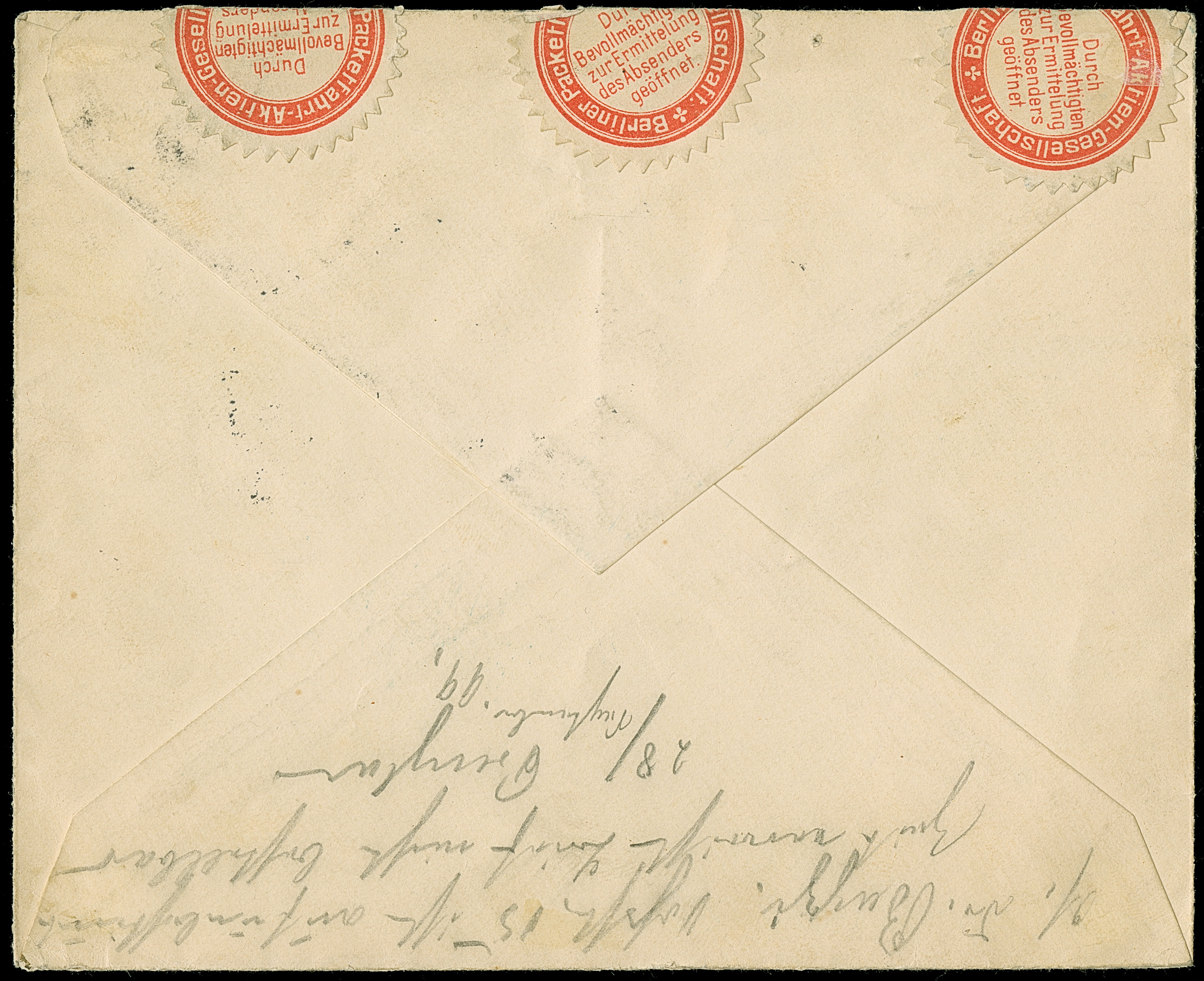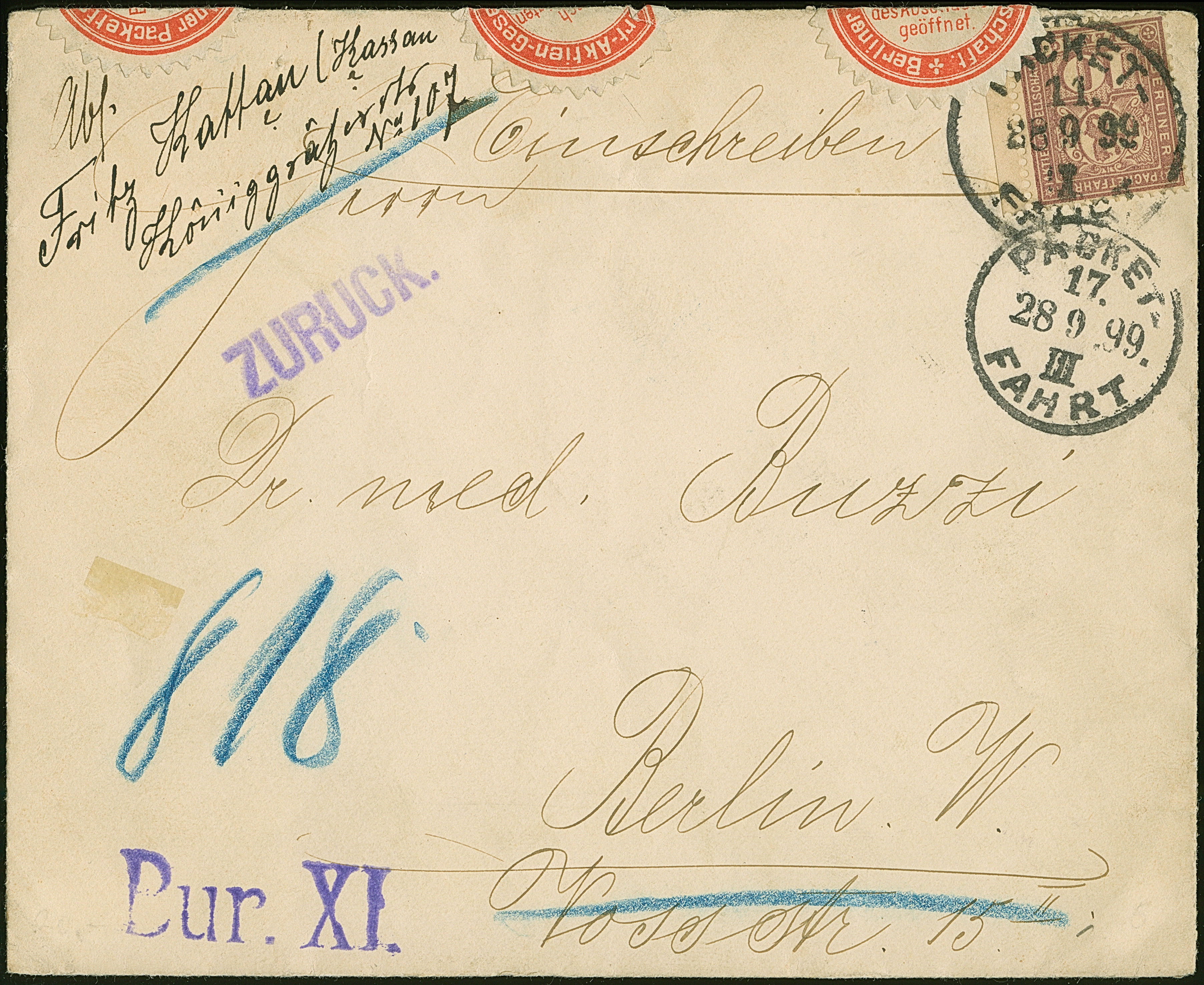 Berliner Packetfahrt Gesellschaft: 1896, 10 Pfg. braunlila mit Stempel "PACKET-FAHRT III 17. 28.9.00, Randstück auf R-Ortsbrief und retour mit entsprechendem Vermerk und Stempel. Da der Brief ohne Absender ist, wurde der Brief geöffnet und der Absender notiert und der Brief mit drei Verschlussmarken der Berliner Packetfahrt Aktien-Gesellschaft (durchtrennt) verschlossen, in guter Erhaltung