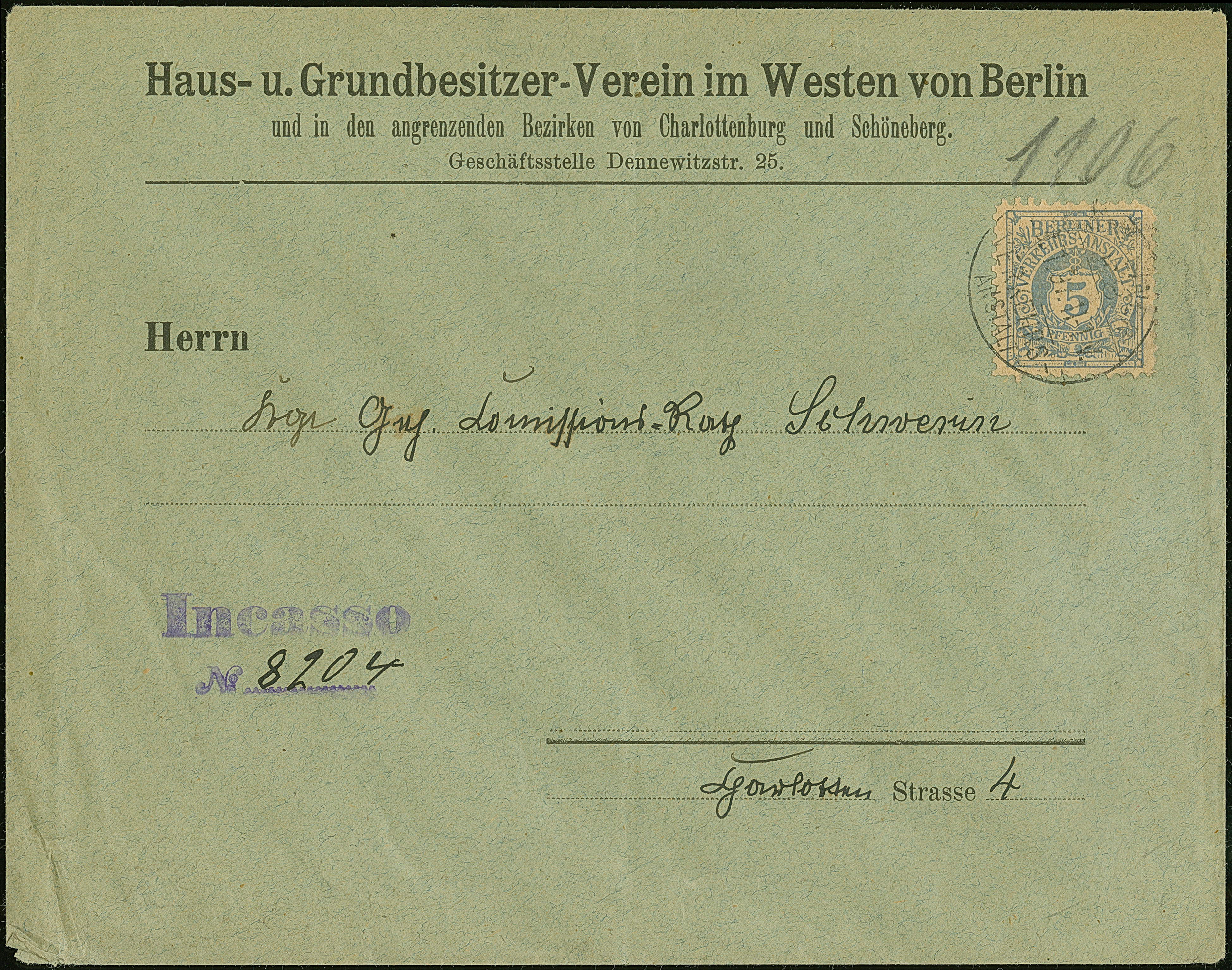 Berliner Verkehrs-Anstalt: 1895, 5 Pfg. ultramarin mit Stempel “BERLINER VERKEHRS-ANSTALT 5.1.97” auf R-Ortsbrief “Haus- und Grundbesitzer-Verein im Westen von Berlin” mit L2 “Incasso No….”. Die Marke ist rechts oben eckrund, ansonsten in guter Erhaltung. R-Briefe von dieser Gesellschaft sind sehr selten