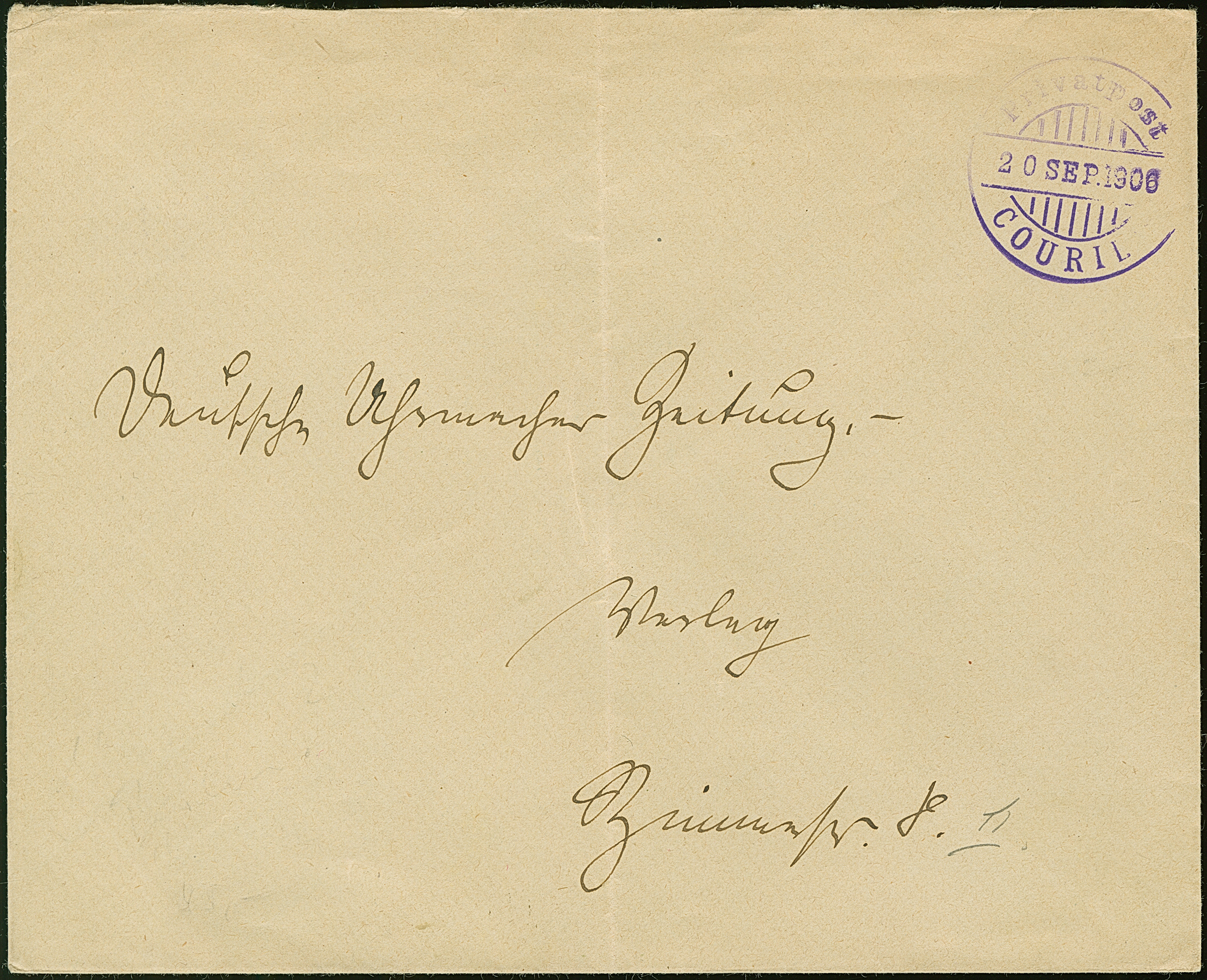 Privatpost Courier: 1906, Ortsbrief mit violettem Stempel “Privatpost COURIER 20. SEP.1906”, vermutlich für bar bezahlte Briefe. Der Umschlag mit senkrechter Faltung, ansonsten in guter Erhaltung