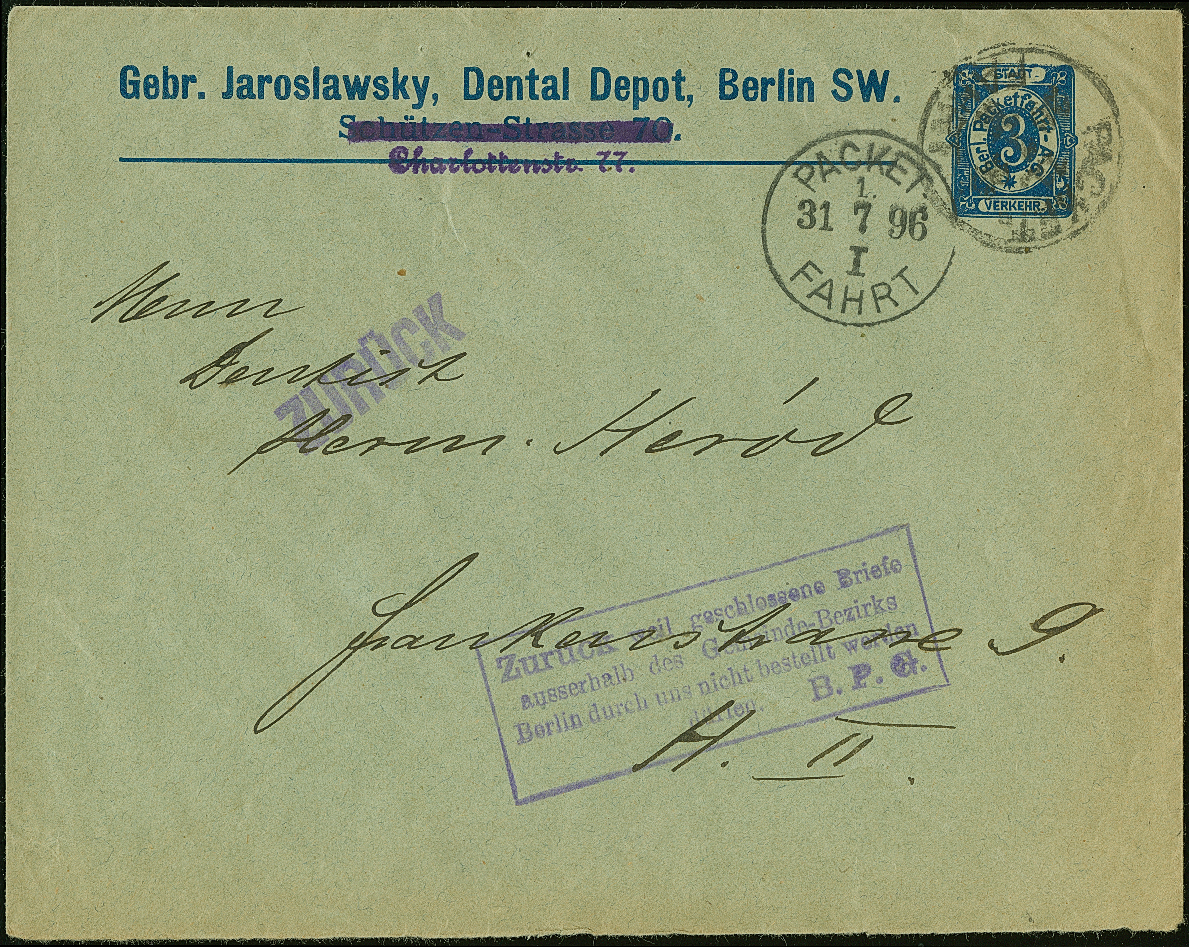 Berliner Packetfahrt: 1896, Ganzsachenumschlag 3 Pfg. blau der “Gebr. Jaroslawsky, Dental Depot, Berlin SW” mit Stempel “PACKET-FAHRT 31.7.96” als Ortsbrief und zurück mit Hinweisstempel “Zurück, weil geschlossene Briefe ausserhalb des Gemeinde-Bezirks Berlin durch uns nicht bestellt werden dürfen. B.P.G.”