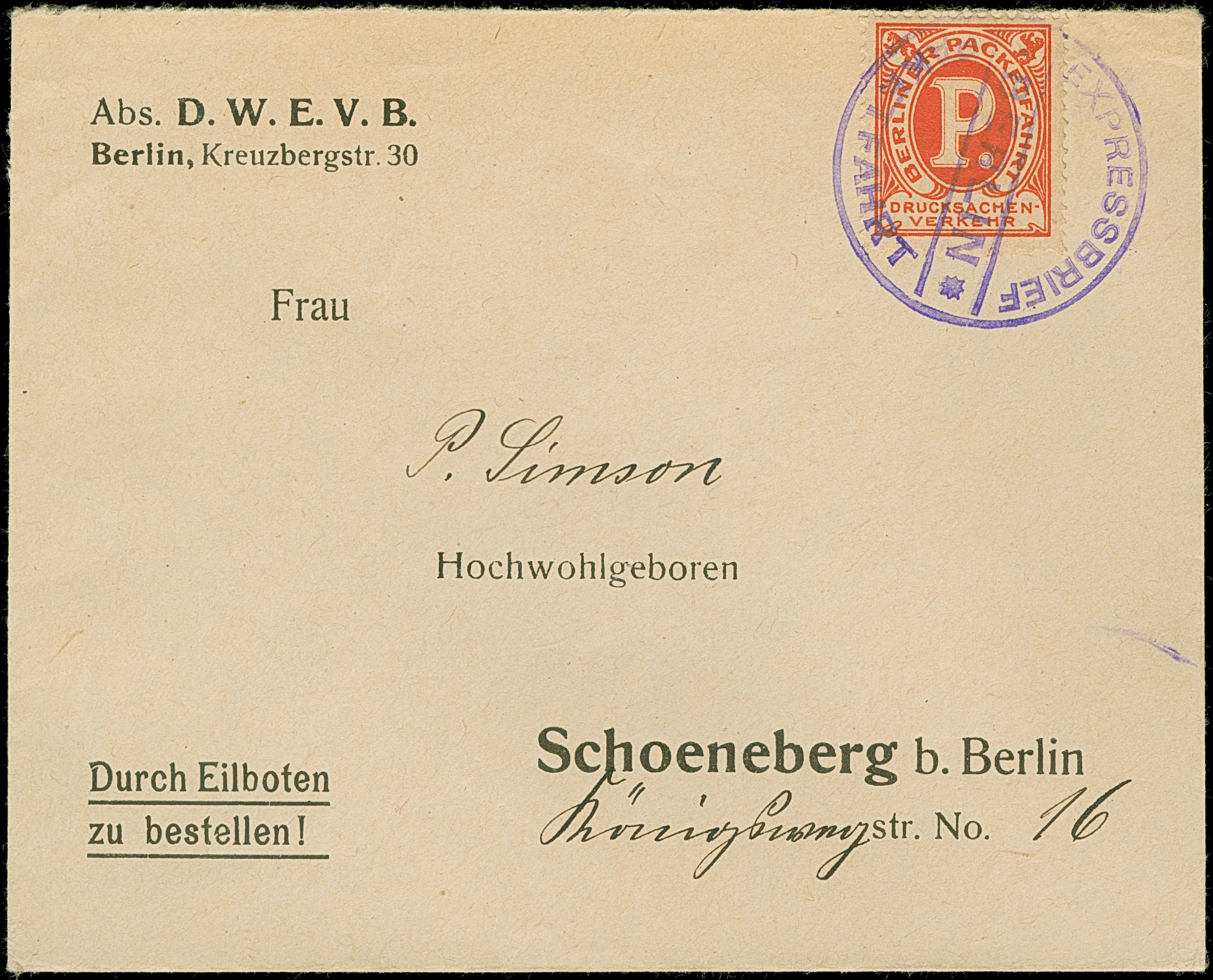 Berliner Paketfahrt-Gesellschaft: 1907, Drucksachen-Verkehr-Marke rot gez. 13¾:14 mit violettem Stempel “EXPRESSBRIEF PAKETFAHRT BERLIN” auf Vordruckbrief mit gedrucktem Vermerk “Durch Eilboten zu bestellen” nach Schöneberg, in guter Erhaltung