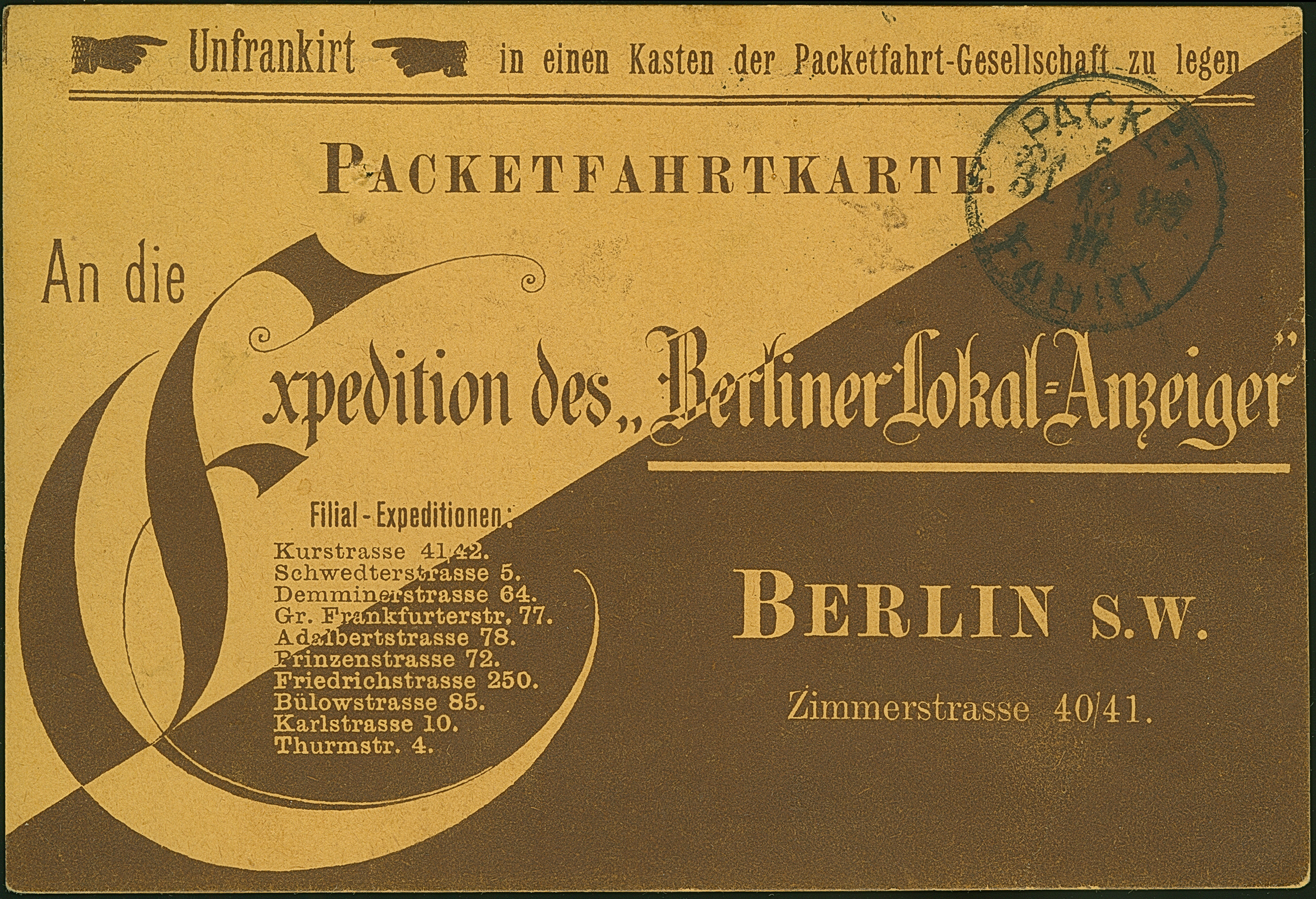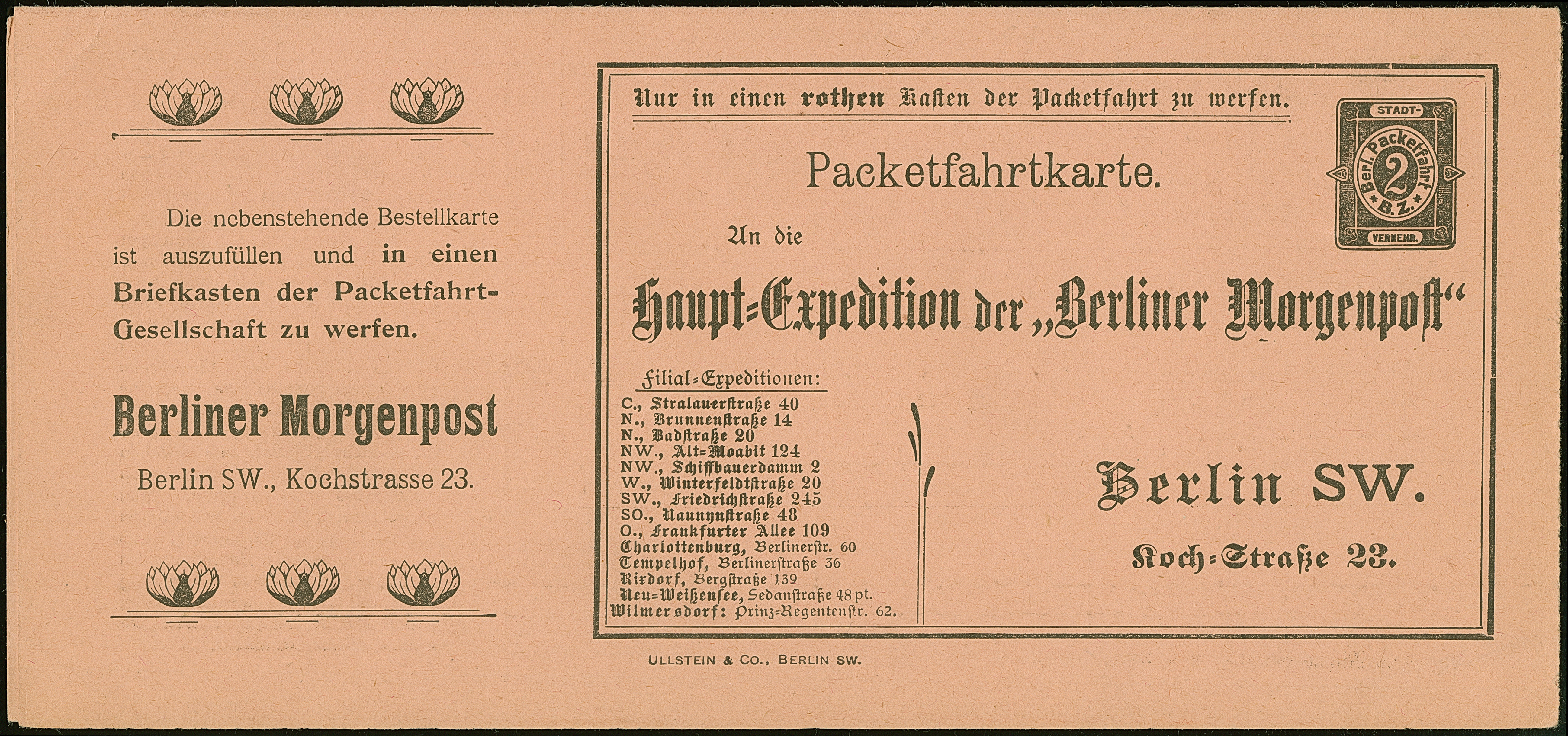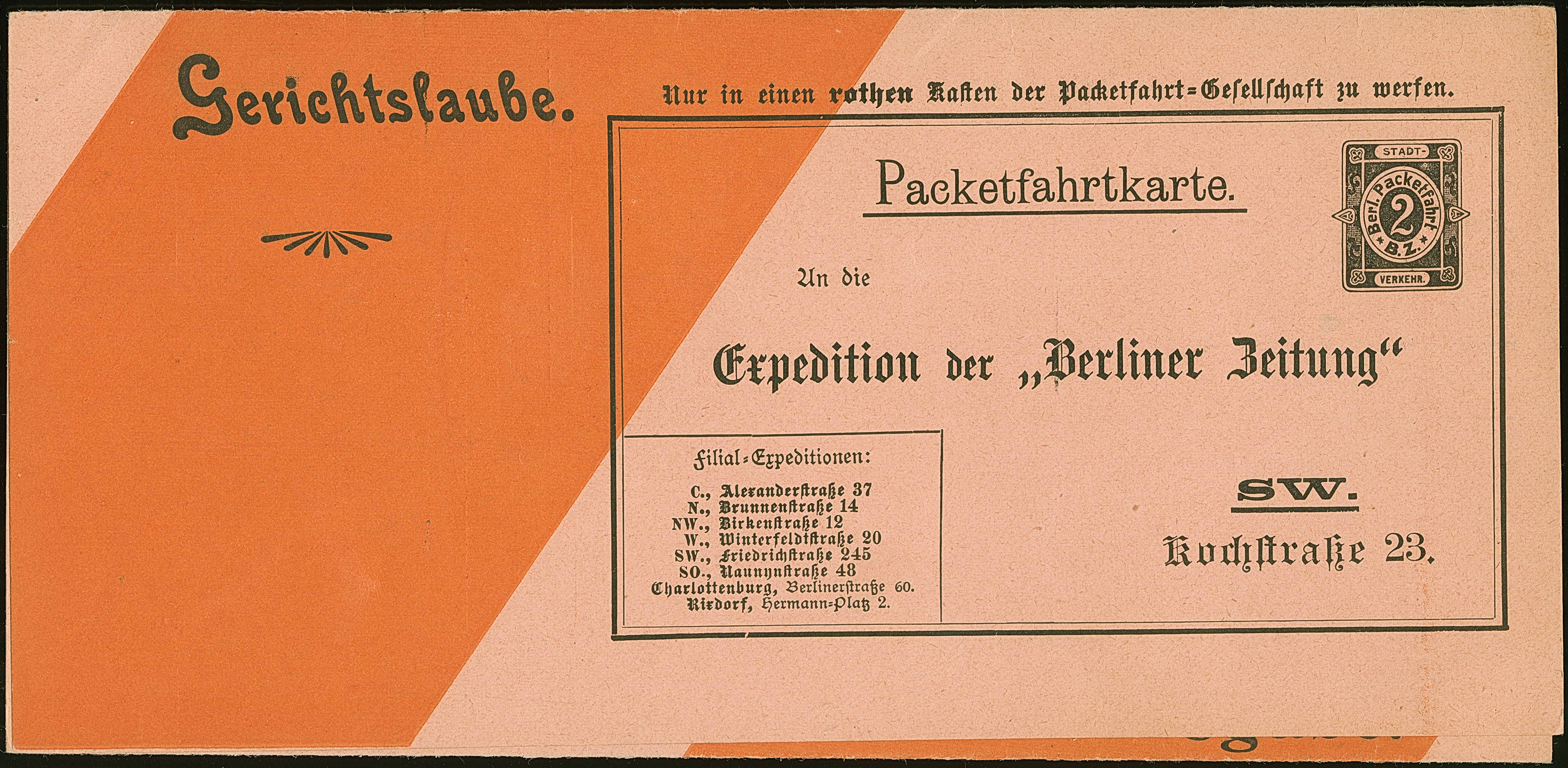 Berliner Packetfahrt-Gesellschaft: 1900 (ca.), Ganzsachenkarte auf Privat-Bestellung 2 Pfg. schwarz auf lachsfarben als Teil eines kompletten Werbeblattes der “Berliner Zeitung” mit schrägen Streifen. Das Werbeblatt wurde dreiteilig vorgefaltet und ist in einwandfreier Erhaltung. In dieser Form selten