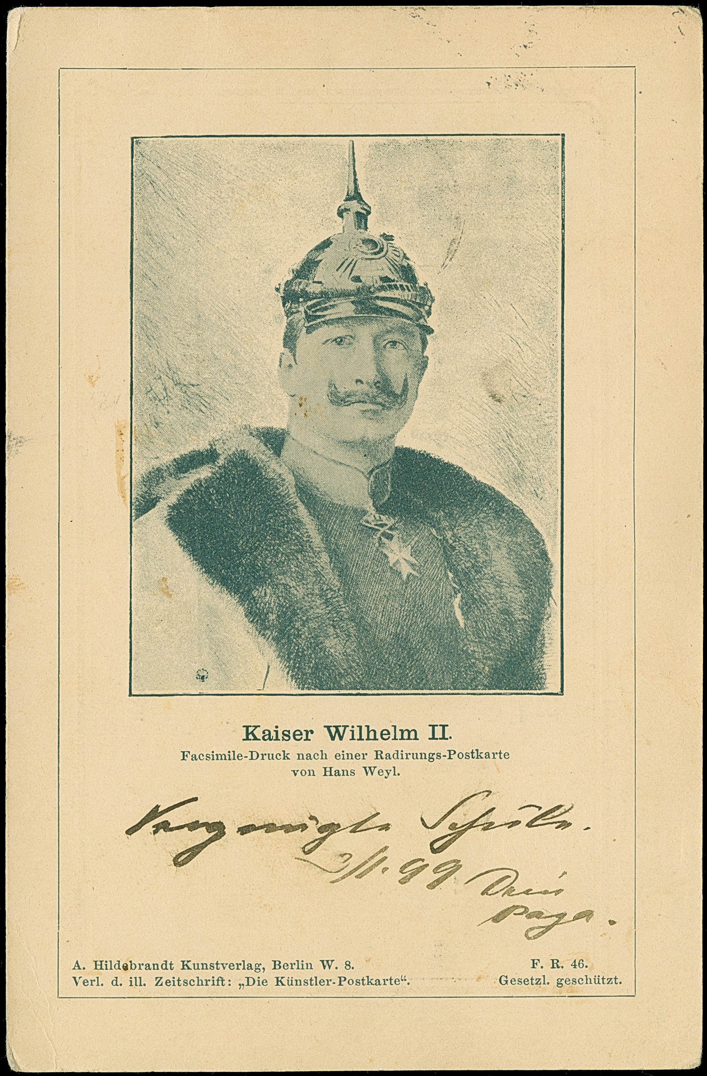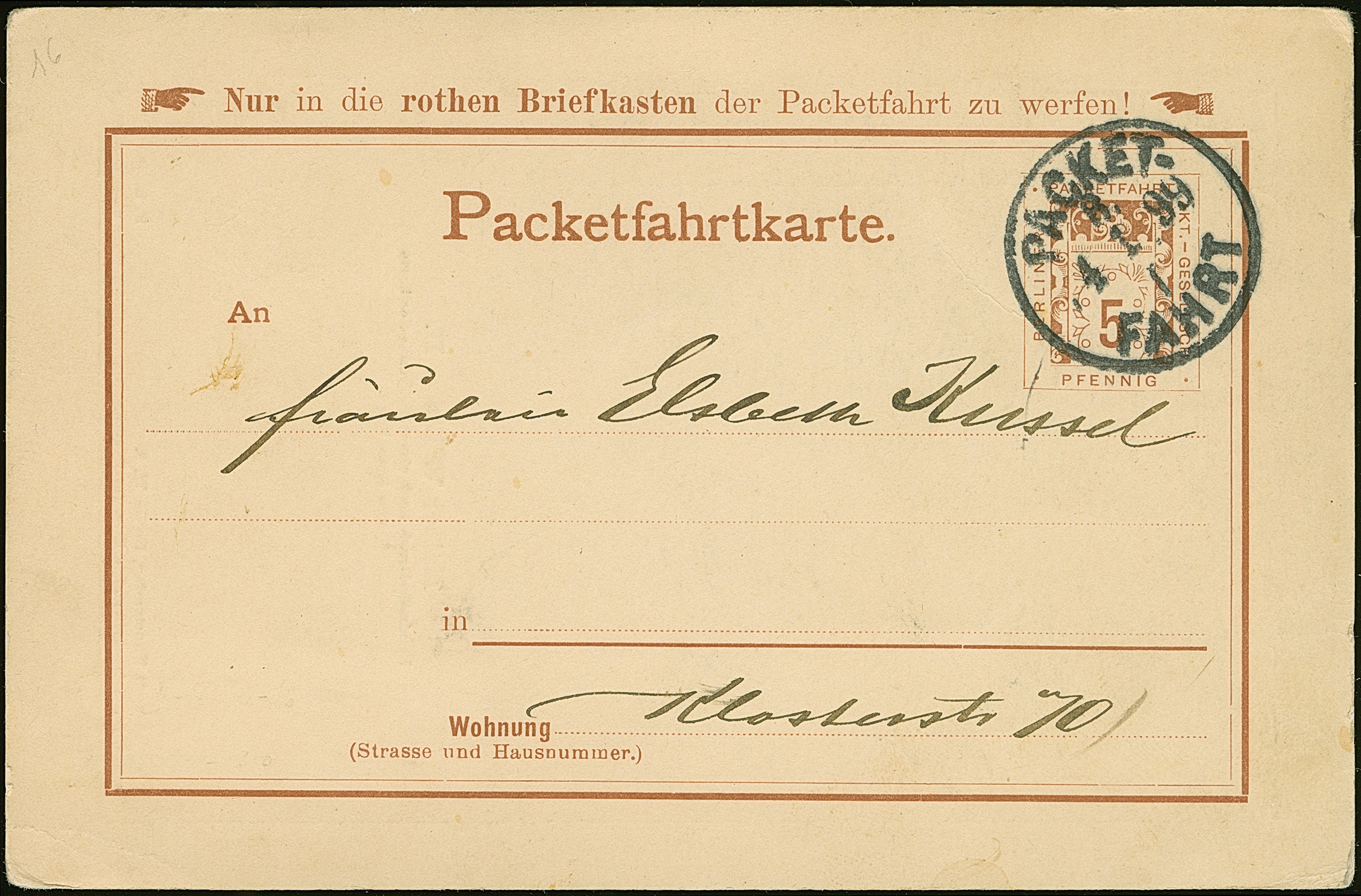 Berliner Packetfahrt-Gesellschaft: 1899, Ganzsachenkarte 5 Pfg. mit rückseitigem Bild “Kaiser Wilhelm II.” (Bild No. 46) gebraucht mit Stempel “PACKET FAHRT 4.1.99”. Die Karte mit kleinen Randspuren bzw. Eckbug, ansonsten in guter Erhaltung. Gebrauchte Karten sind selten