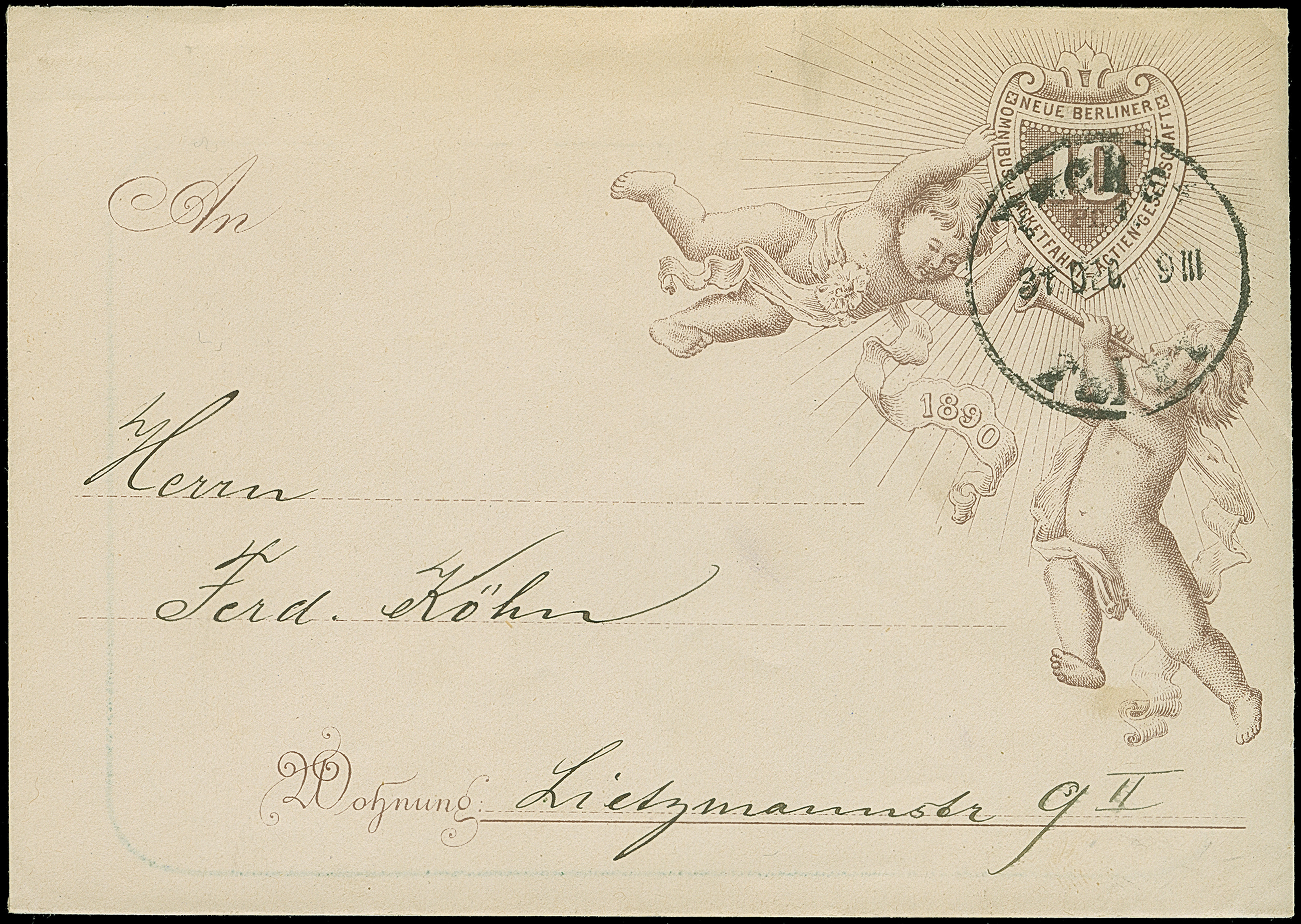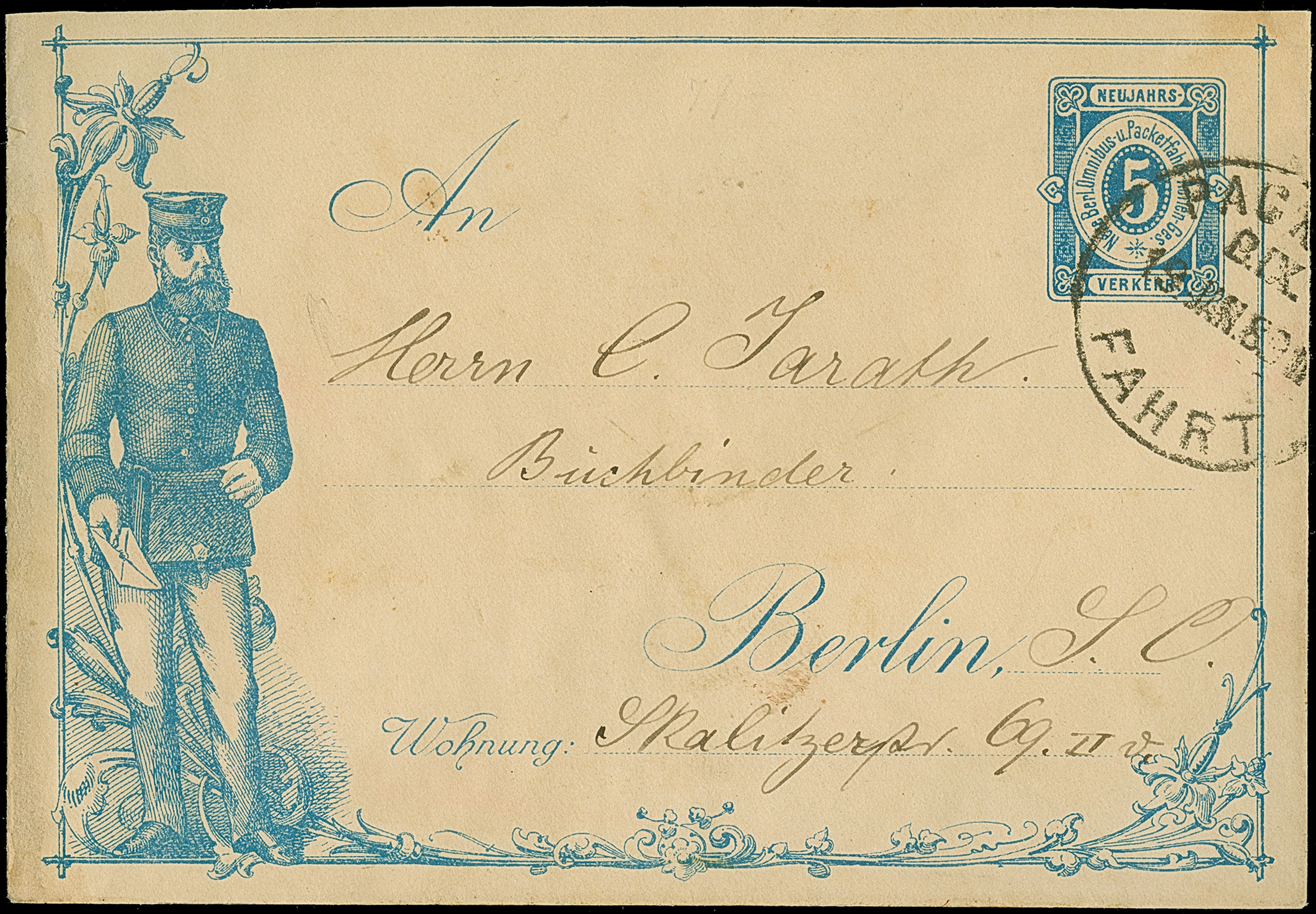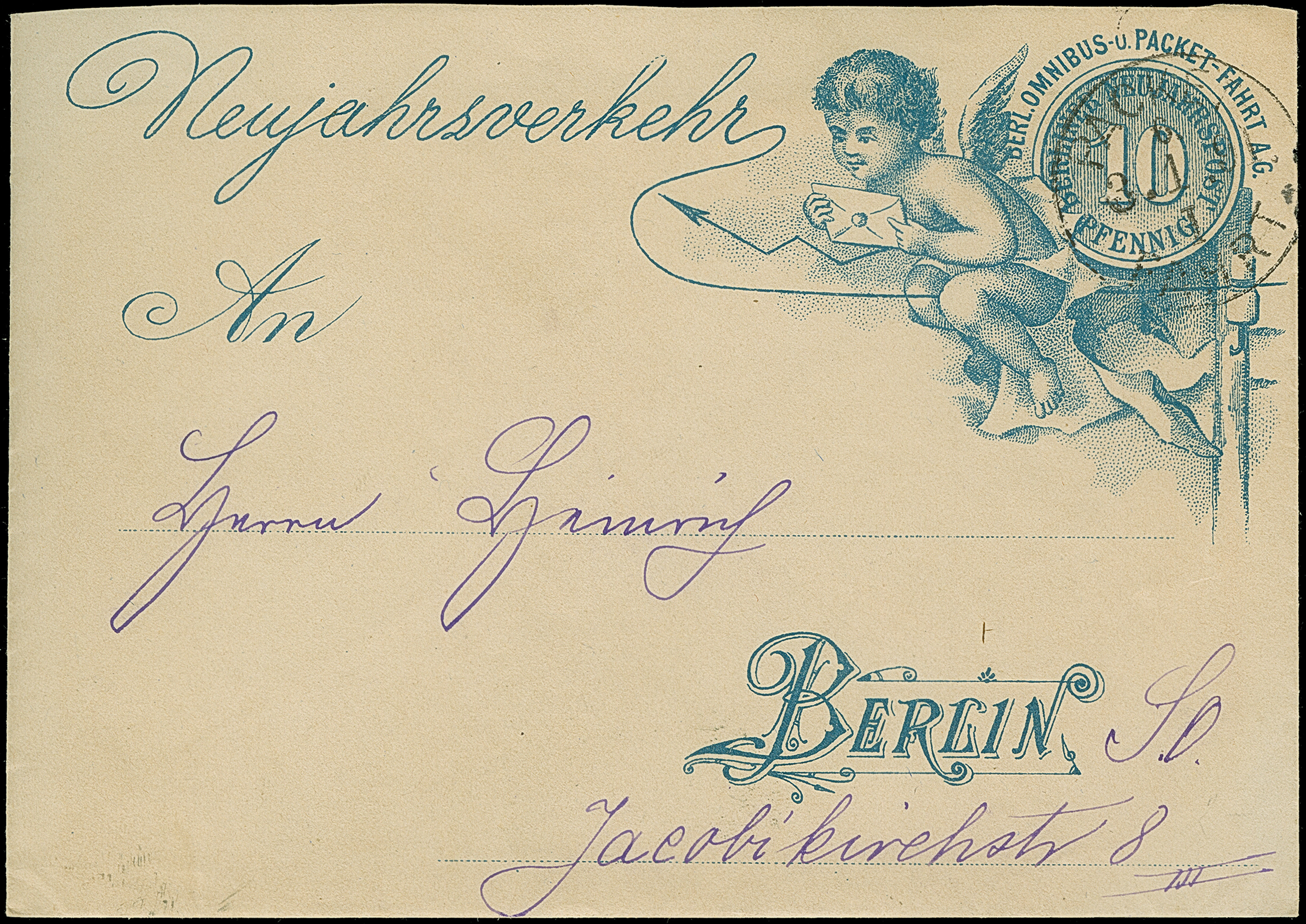 Berliner Packetfahrt-Gesellschaft: 1890, Ganzsachen-Glückwunschumschlag 10 Pfg. blau mit Einlage “Page mit Speer und Friedensengel” gebraucht mit Stempel “PAKET FAHRT 3.1.91”. Der Umschlag rückseitig mit kleinem Einriss, ansonsten in guter Erhaltung