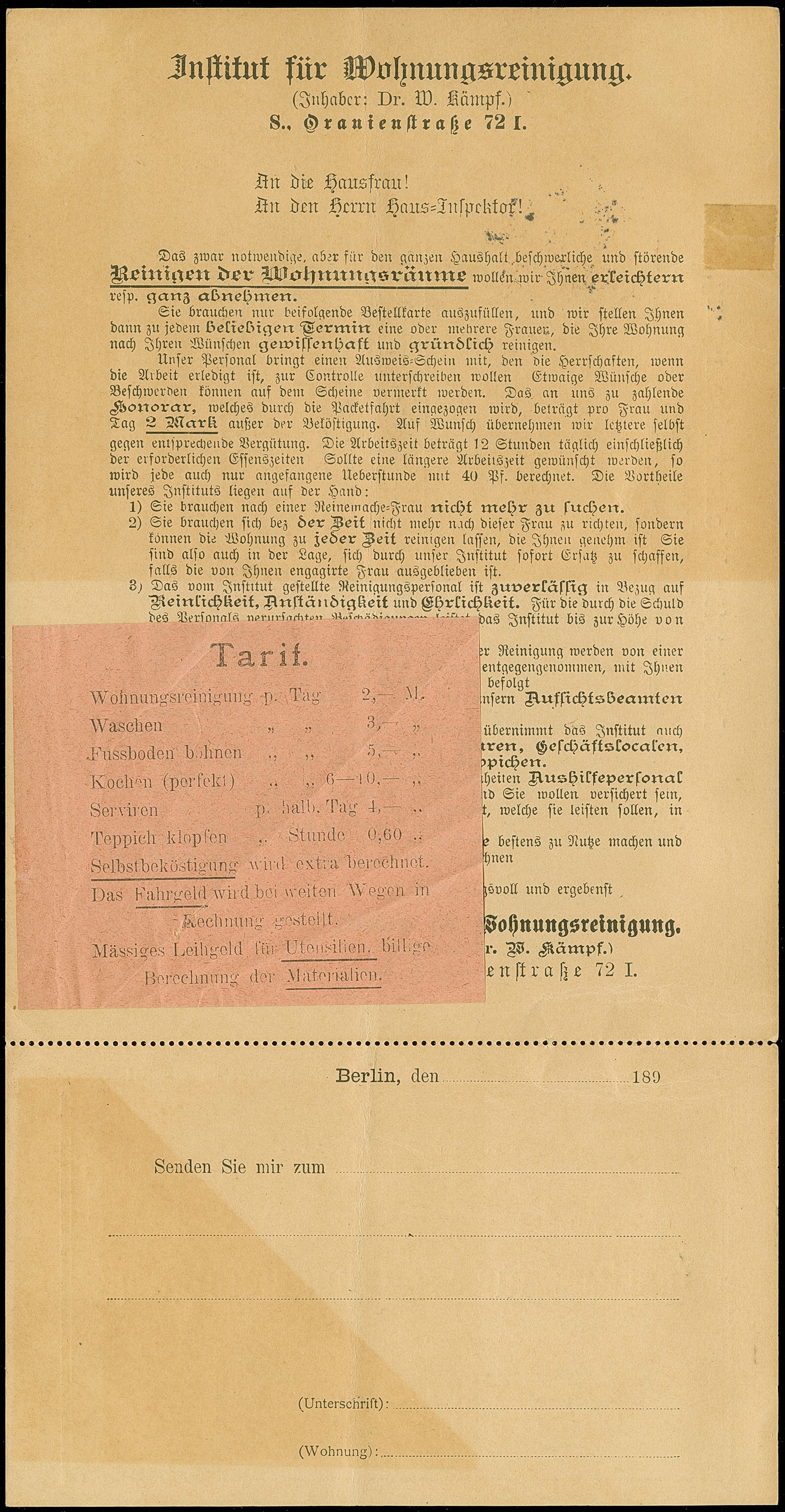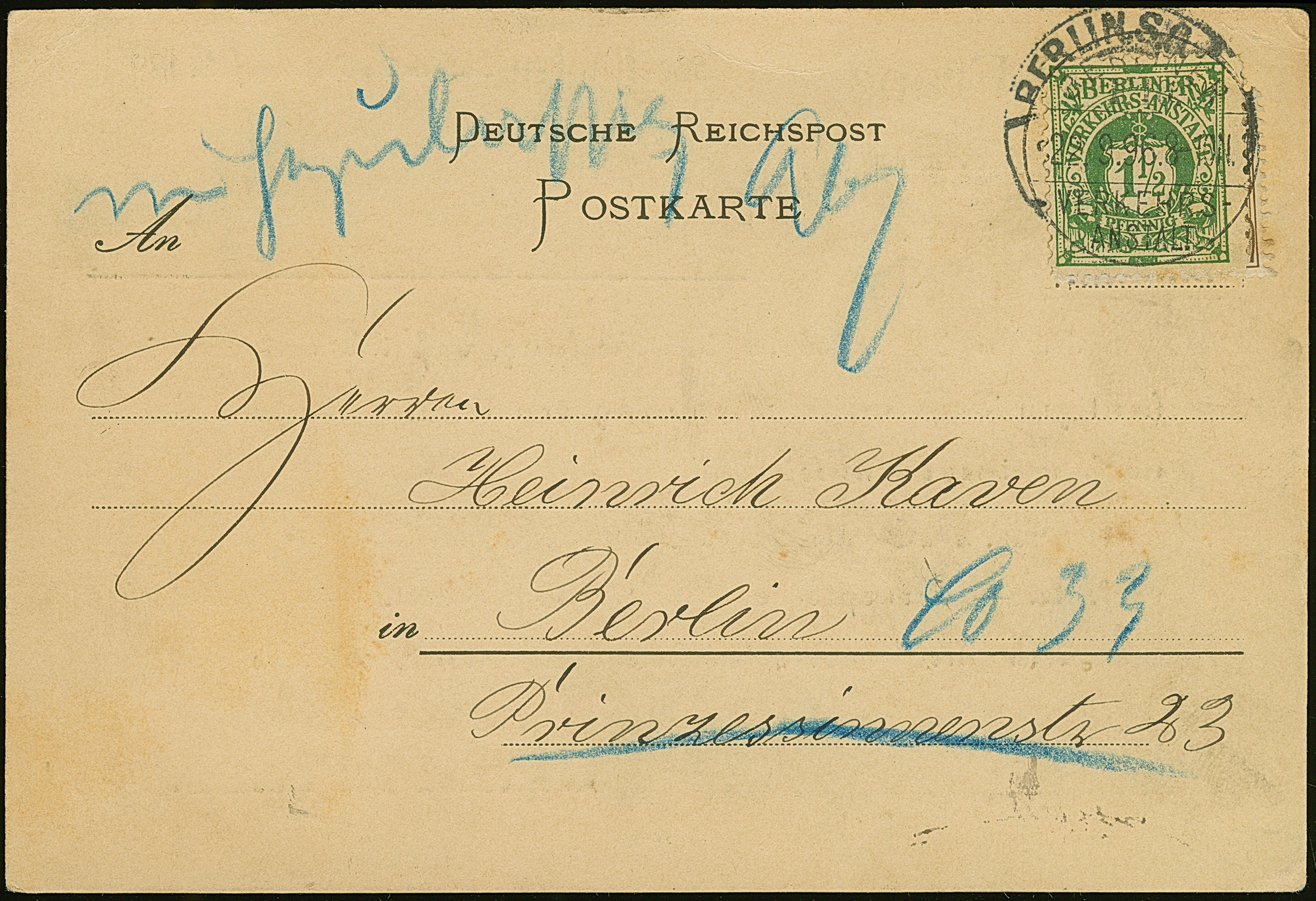 Berliner-Verkehrs-Anstalt: 1896, 1½ Pf.g grün mit Stempel “BERLINER-VERKEHRS-ANSTALT 22.9.96” überklebt auf Deutsches Reich Krone/Adler 3 Pfg, mit Stempel “BERLIN S.O….” auf Drucksachenkarte mit Nachsendung innerhalb von Berlin mit entsprechendem Vermerken. Eine ungewöhnliche “Doppelfrankatur”