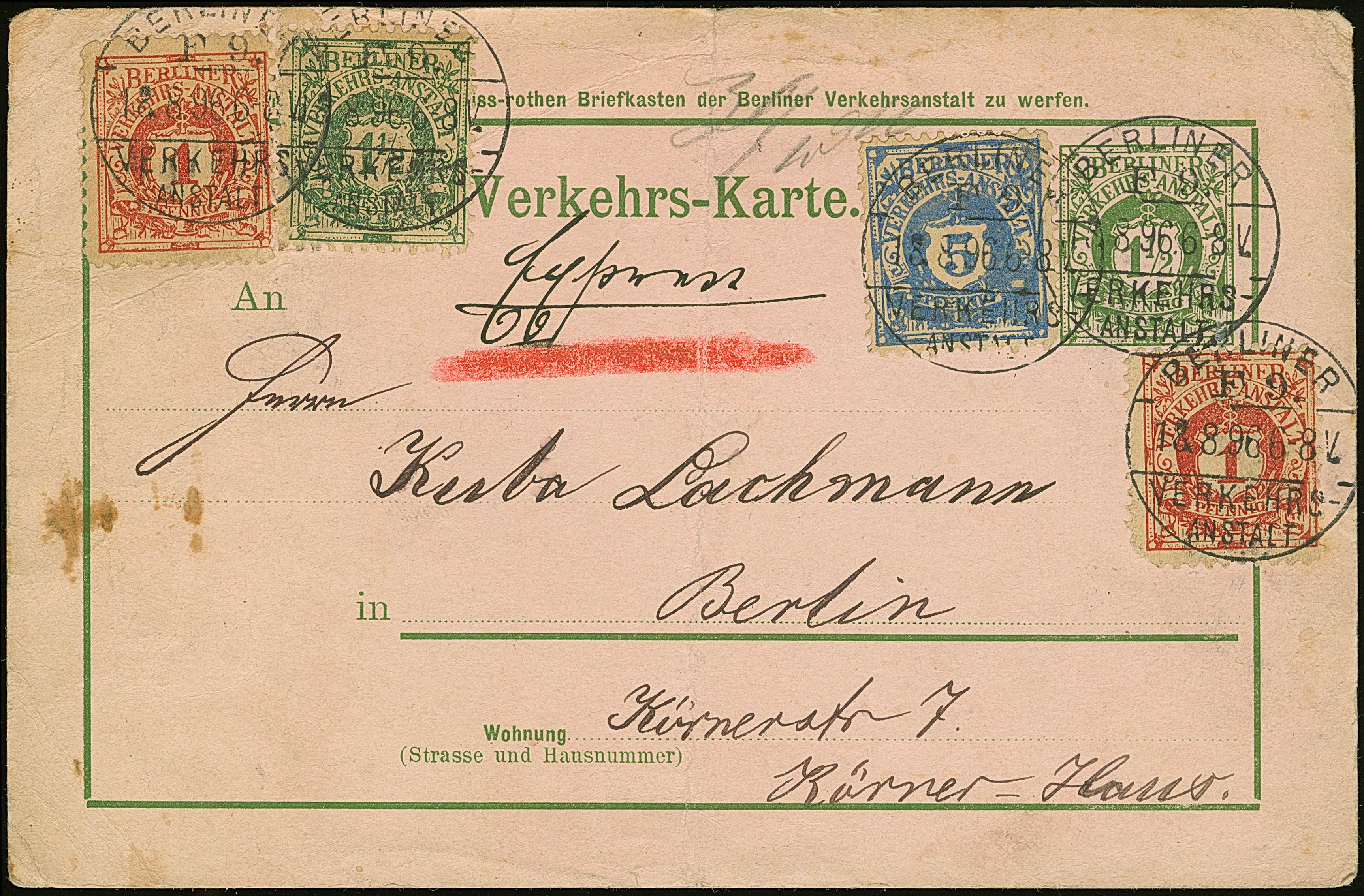 Berliner-Verkehrs-Anstalt: 1896, 5 Pfg. ultramarin, 1½ Pfg. grün und zwei Einzelmarken 1 Pfg. rot jeweils mit Stempel “BERLINER VERKEHRS-ANSTALT F.9. 18.8.96” als Zufrankatur auf Ganzsachenkarte 1½ Pfg. als Eilboten-Ortskarte mit Text. Die Karte mit senkrechter Faltung und stärkeren Beförderungsspuren, zum Teil auch die Marken mit Bugspuren bzw. Zahnfehlern. Trotz der Einschränkungen eine außergewöhnlich seltene Verwendung, in dieser Art hat ProFi keine weitere Eilboten-Karte registriert