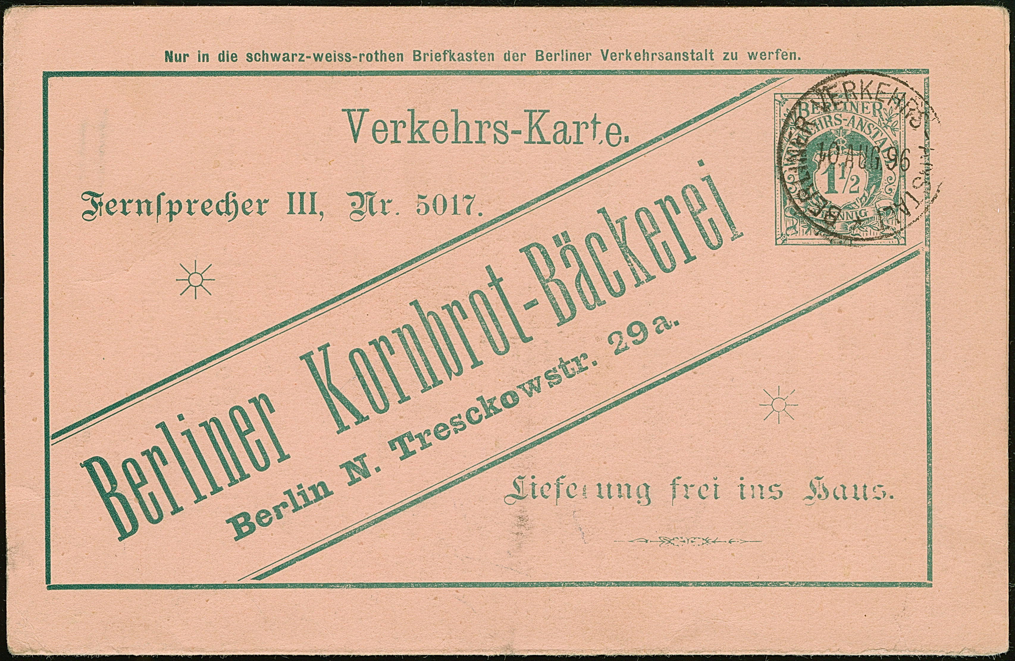 Berliner-Verkehrs-Anstalt: 1896, Ganzsachen-Doppelkarte auf Privat-Bestellung 1½ Pfg. “Berliner Kornbrot-Bäckerrei” mit Stempel “BERLINER VERKEHRS-ANSTALT 10.AUG.96”, Antwortteil anhängend ungebraucht, in guter Erhaltung, selten