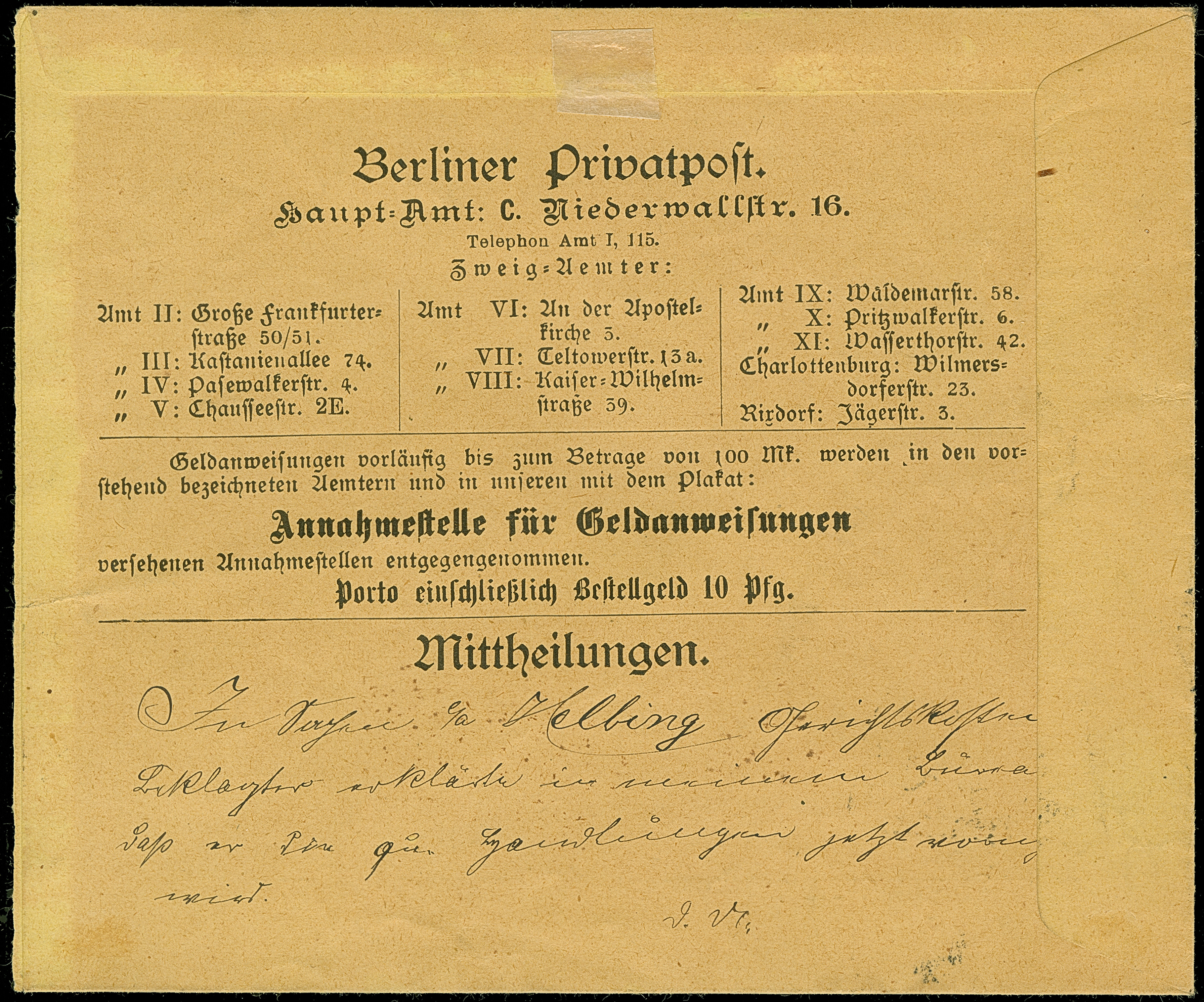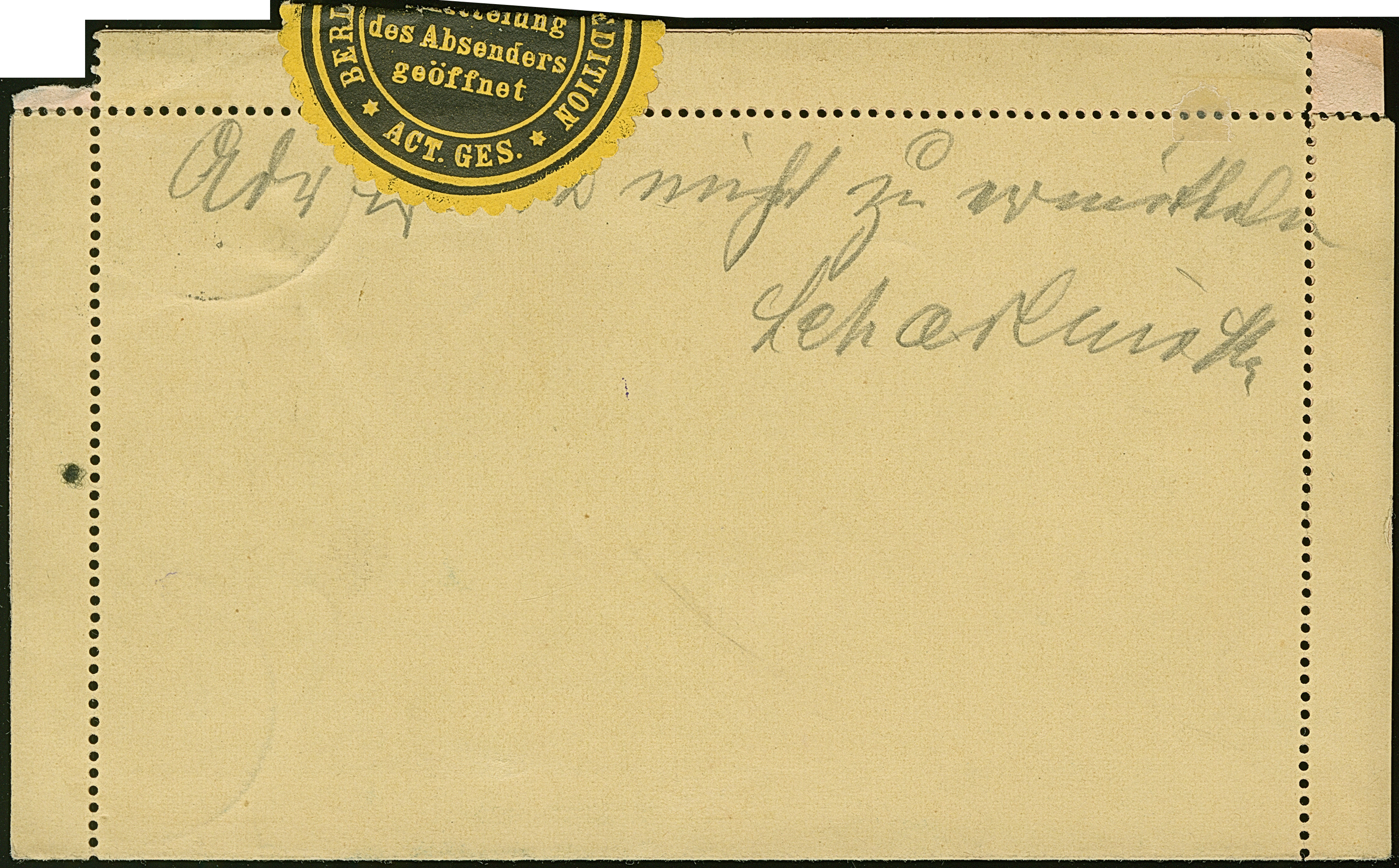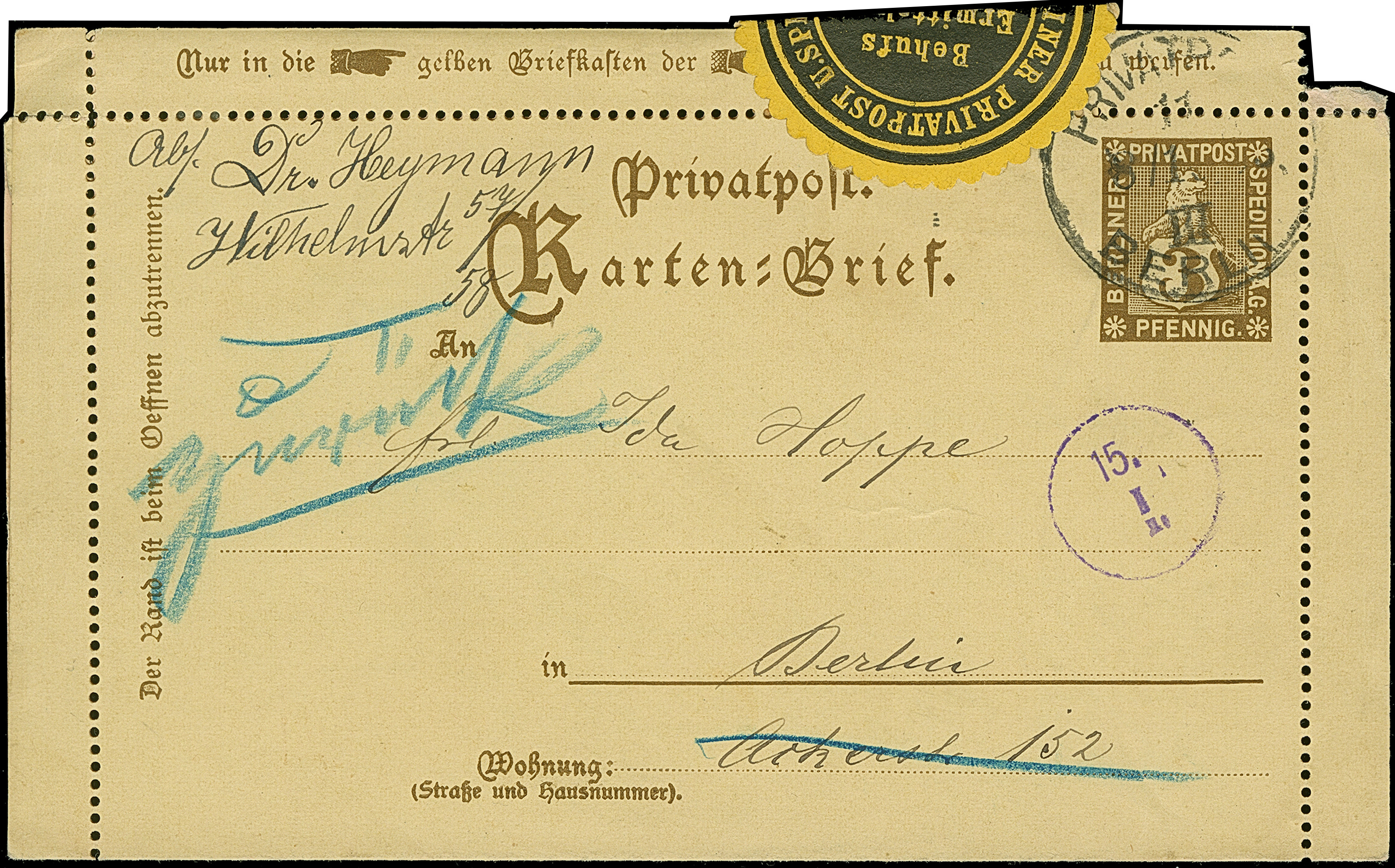 Berliner Privatpost und Spedition A.G.: 1895, Ganzsachen-Kartenbrief 3 Pfg. mit Stempel “PRIVATPOST BERLIN 8.10.96” und Text und retour mit entsprechendem Vermerken sowie Verschlussmarke “BERLINER PRIVATPOST U. SPEDITION Behufs Ermittlung des Absenders geöffnet” mit handschriftlicher Angabe des Absenders. Der Kartenbrief wurde nicht wieder geöffnet, die Verschlussmarke ist dadurch nicht durchtrennt worden, in guter Gesamterhaltung