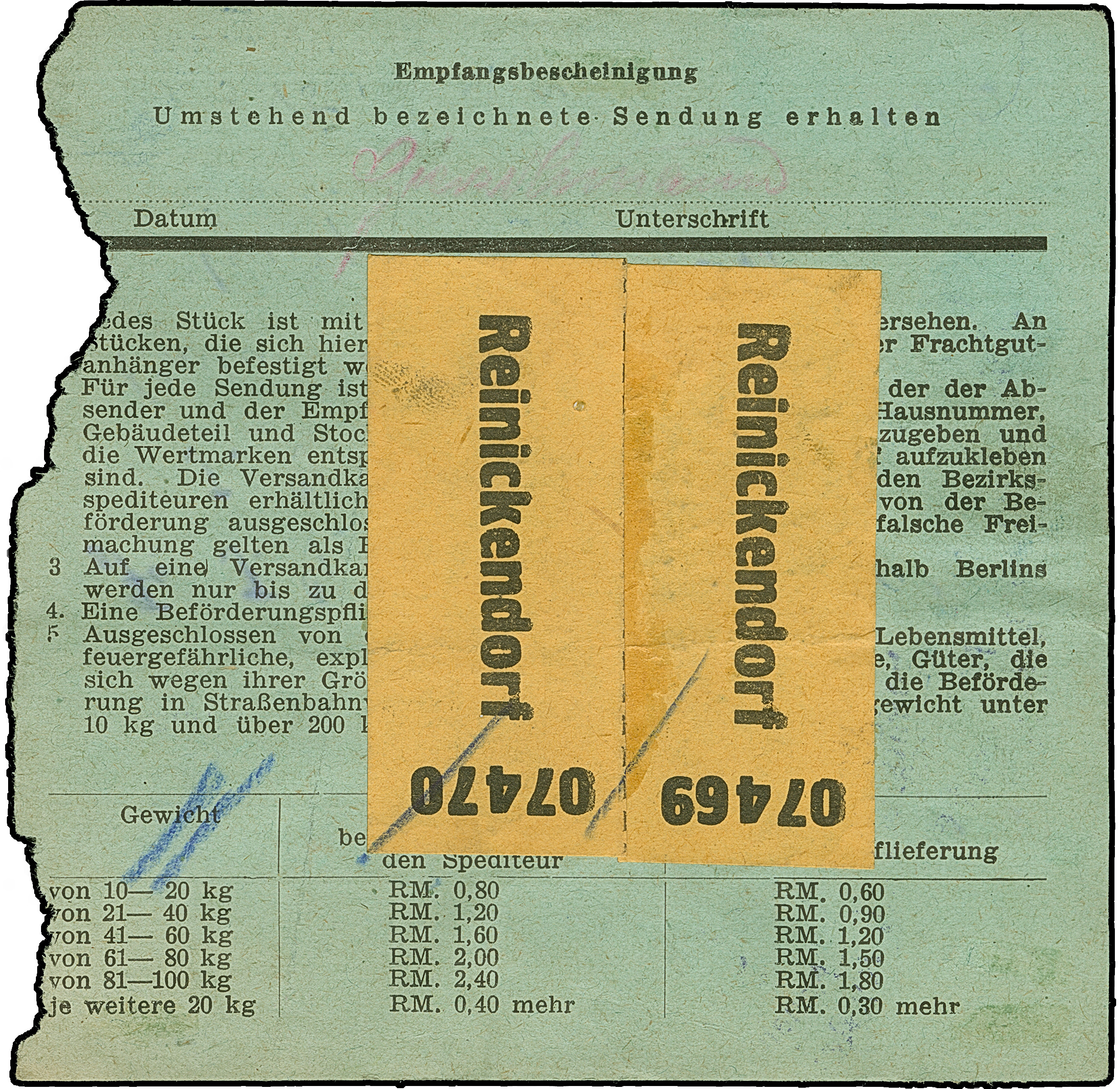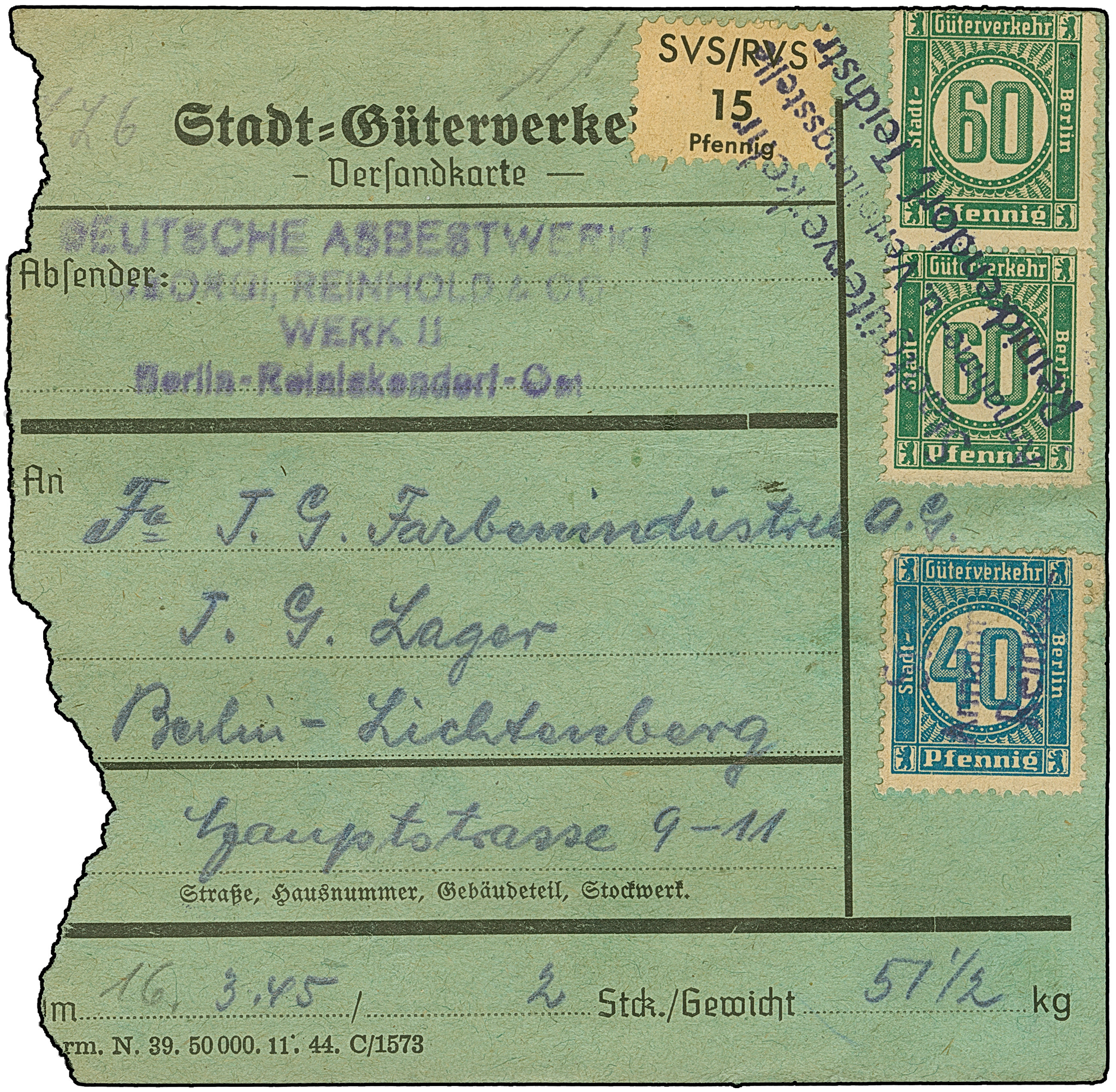 Stadt-Güter-Verkehr Berlin: 1944,60 Pfg. dunkelgrün im senkrechten Paar und 40 Pfg. hellblau sowie Versicherungsmarke 15 Pfg. mit violettem L3 “Stadt-Güterverkehr Annahme und Verteilung Reinickendorf, Teichstr.” auf Paketkarte für 2 Pakete nach Berlin-Lichtenberg, Einlieferung datiert vom 16.3.45. Die Marken sind in einwandfreier Erhaltung, Das Formular mit leichter senkrechter Faltung und links mit kleinen Fehlstellen