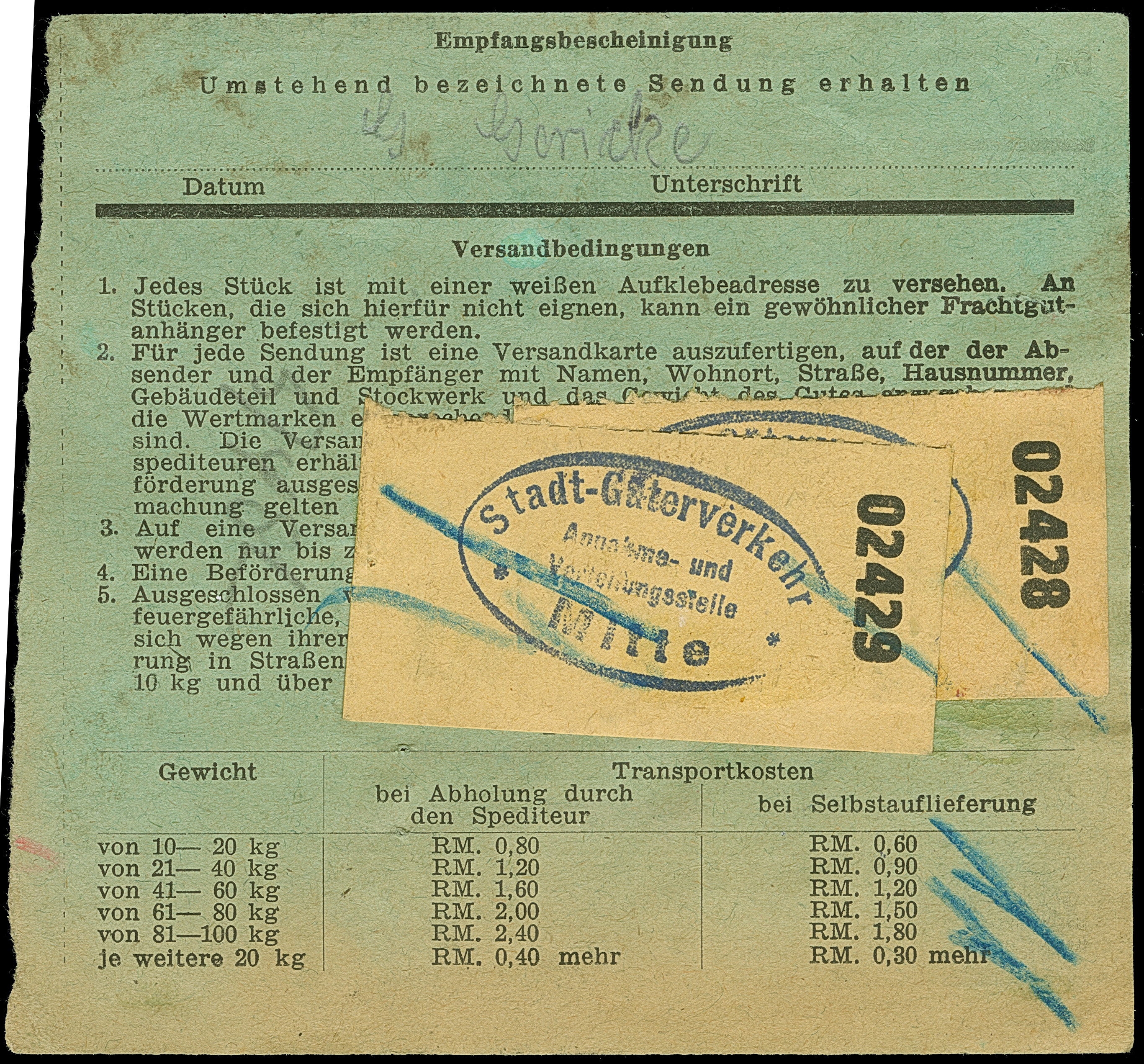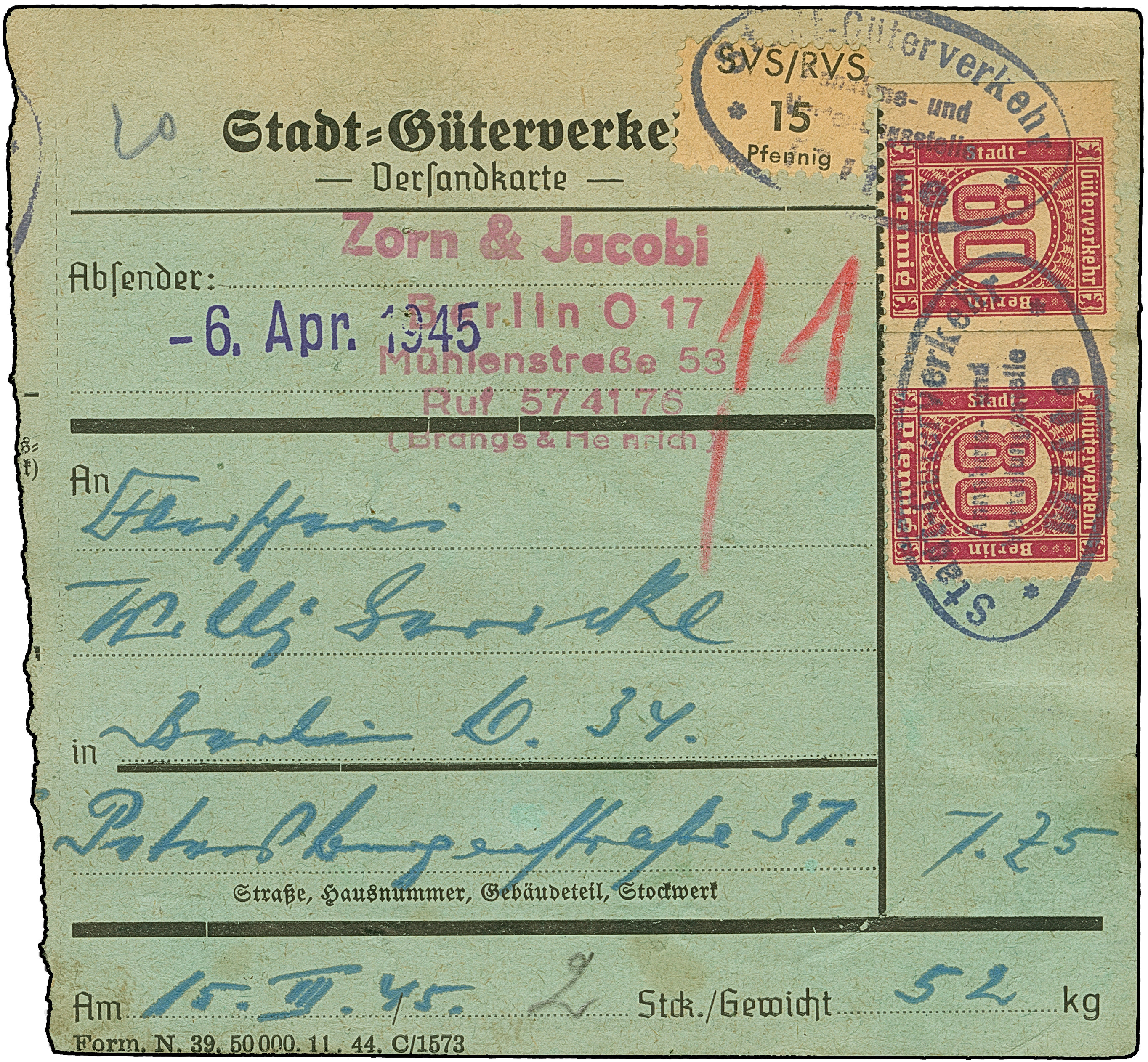 Stadt-Güter-Verkehr Berlin: 1944, 80 Pfg. rotlila, zwei Einzelmarken und Versicherungsmarke 15 Pfg. mit violettem Ovalstempel “Stadt-Güterverkehr Annahme- und Verteilungstelle Mitte" auf Paketkarte für 2 Pakete nach Berlin O34 mit Datums-L1 “6.April.1945” von der Zustellung. Die Marken sind in einwandfreier Erhaltung, das Formular unterhalb der Frankatur mit Einriss. Eine seltene Mehrfachfrankatur der 80 Pfg.-Wertstufe