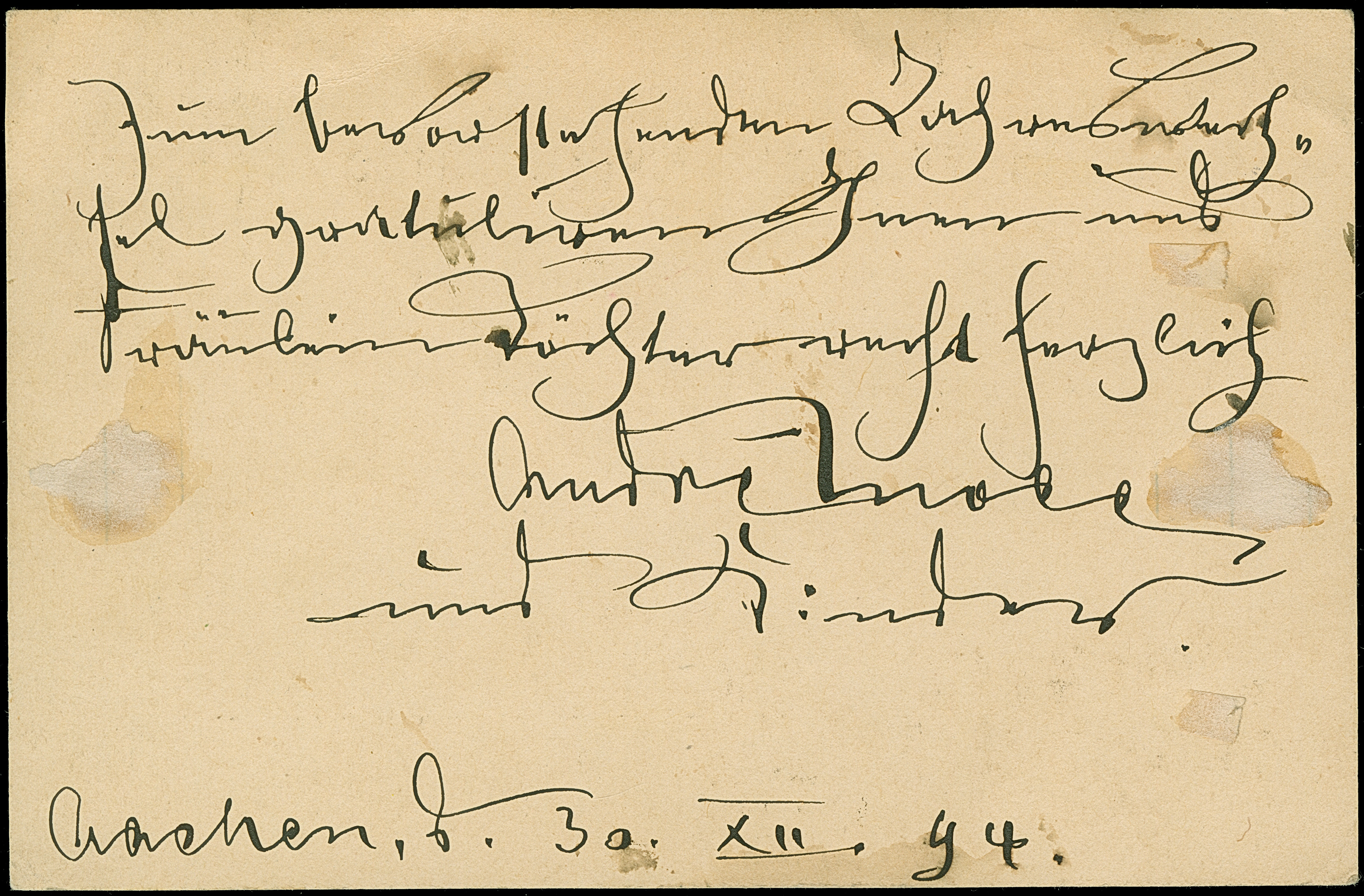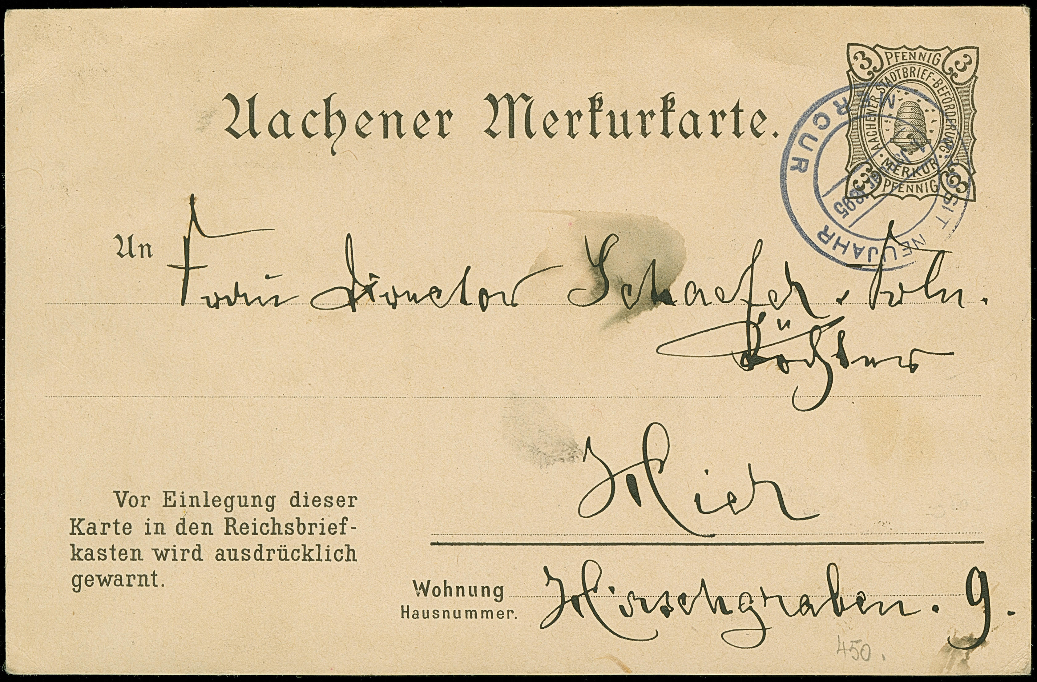 Aachen-Merkur: 1895, Ganzsachenkarte 3 Pfg. schwarz mit violettem Stempel “PROSIT NEUJAHR AACHEN 1.JAN.1895” und Text mit Datierung “Aachen, 30.12.94”. Die Karte hat einen kleinen Eckbug und einen Wasserfleck, ansonsten in guter Erhaltung, sehr selten