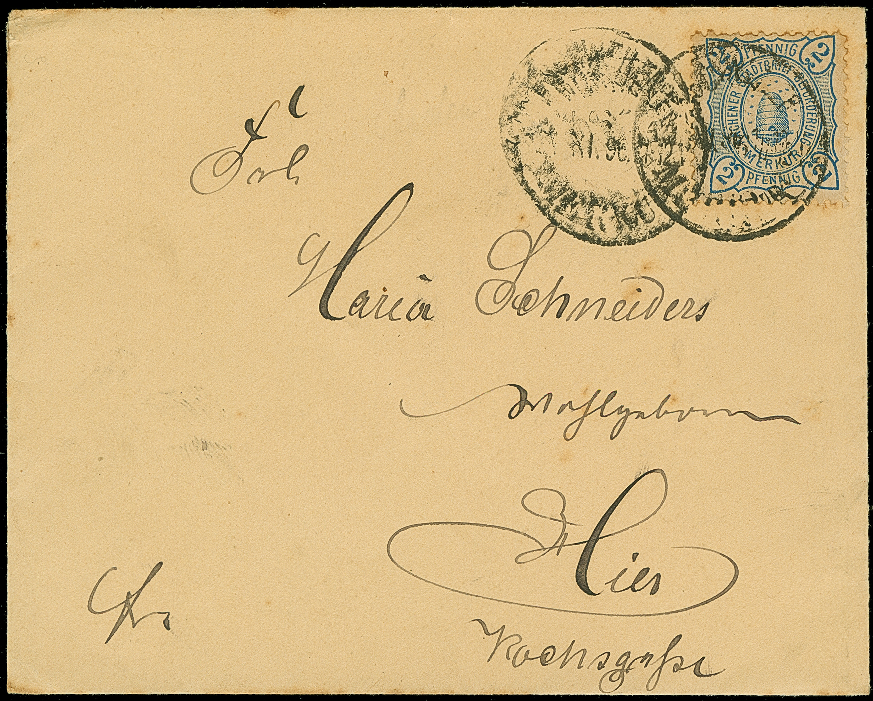 Aachen-Merkur: 1894, Bienenkorb 2 Pfg. blau mit etwas verwischtem Stempel “MERKUR AACHEN 21.XI.96” auf Drucksachen-Umschlag. In der Zähnung der Marke mit Gelbflecken, ansonsten in guter Erhaltung. Eine seltene Verwendung
