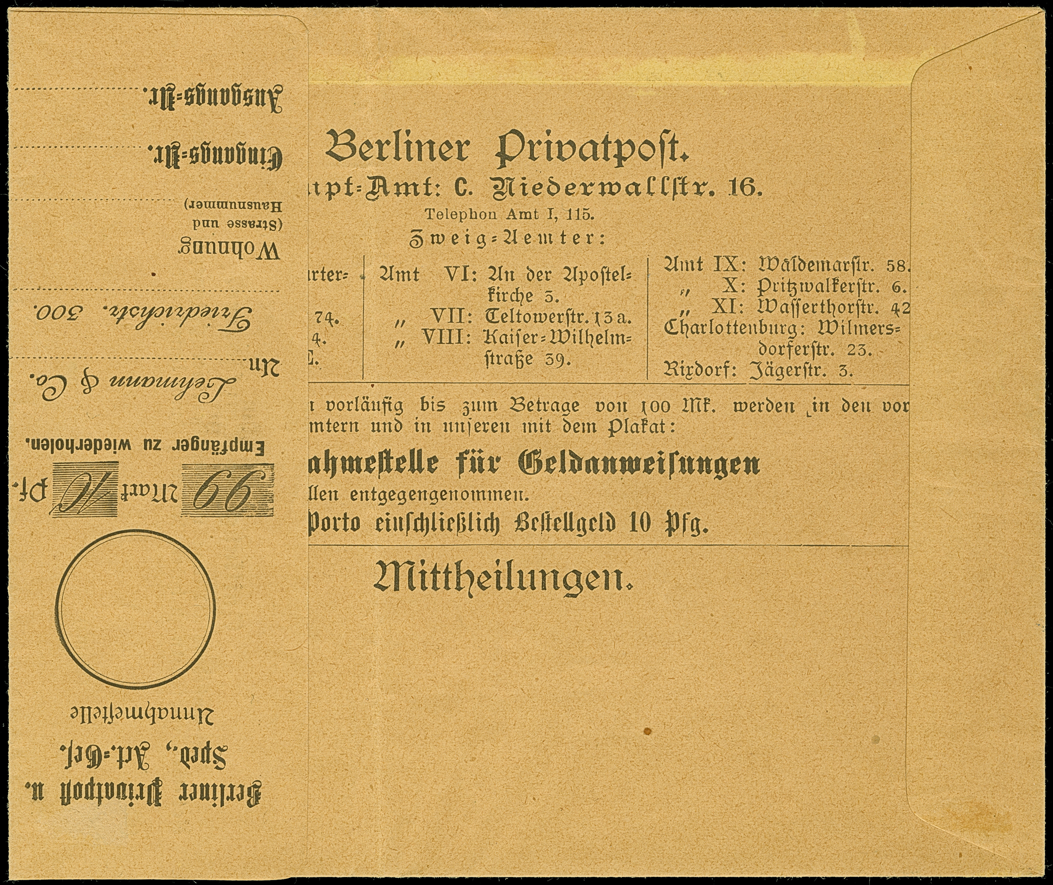 Berliner Privat-Postpost und Spedition AG: 1896, Ganzsachen-Umschlag “Geld-Anweisungs-Couvert” 10 Pfg. der Firma Müller & Co., ungebraucht, Umschlag mit senkrechter Faltung, ansonsten in guter Erhaltung