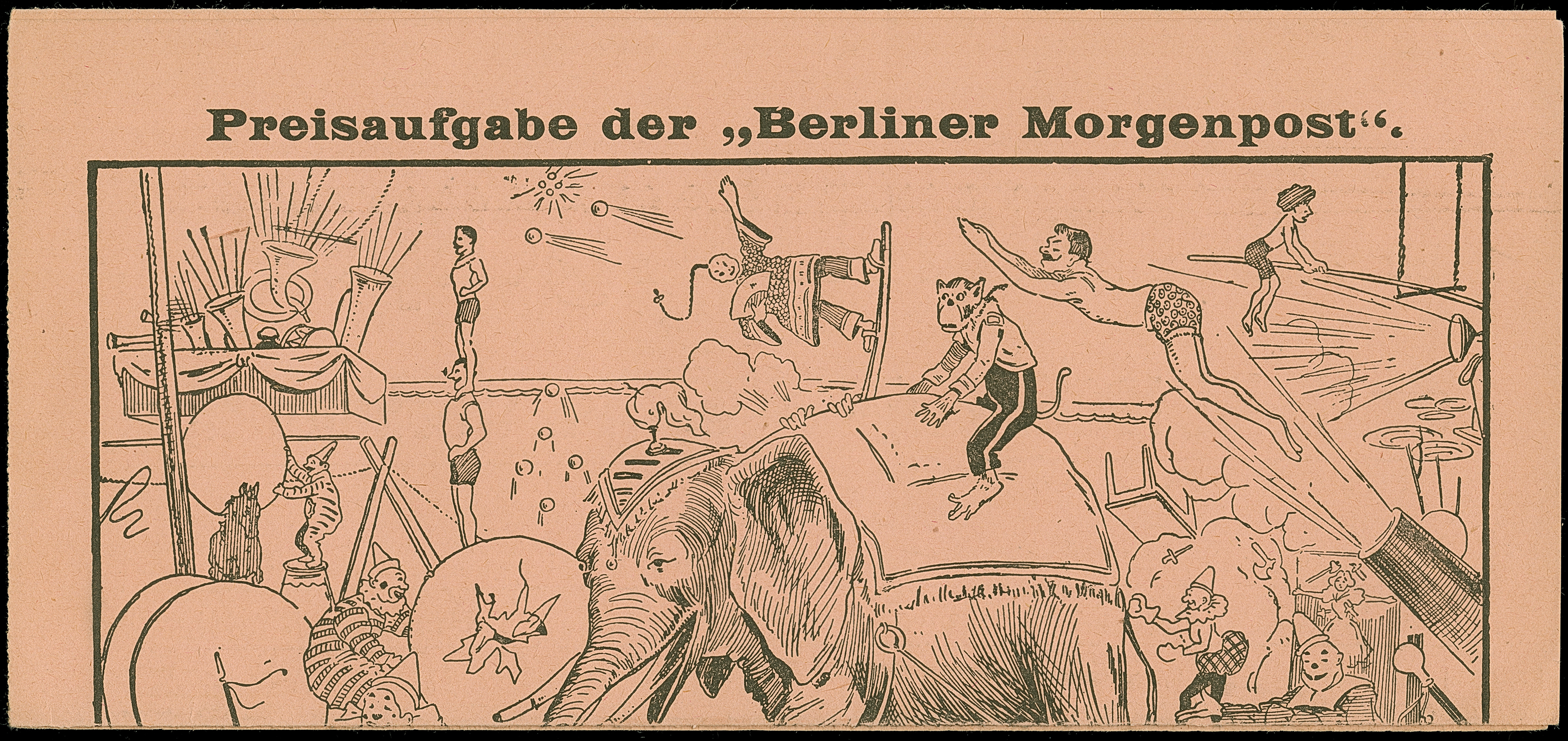 Berliner Packetfahrt-Gesellschaft: 1900 (ca.), Ganzsachenkarte auf Privat-Bestellung 2 Pfg. schwarz auf lachsfarben als Teil eines kompletten Werbeblattes der “Berliner Morgenpost” mit u.a. rückseitiger Abbildung einer Zirkus-Landschaft inkl. eines Elefanten. Das Werbeblatt wurde dreiteilig vorgefaltet und ist in einwandfreier Erhaltung. In dieser Form selten