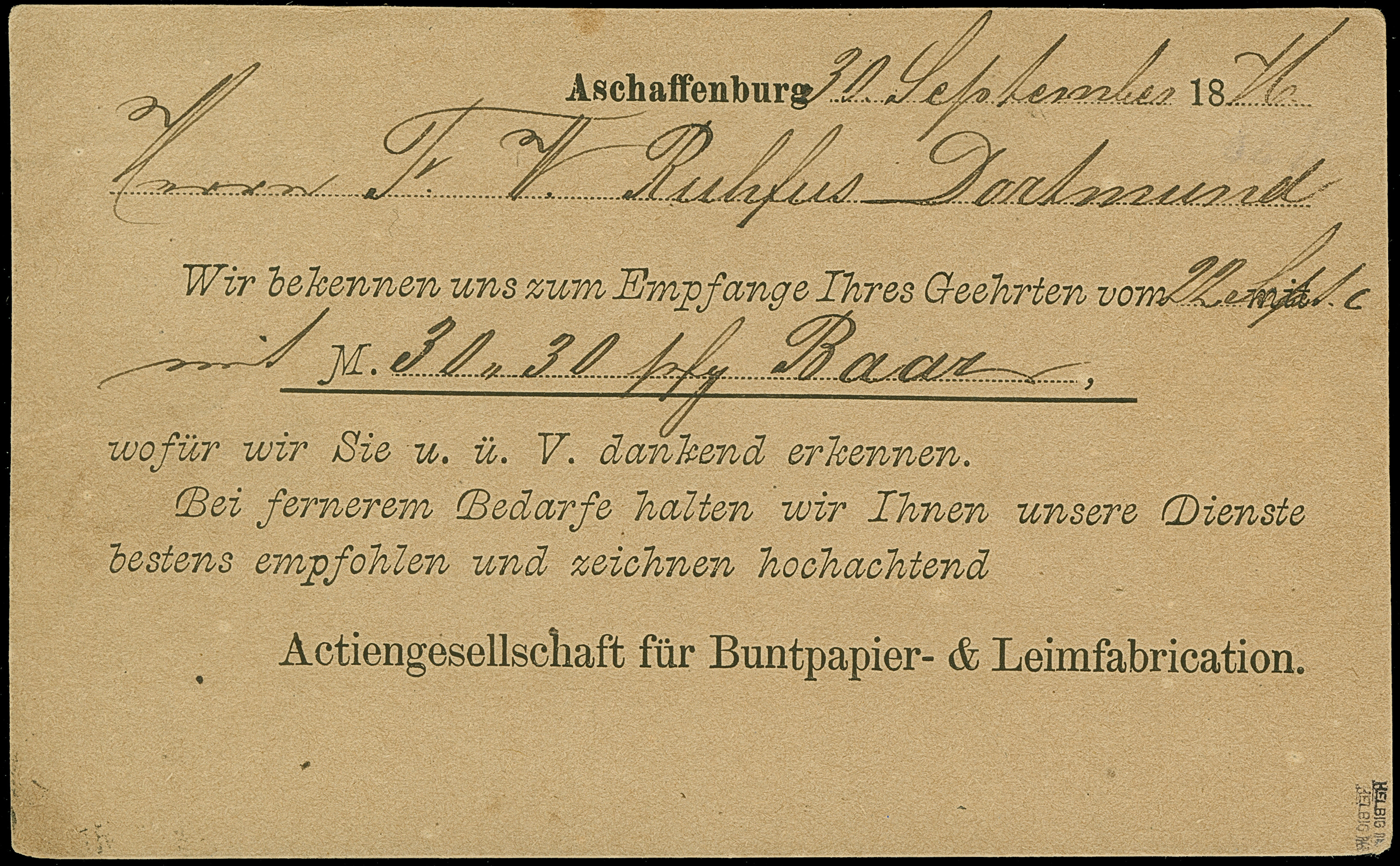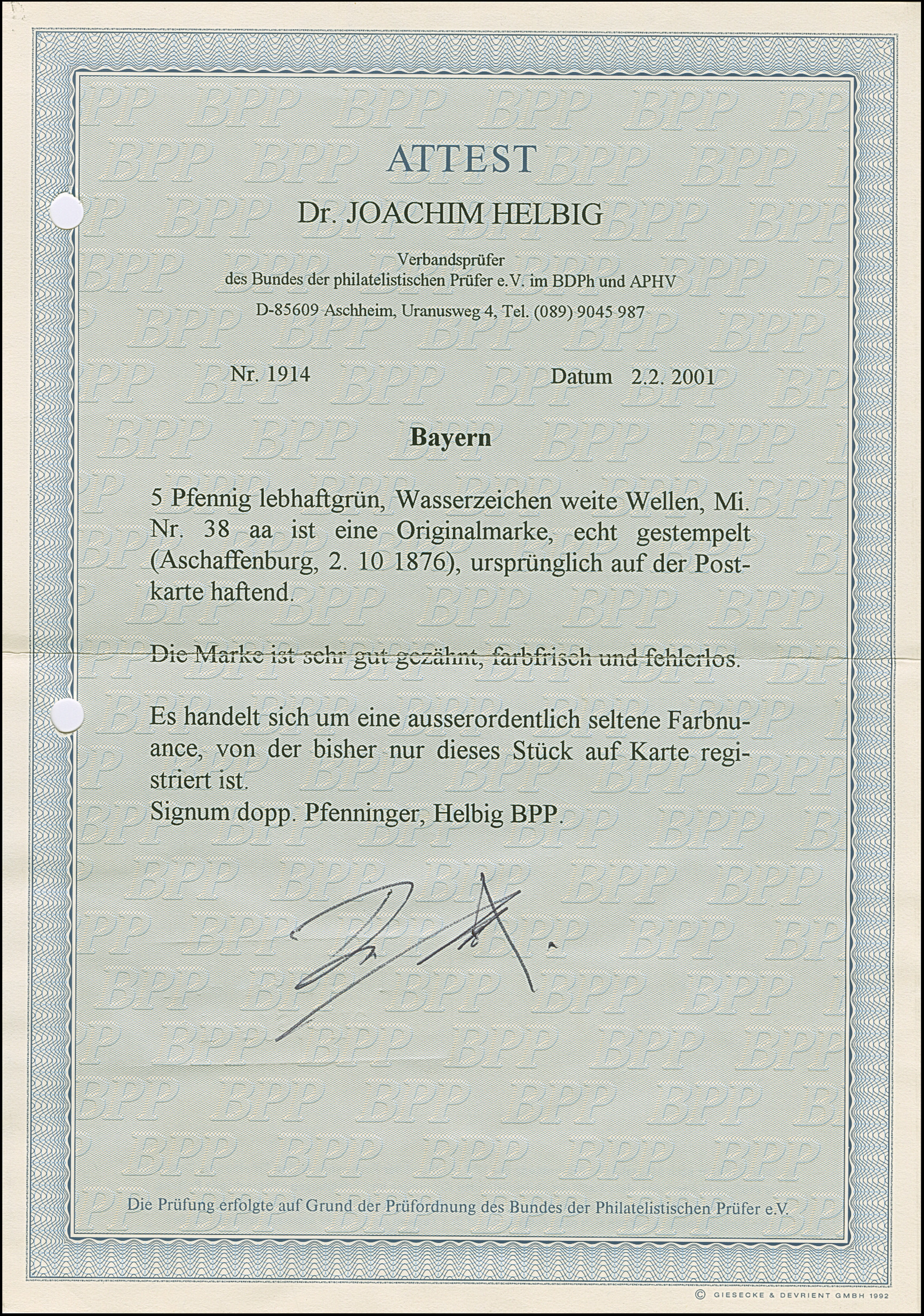 1876/81, 5 Pfg. lebhaftgrün, farbfrisch und allseits sehr gut gezähnt mit klarem EKr. “ASCHAFFENBURG2.10.(76)” als tarifgerechte Einzelfrankatur auf privat gedruckter Postkarte der “Actiengesselschaft für Bundpapier- & Leimfabrication” nach Dortmund mit Ankunftsstempel. Die Karte mit kleinen Spuren ist ansonsten wie die Marke in tadelloser Erhaltung. Bisher sind nur ganz wenige Briefe und Karten mit dieser außerordentlich seltenen Farbe bekannt, hier die einzige bisher registrierte Einzelfrankatur, jeweils doppelt sign. Pfenninger und Helbig BPP mit Fotoattest (2001)