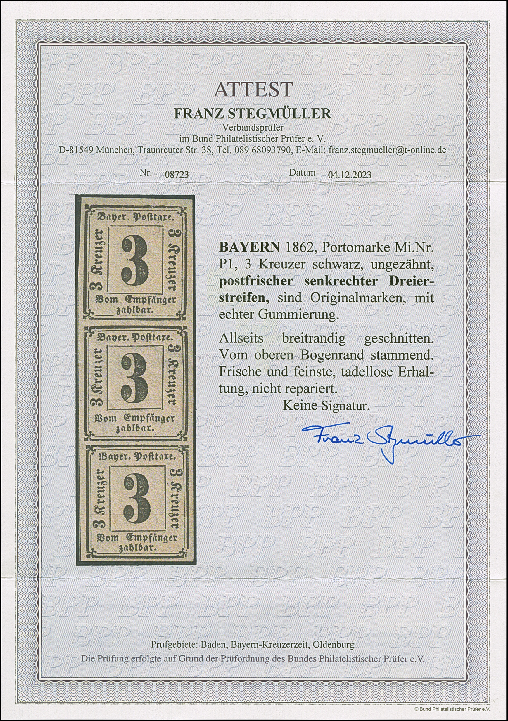 3 Kreuzer blau, farbfrisch und voll- bis meist breitrandig, unten mit doppelter Trennungslinie, leicht entwertet durch Halbkreisstempel. Tadellos. Fotobefund Stegmüller BPP (2026)