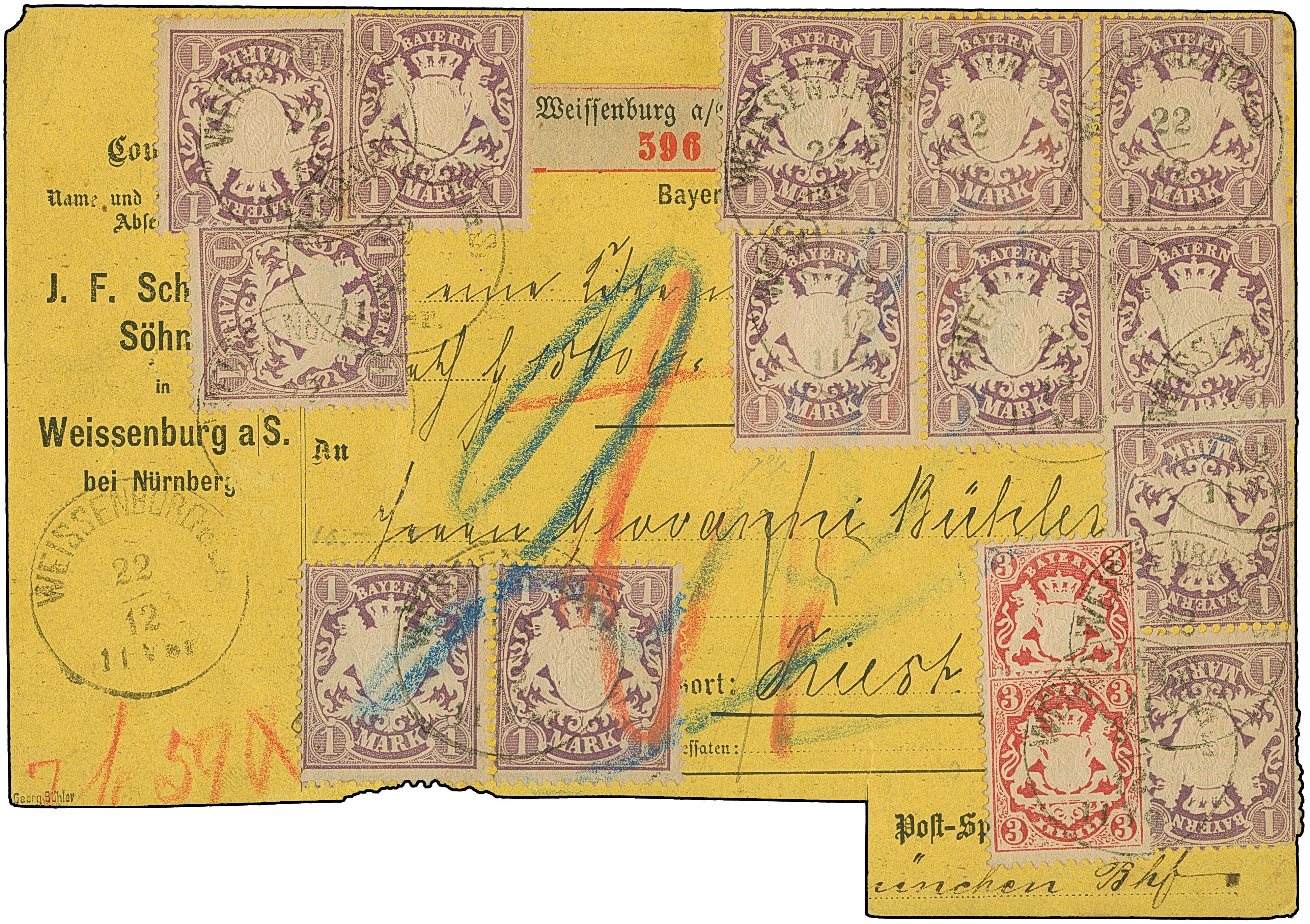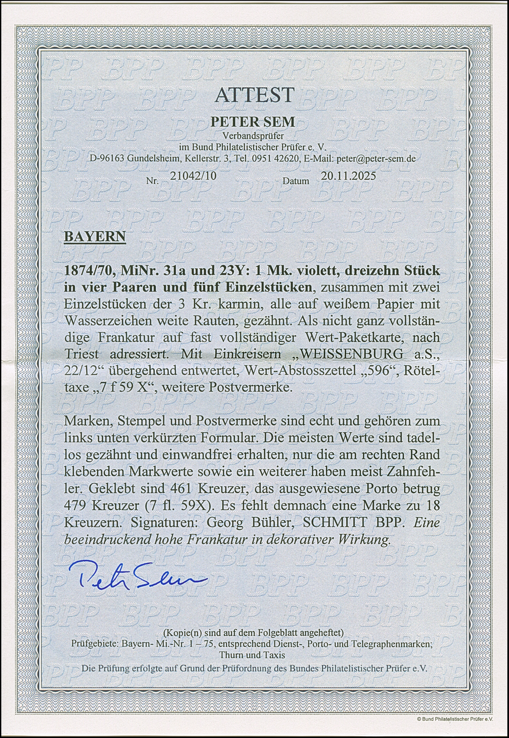 1874, 1 M. gezähnt, 4 Paare und 5 Einzelstücke, zusammen mit 2 Einzelwerten 3 Kr. rosa, mit EKr. "WEISSENBURG 22/12" auf unten nicht ganz vollständige Wert-Paketkarte nach Triest. 4 Werte der Frankatur durch Randklebung dort mehr oder weniger fehlerhaft, eine rückseitig geklebte 18 Kreuzer-Marke fehlt; nichtsdestotrotz eine beeindruckende und äußerst seltene Frankatur. Signiert Schmitt BPP, Georg Bühler mit Attest (1977) und Fotoattest Sem BPP (2025)