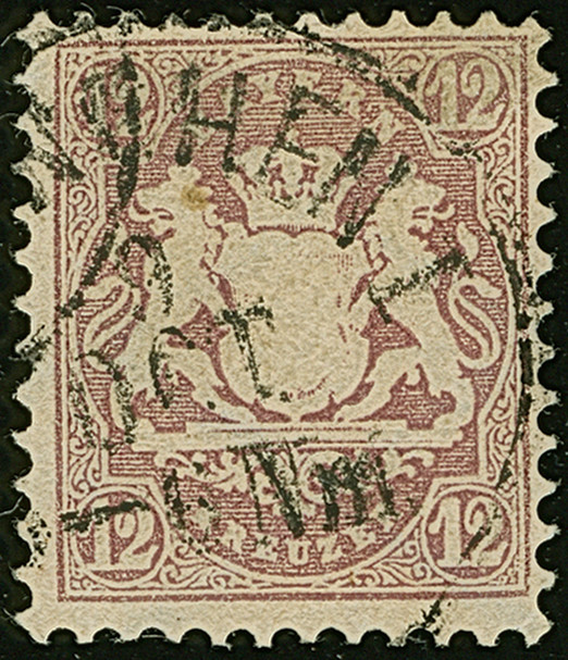 1870/75, 12 Kr. braunpurpur mit Wasserzeichen 1Y (weite Rauten), farbfrisch und allseits vollrandig gezähnt mit klarem EKr. “(MÜ)NCHEN I 9.OCT.” entwertet, in tadelloser Erhaltung. Einwandfreie Exemplare dieser Marke mit klaren Entwertungen sind außerordentlich selten, sign. Pfenninger, Thier und Fotoattest Sem BPP (2004)